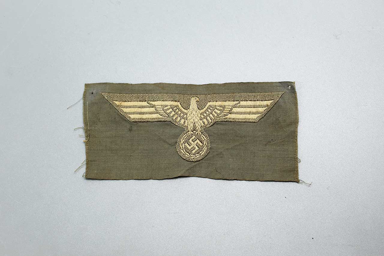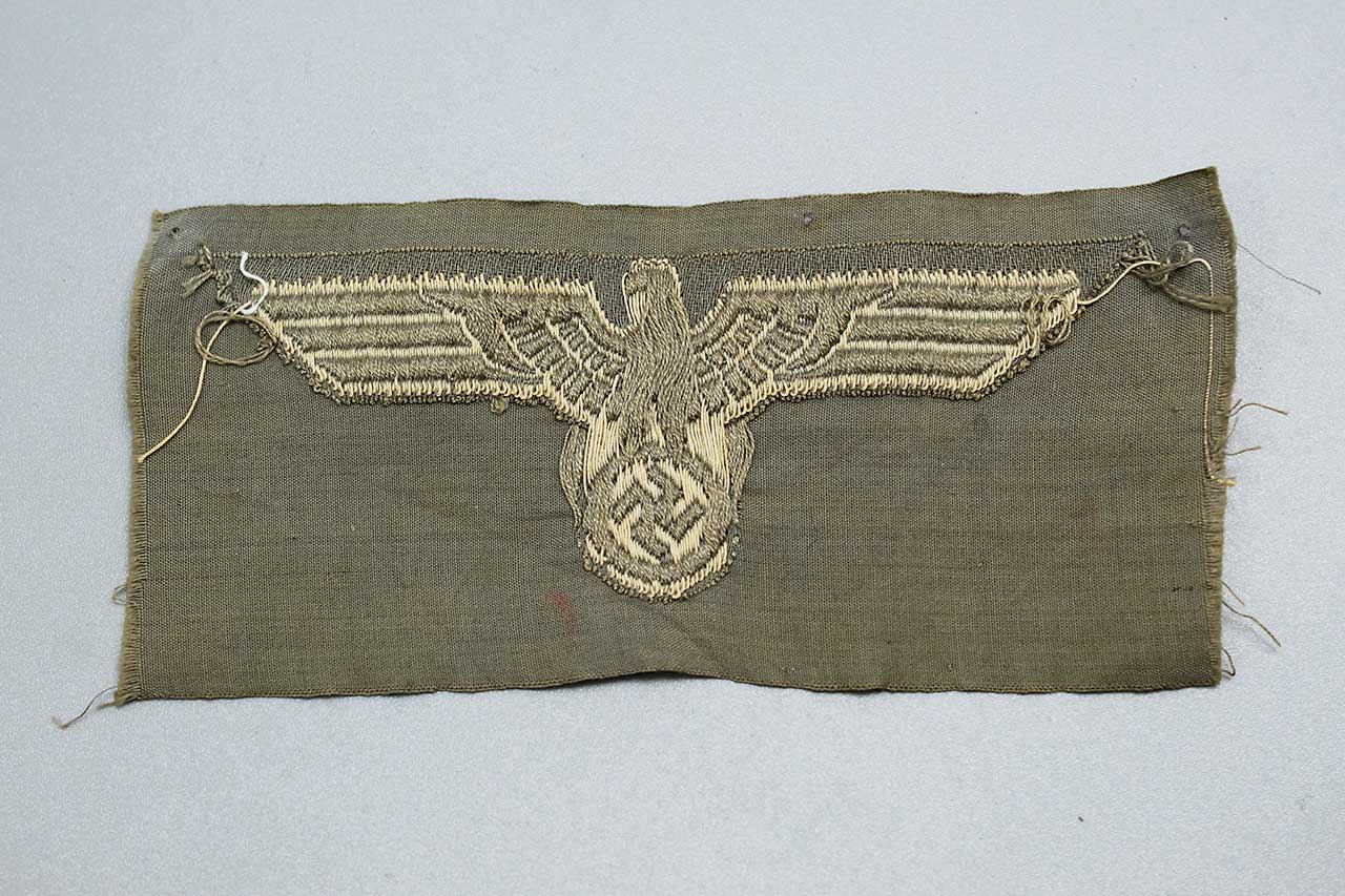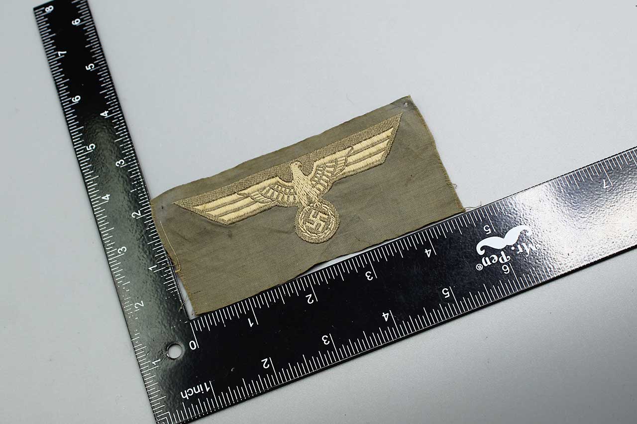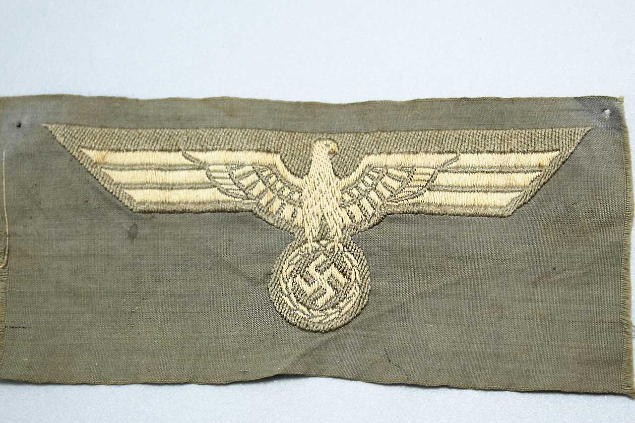 WW2 German Army M36 EM/NCO Tunic eagle. Off-white rayon thread eagle on medium-grayish rayon base. Early eagle. Un-issued cut from factory roll.