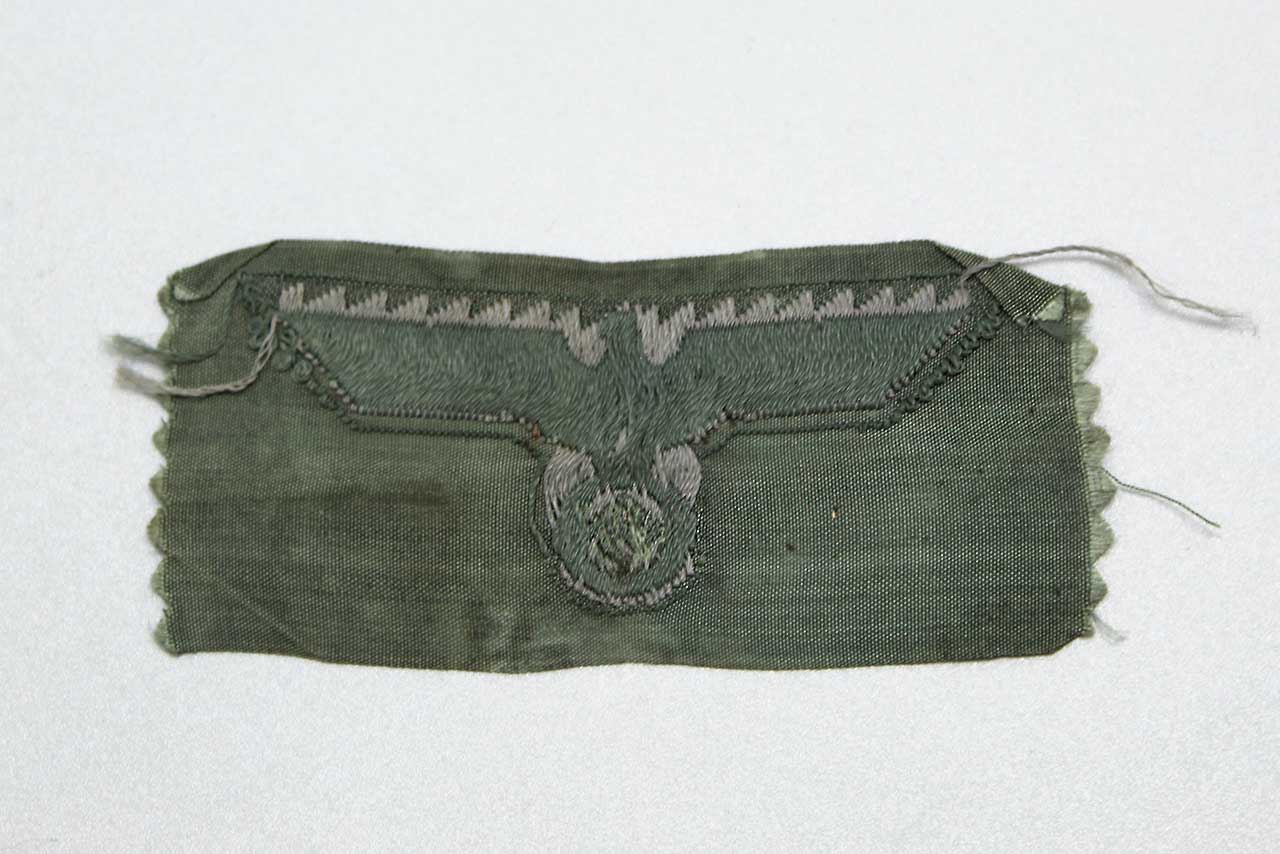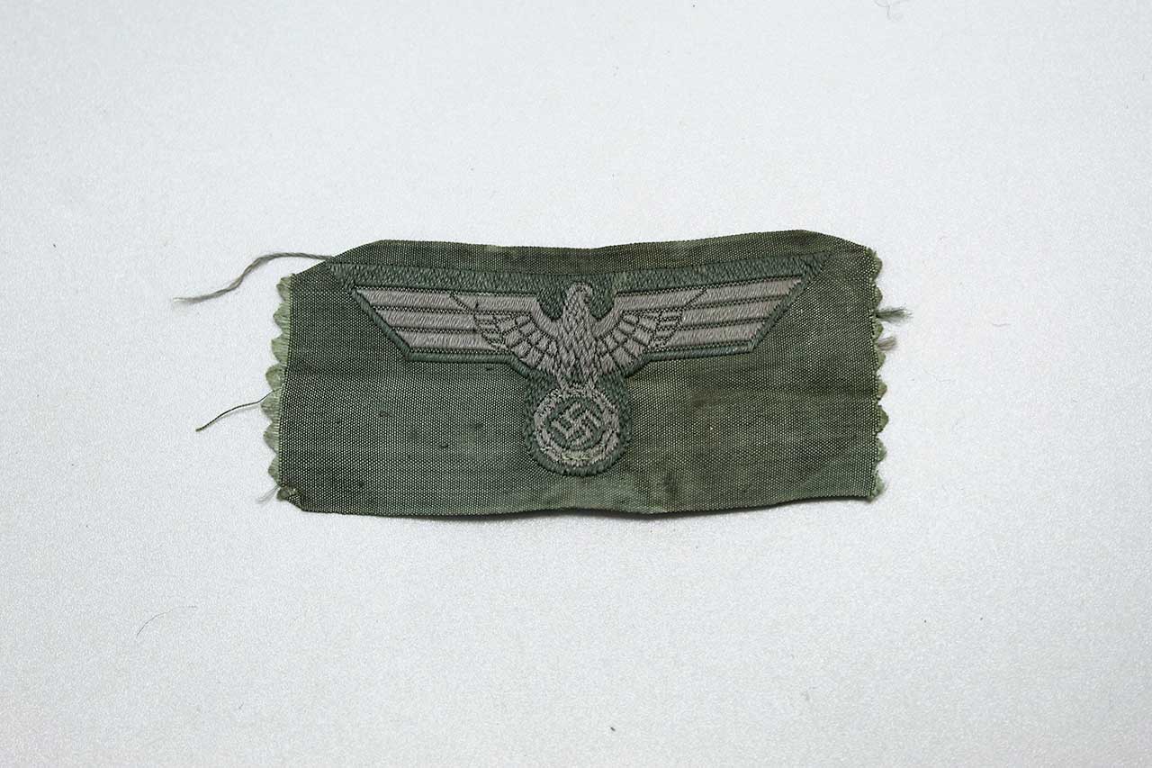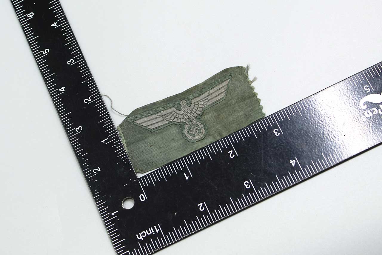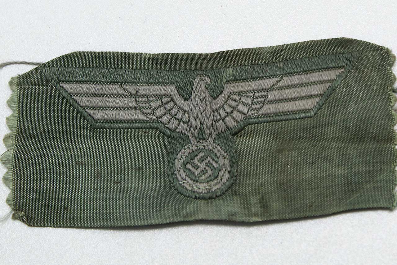 WW2 German Army EM/NCO Overseas/M43 cap eagle. Machine woven gray eagle on field-gray rayon base. Un-issued cut from factory roll.