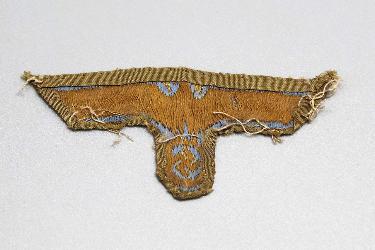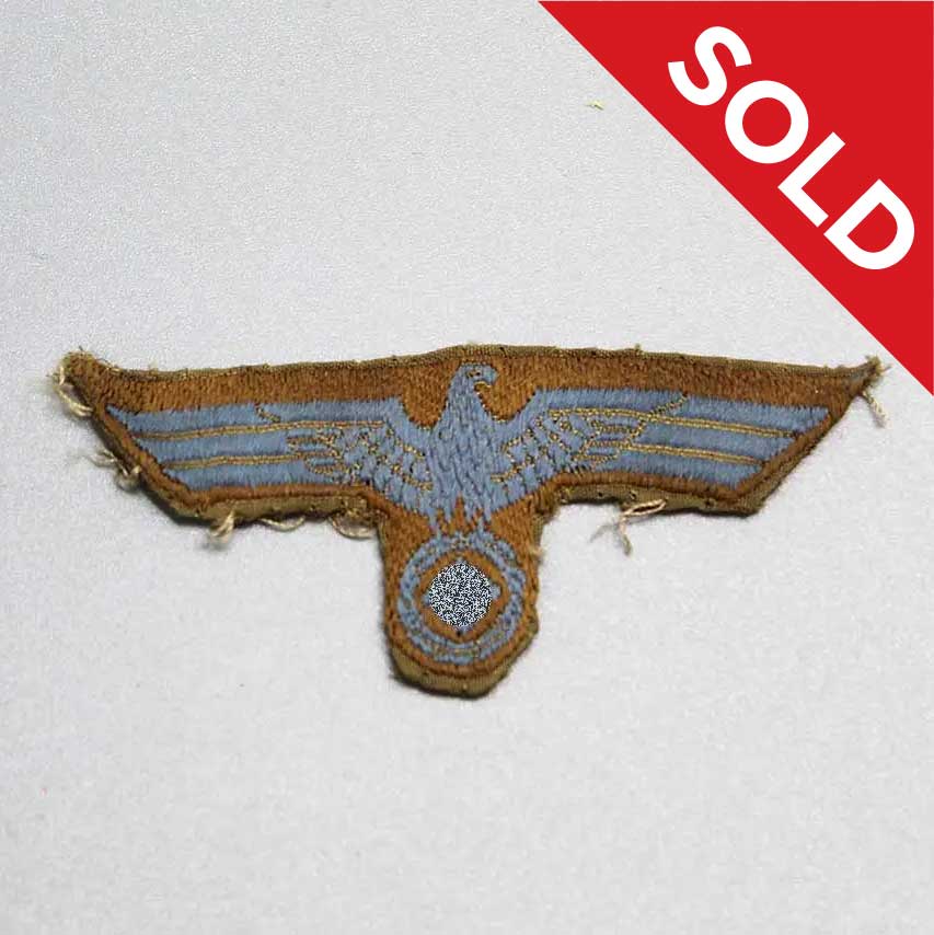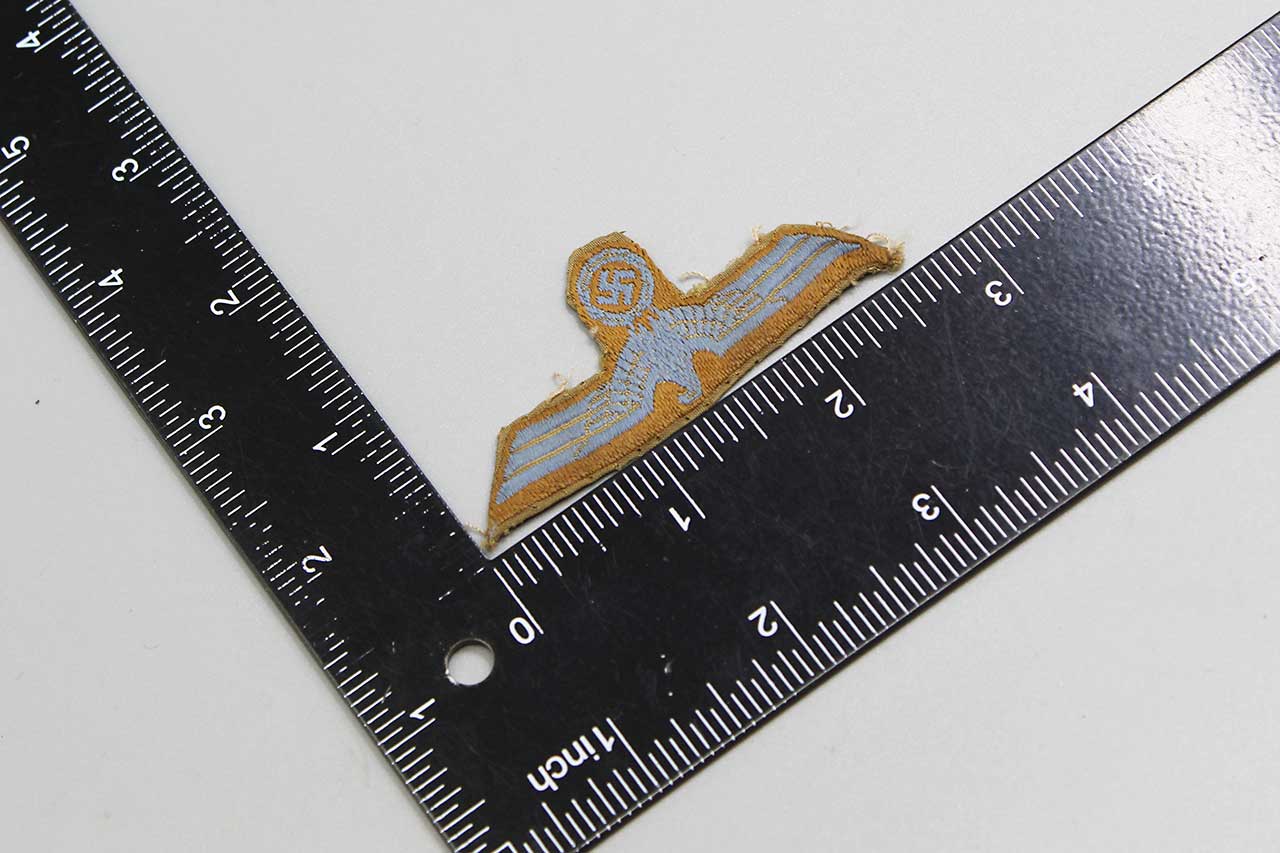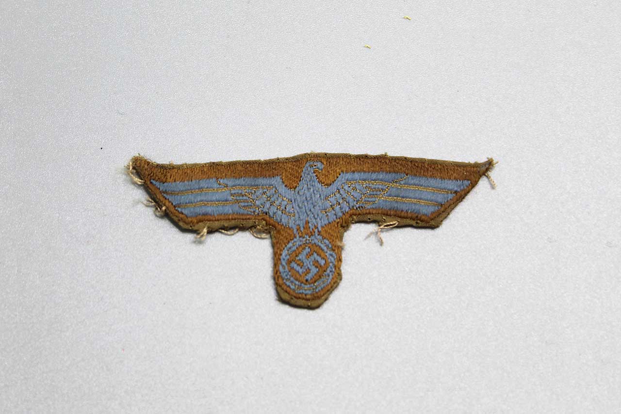 WW2 German Army Tropical (Afrika Korps or DAK) M41 or Overseas Cap Eagle. Blue-gray rayon threads on tan rayon base material. Size approximately 2 5/8 inches across. Appears to be cap removed. Worn condition.