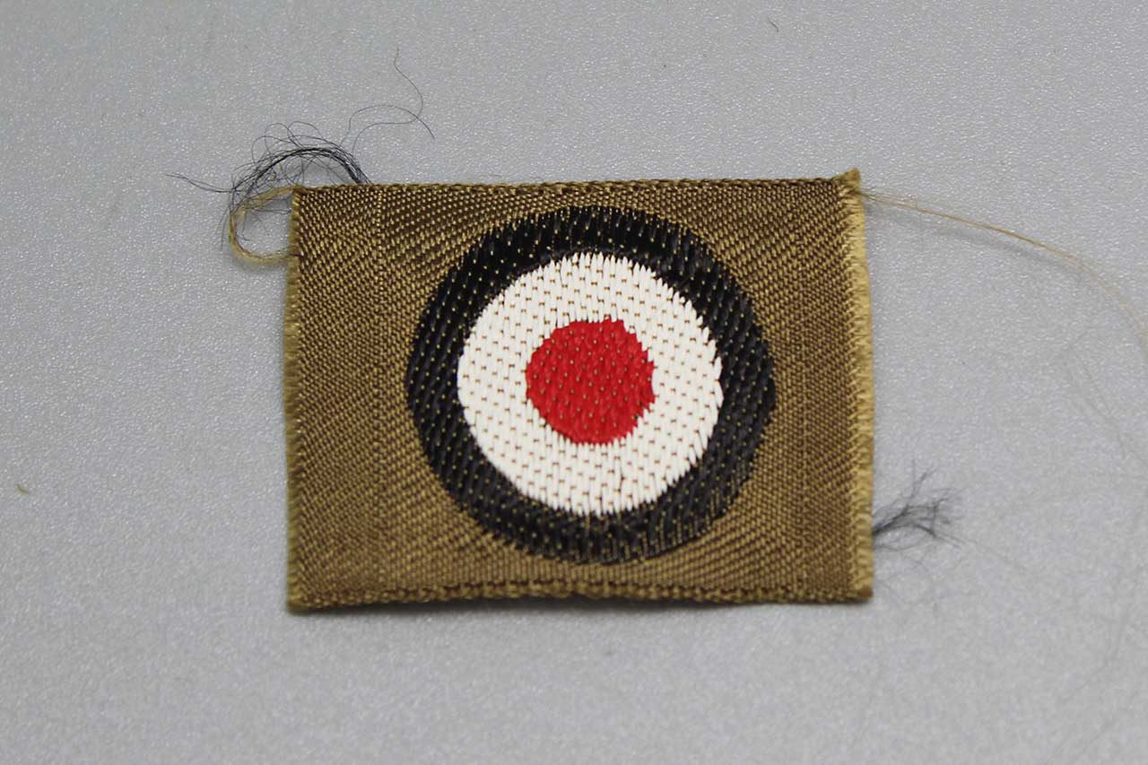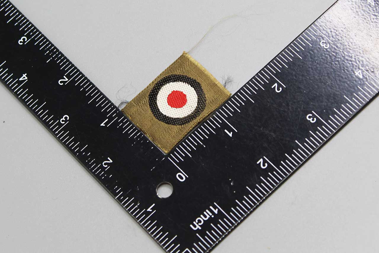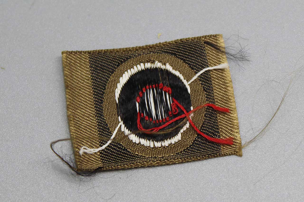 WW2 German Tropical Army EM/NCO Overseas or M41 cap cloth cockade. Unissued cut from factory roll. Size approximately 1 5/8 inches across. National tri-color cockade on tan rayon base.