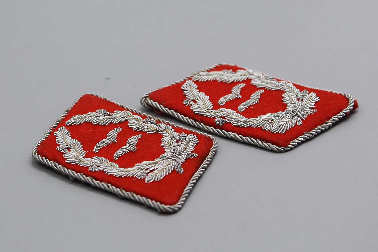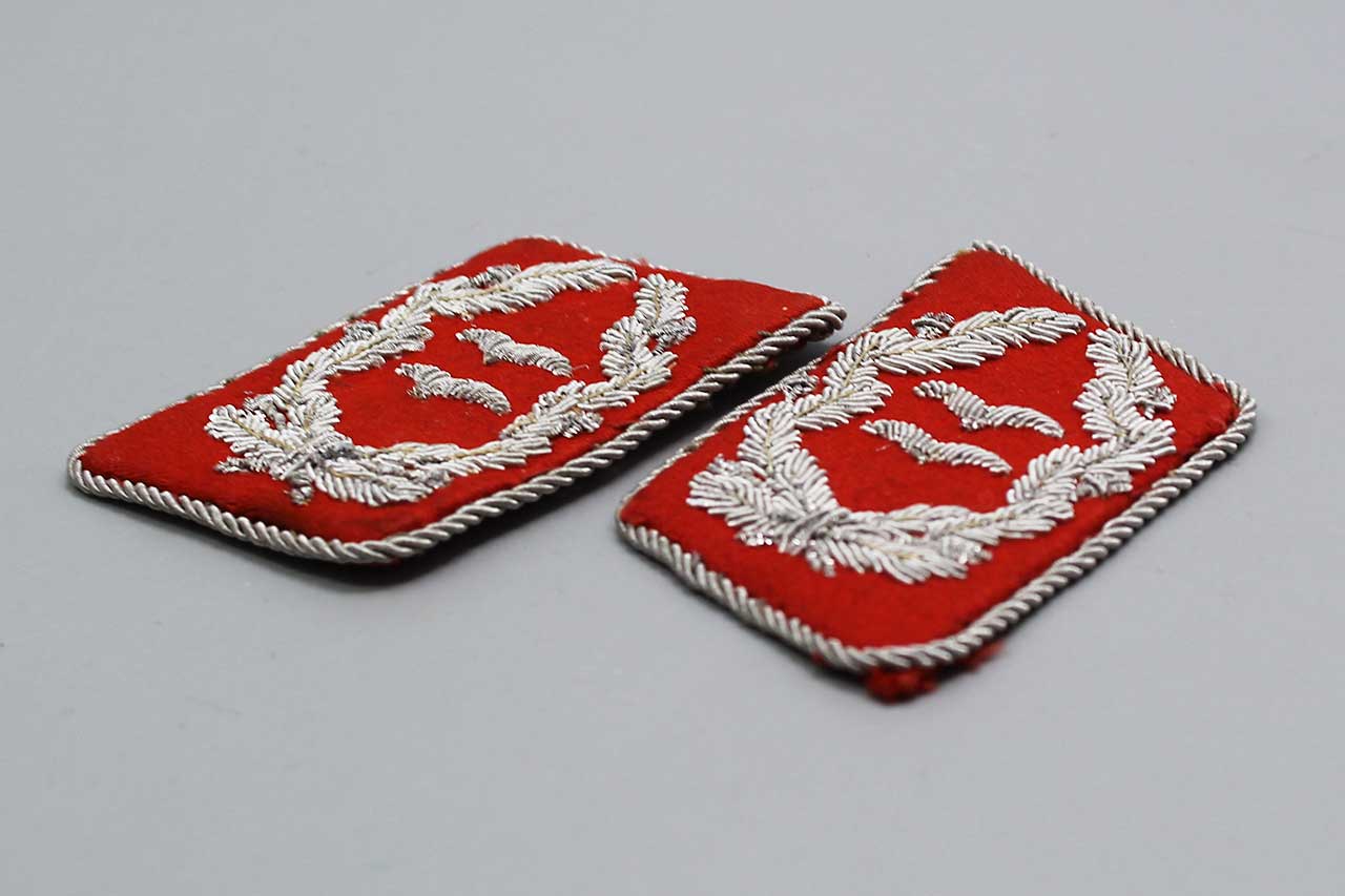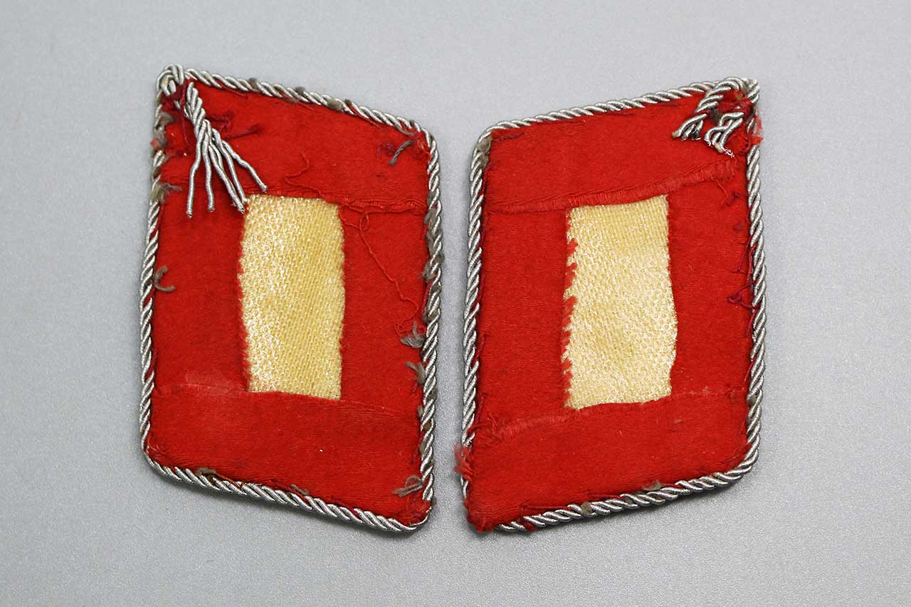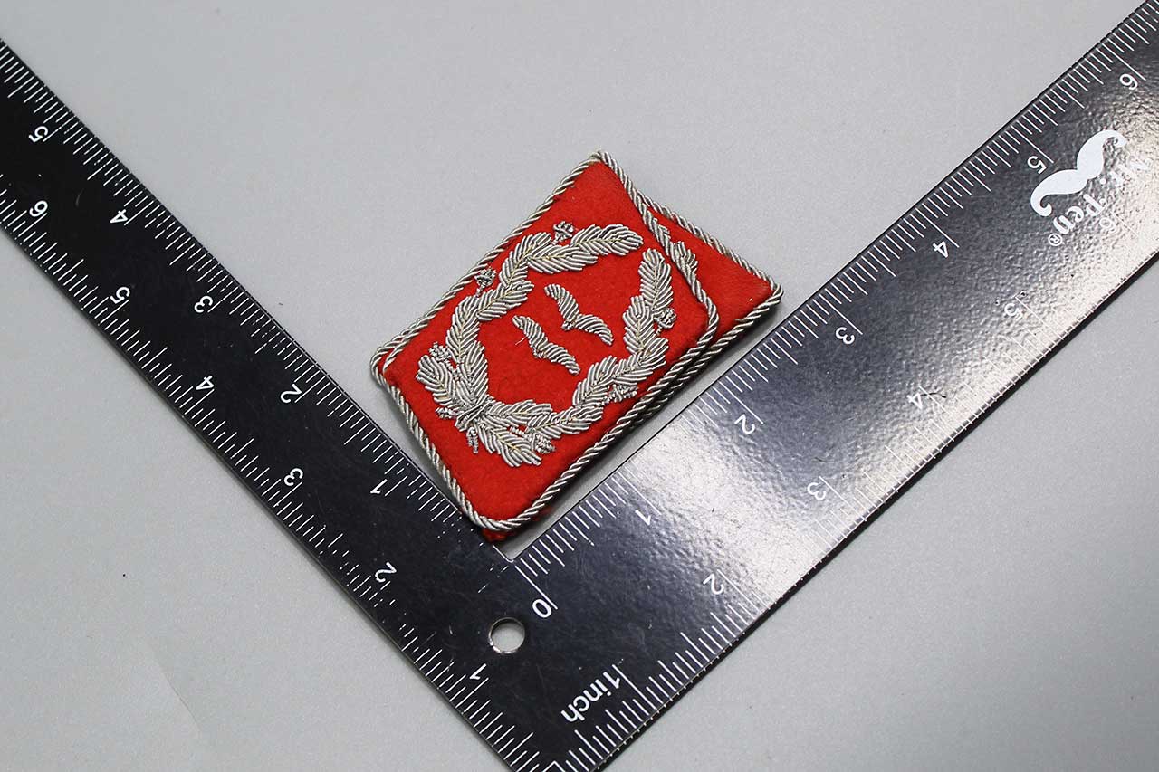WW2 German Luftwaffe Flak Oberstleutnant collar tabs. Red wool construction with hand embroidered rank gulls and oakleaves in silver-aluminum bullion wire threads with twisted bullion wire on edges and buckram backing material. Worn condition.