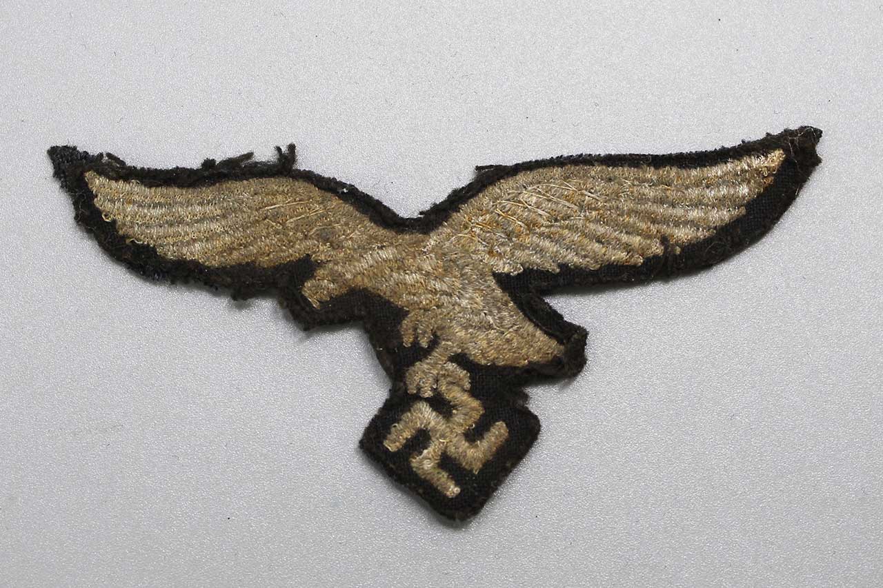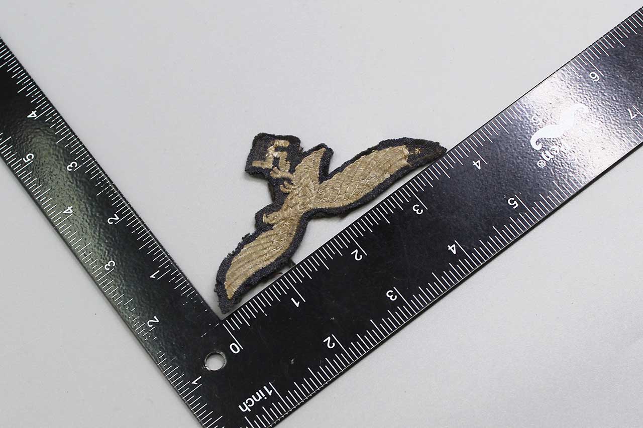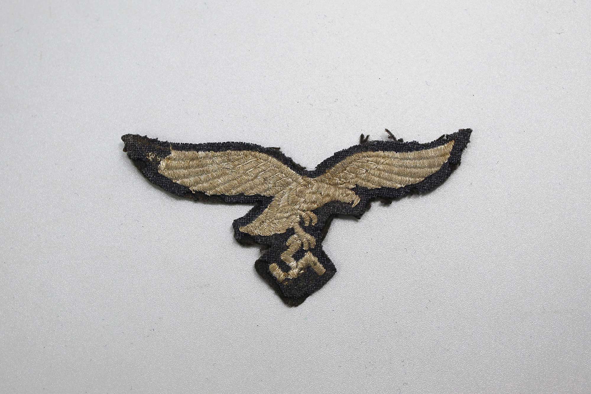 WW2 German Luftwaffe Tunic Eagle. Damaged to the front on swaz and wing tip area. Size approximately 3 1/2 inches across. Worn and damaged condition.