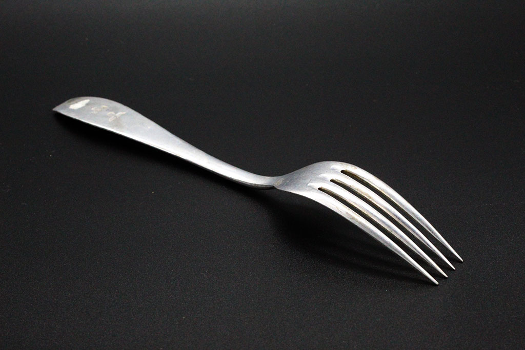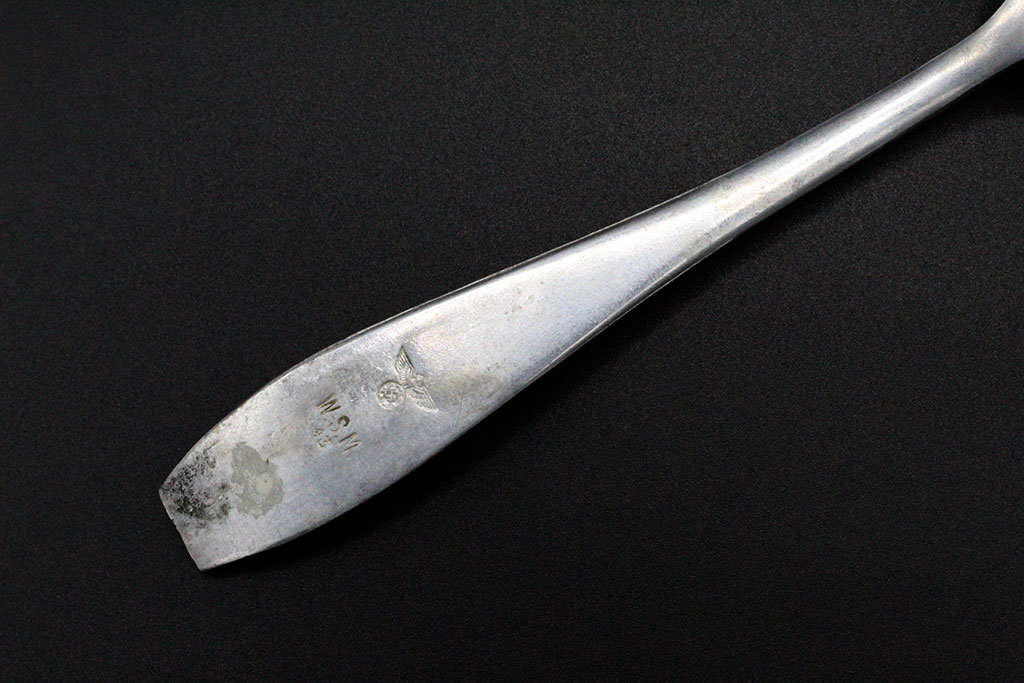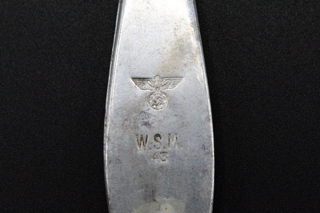 WW2 German Army Mess Fork. Marker marked W.S.M. 43 with German eagle stamp. Aluminum-alloy fork. Worn condition.