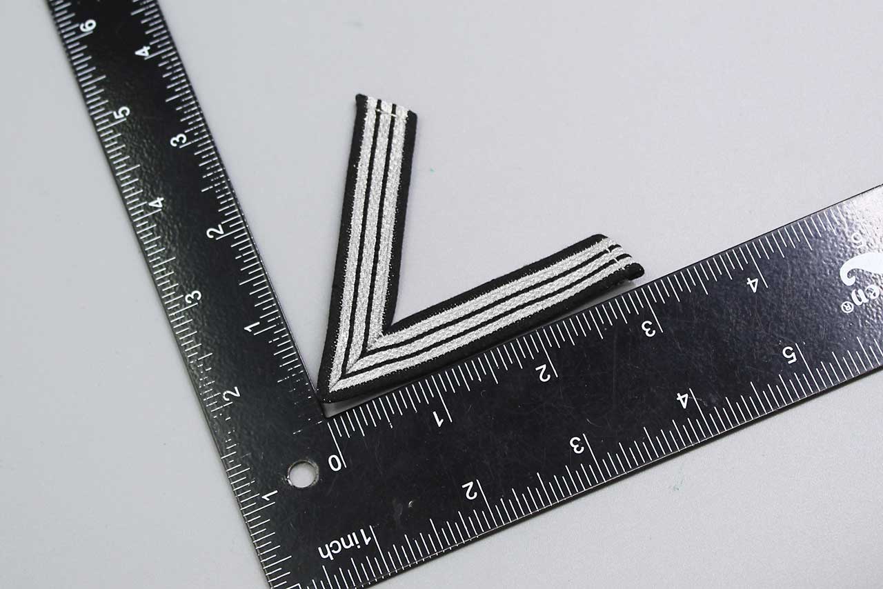 WW2 German SS Old Fighter’s Honor Chevron. Constructed of machine-embroidered silver aluminum bullion wire thread bearing two narrow black threaded bands. Worn condition.
