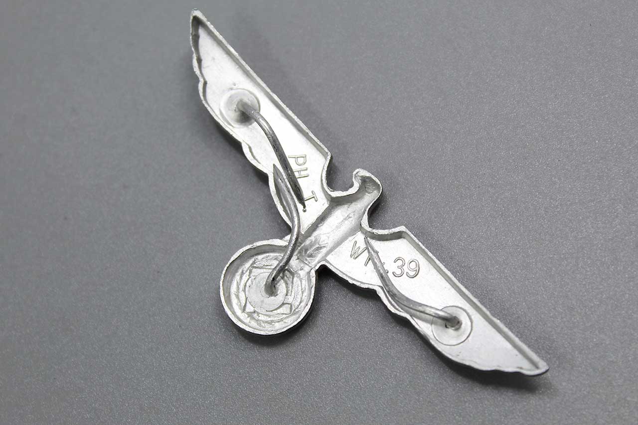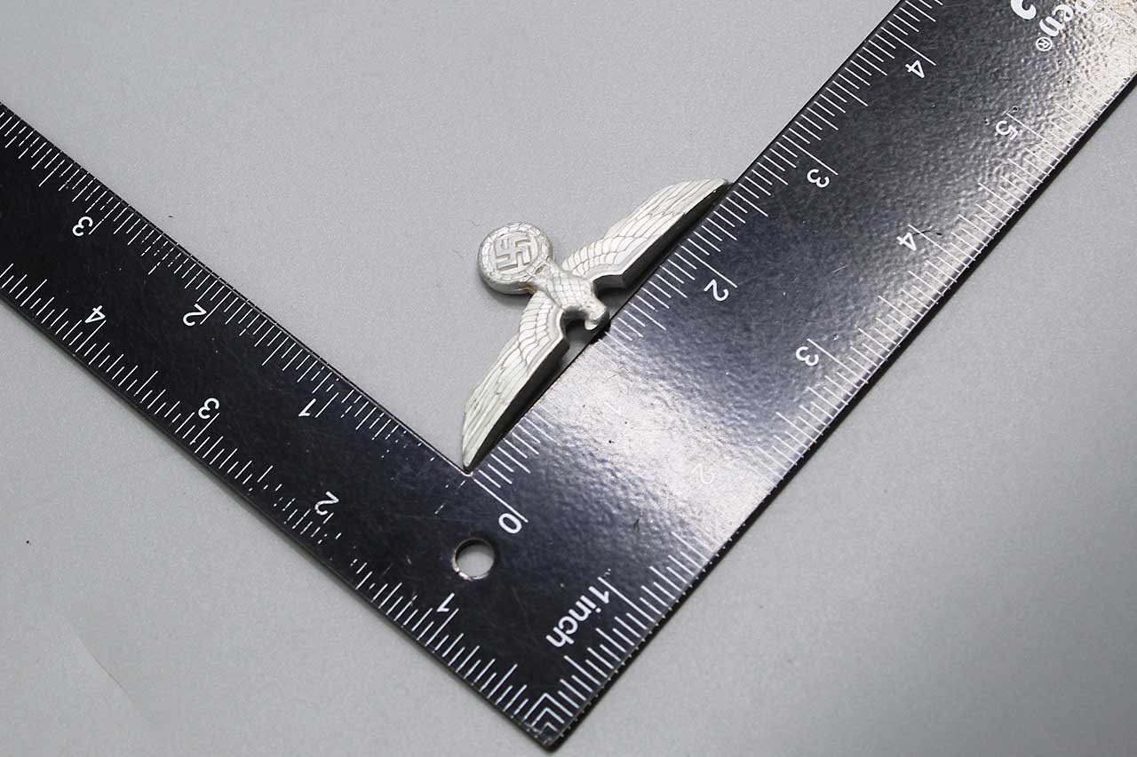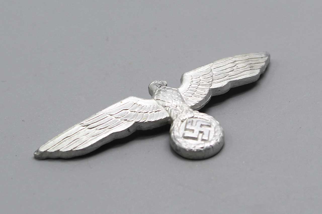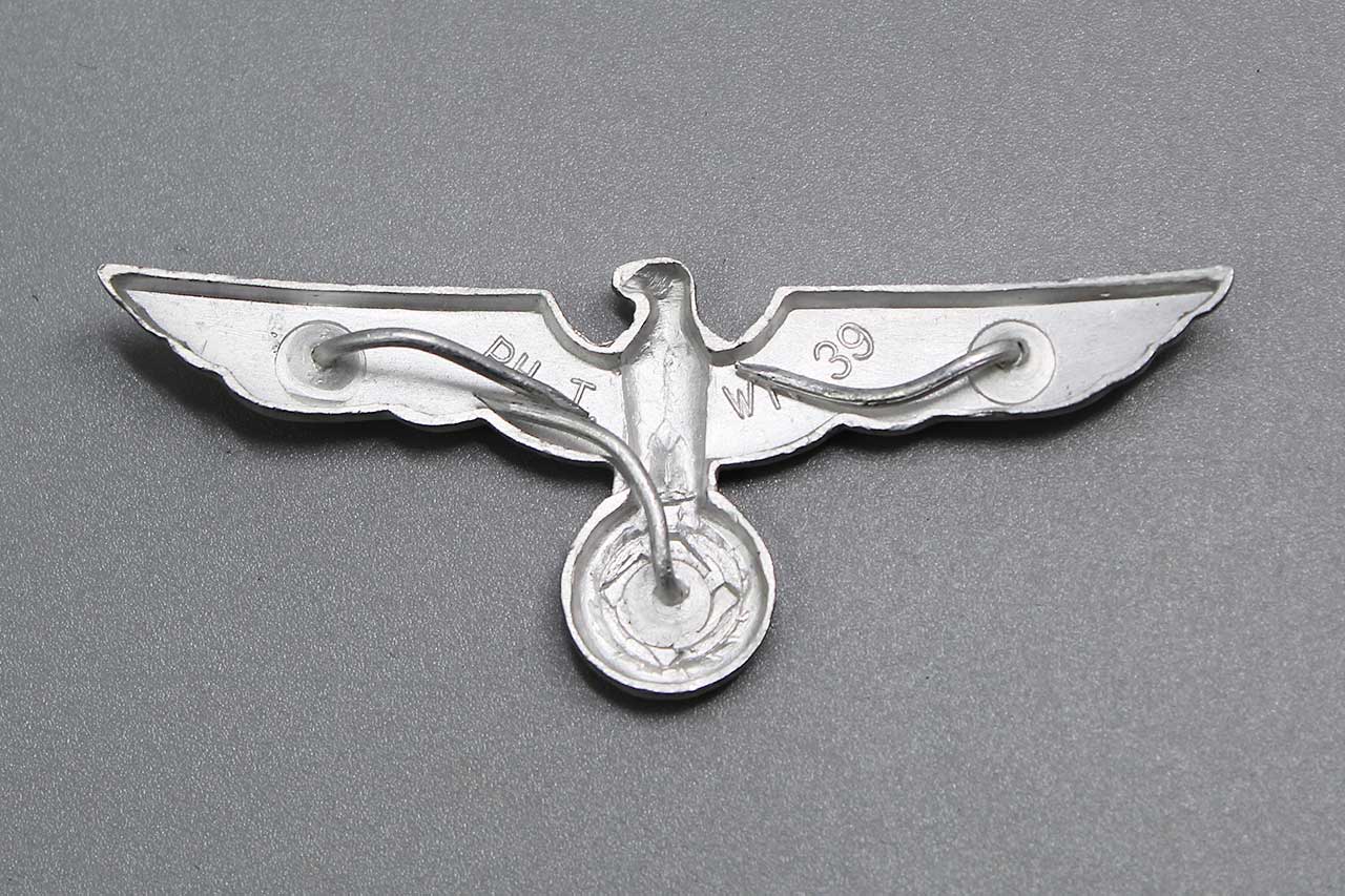 WW2 German Army Visor Cap Insignia. Aluminum-alloy eagle. Marker marked on back and dated 39. Size approximately 2 5/8 inches across. Worn condition.