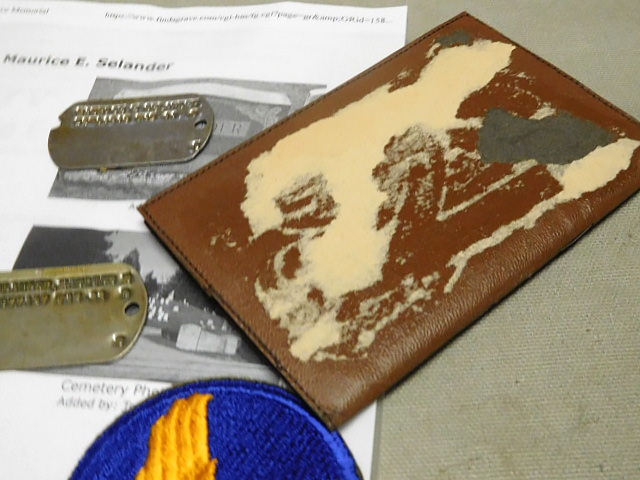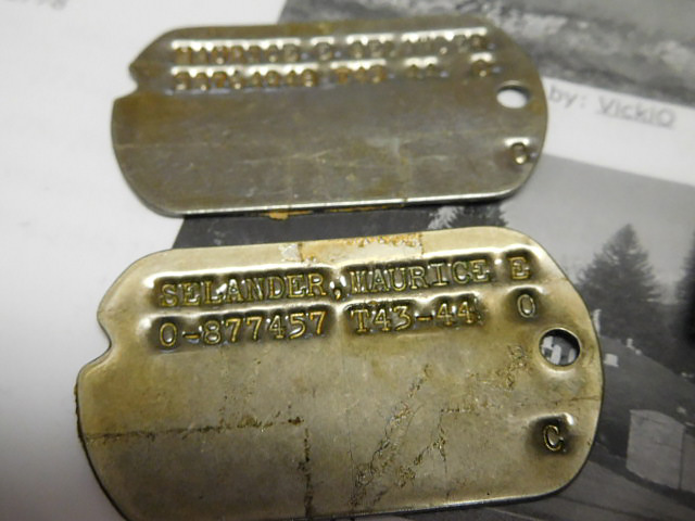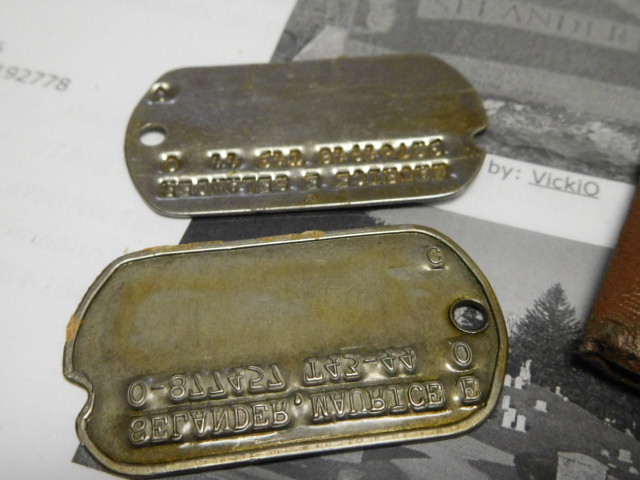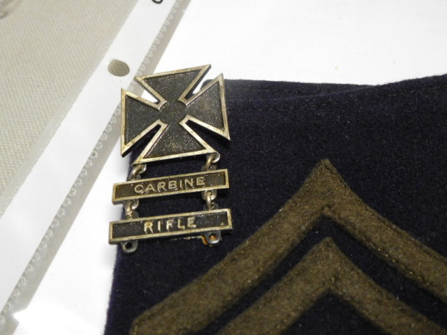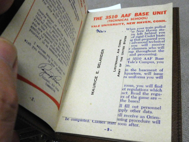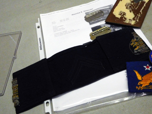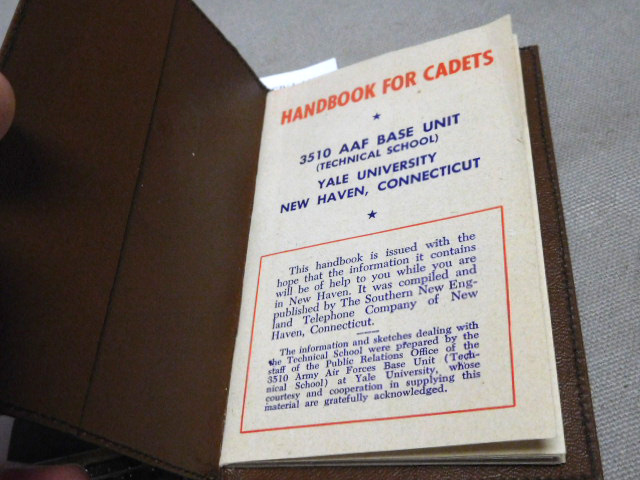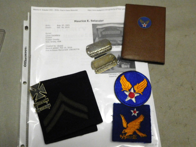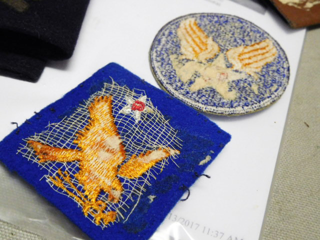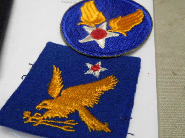 U.S. WW2 Army Air Force grouping. Two AAF shoulder sleeve insignia, dog tags, qualification badge, armband, and AAF Cadets booklet. It looks like the booklet was originally glued into a scrapbook and removed (can see the typical black scrapbook paper on the back.