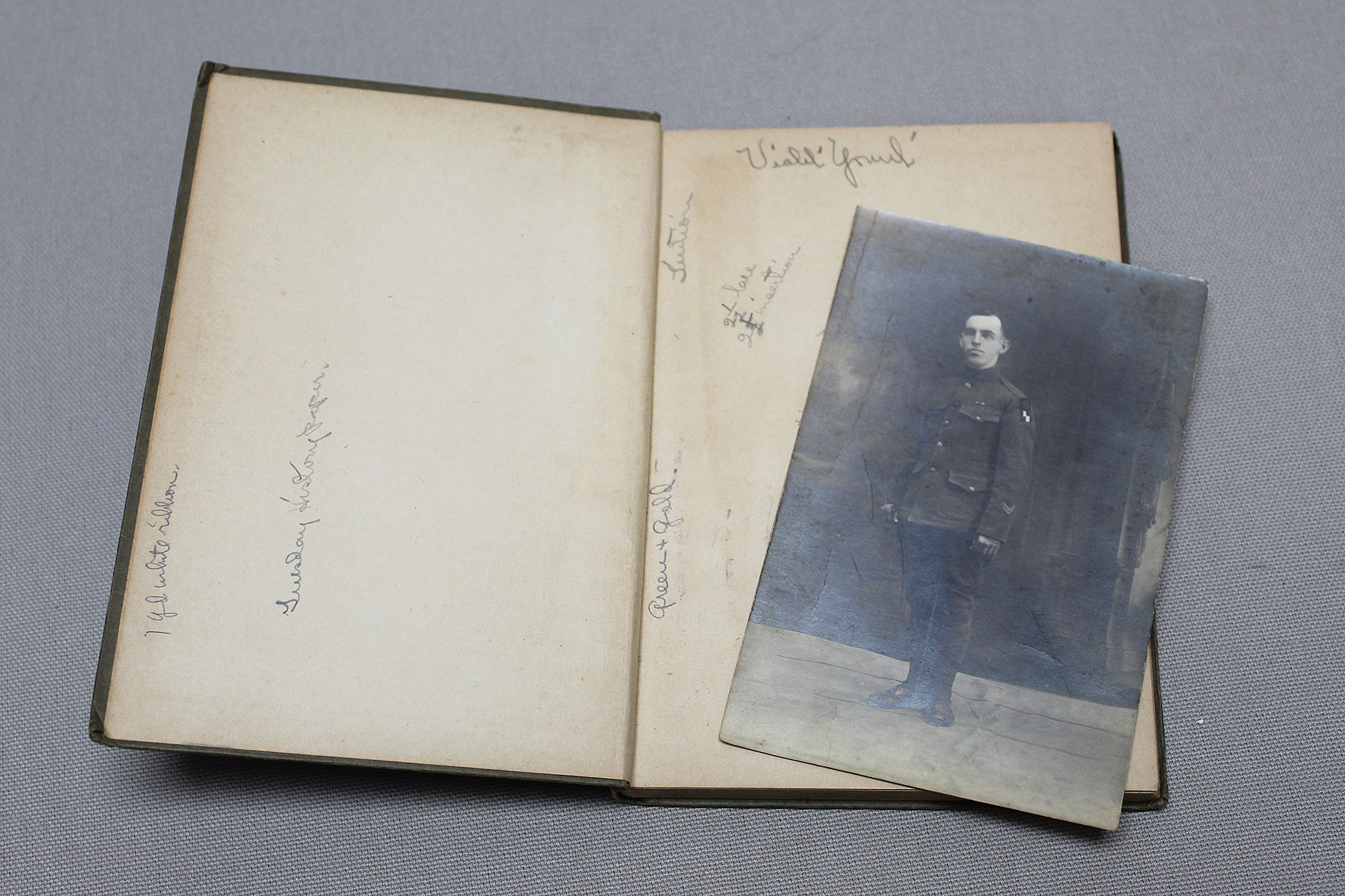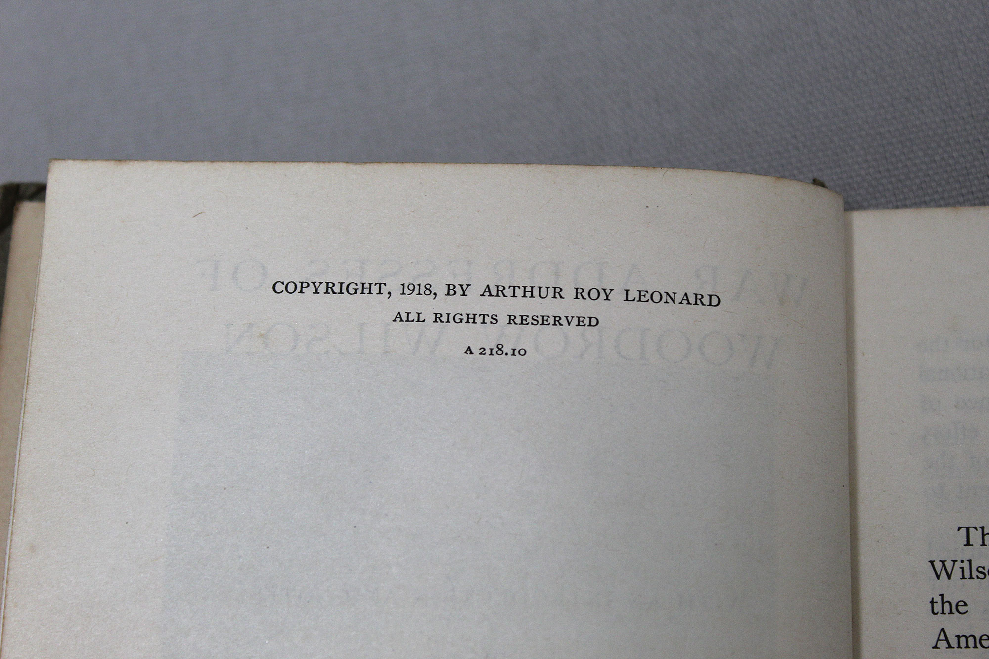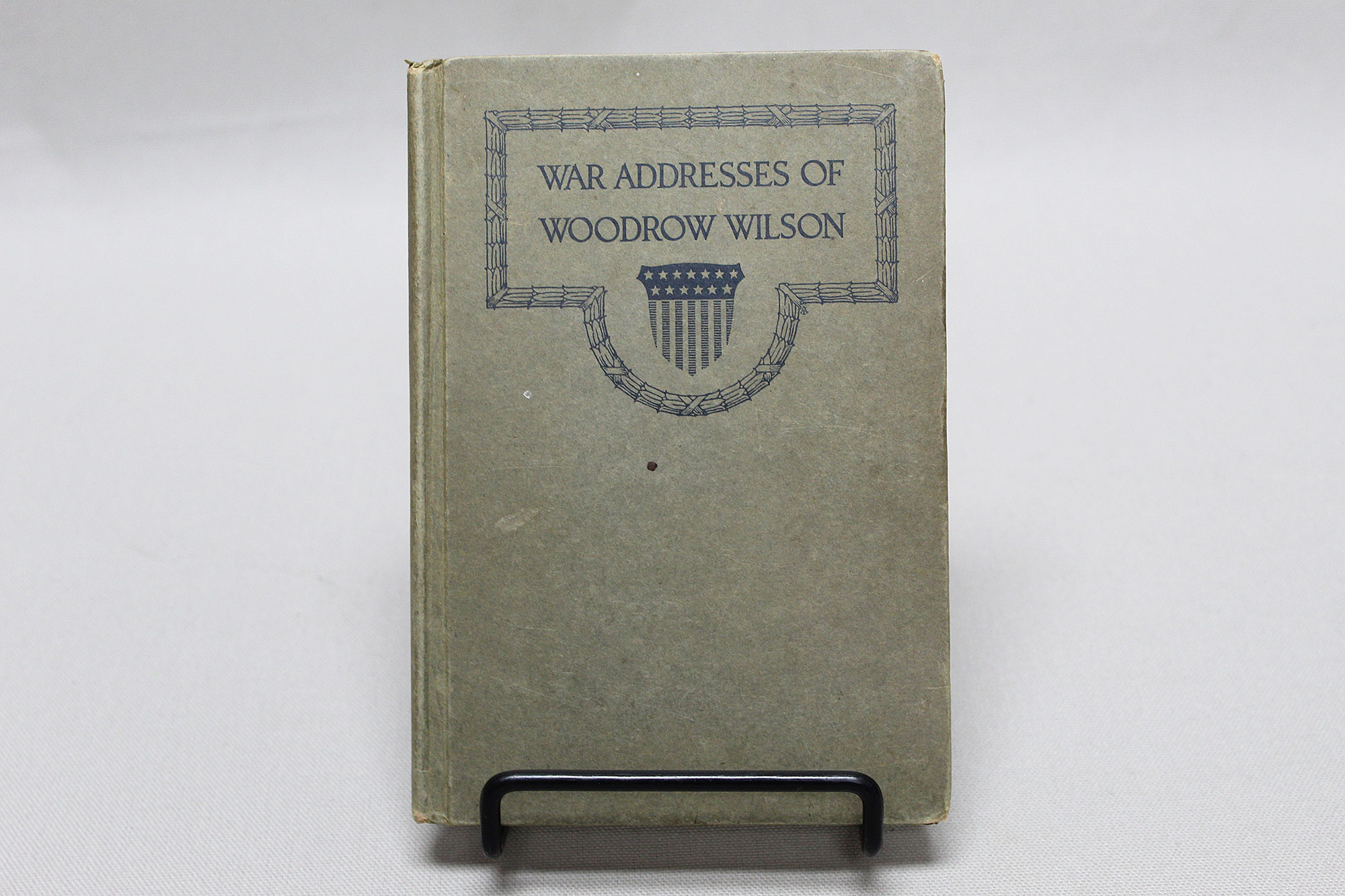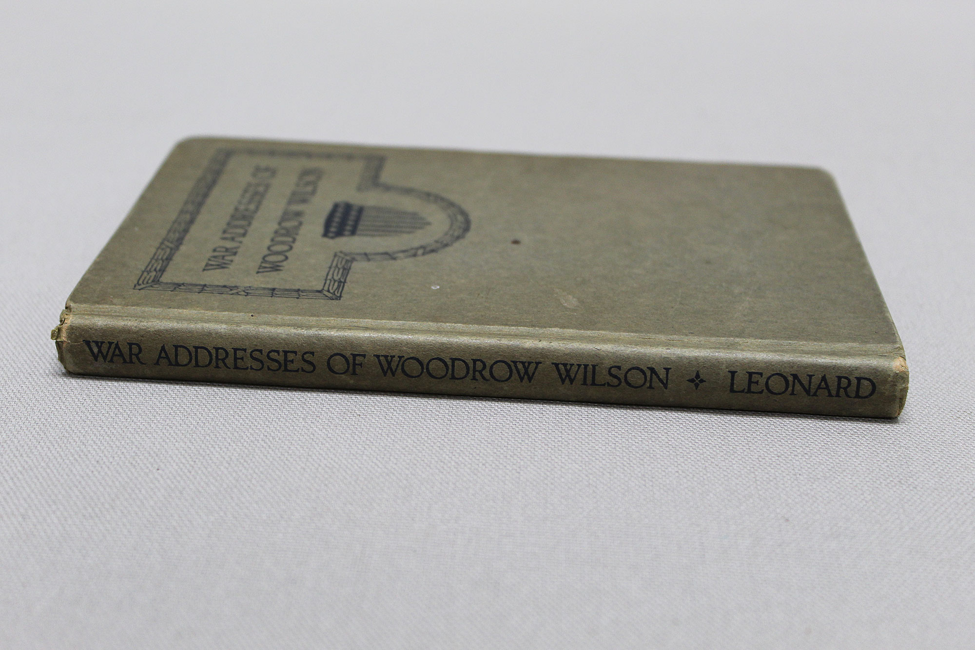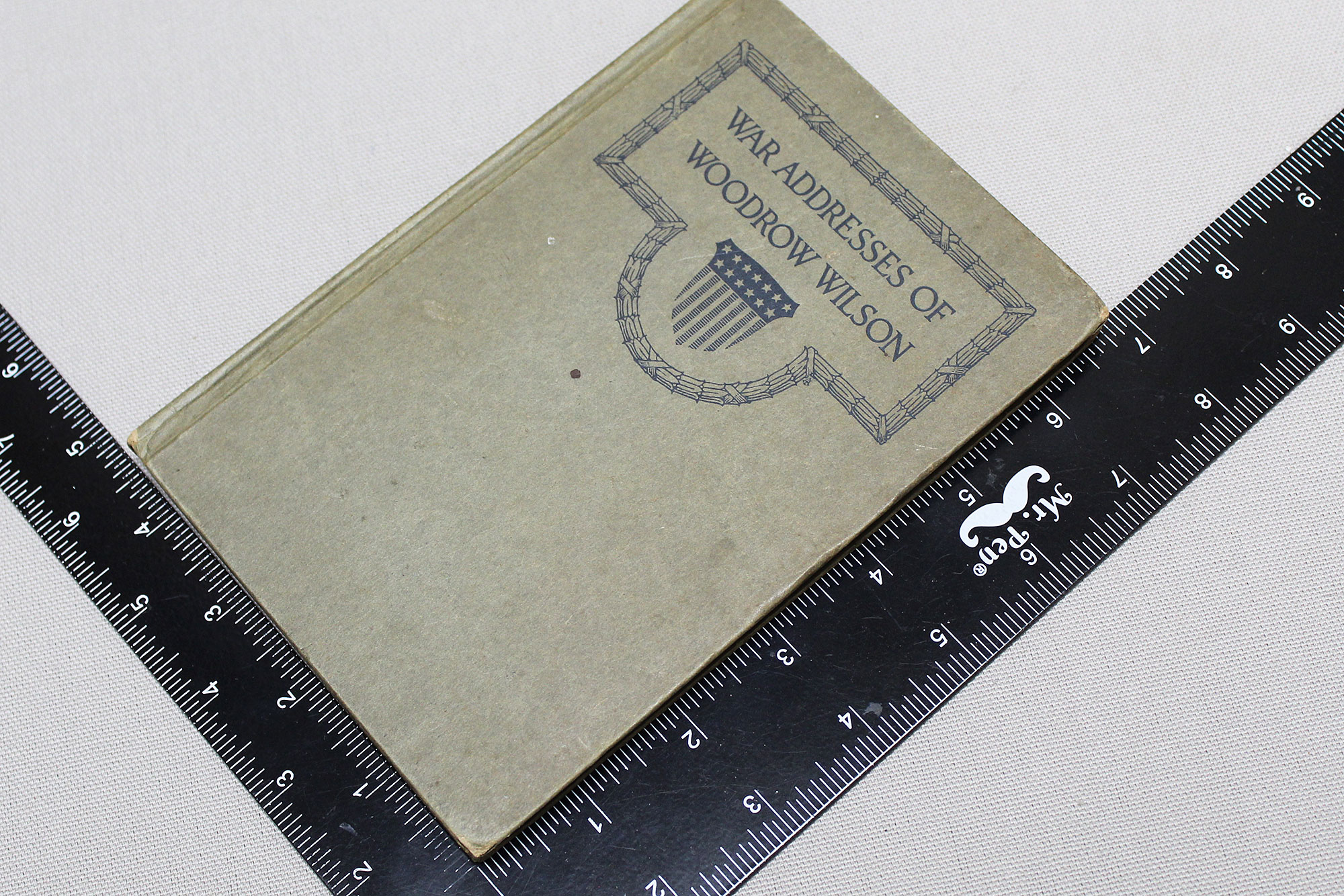 War Addresses of Woodrow Wilson Hardcover Book. Several writings on inside pages and picture post card of soldier in ww1 era uniform. Copyright 1918 by Arthur Roy Leonard. Size approximately 7 inches x 5 inches. Worn and used condition.