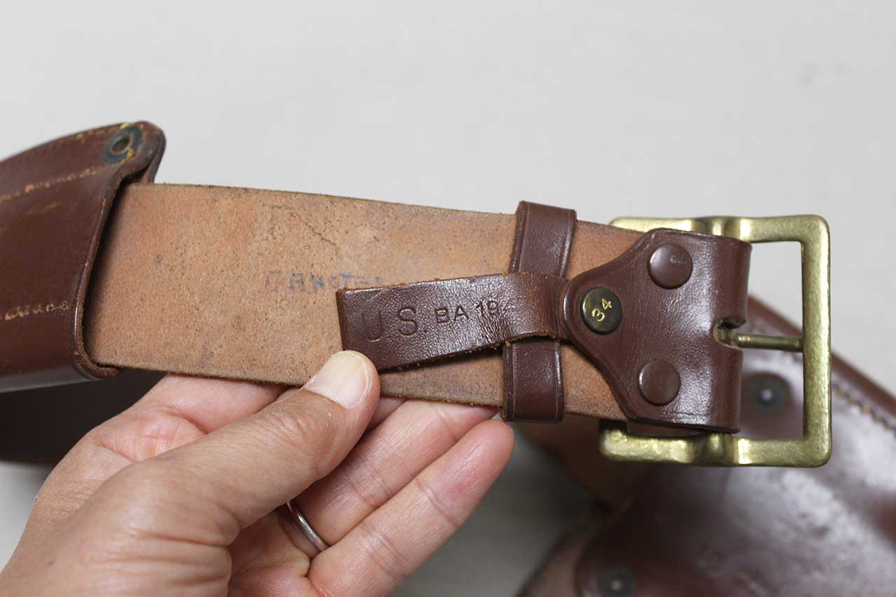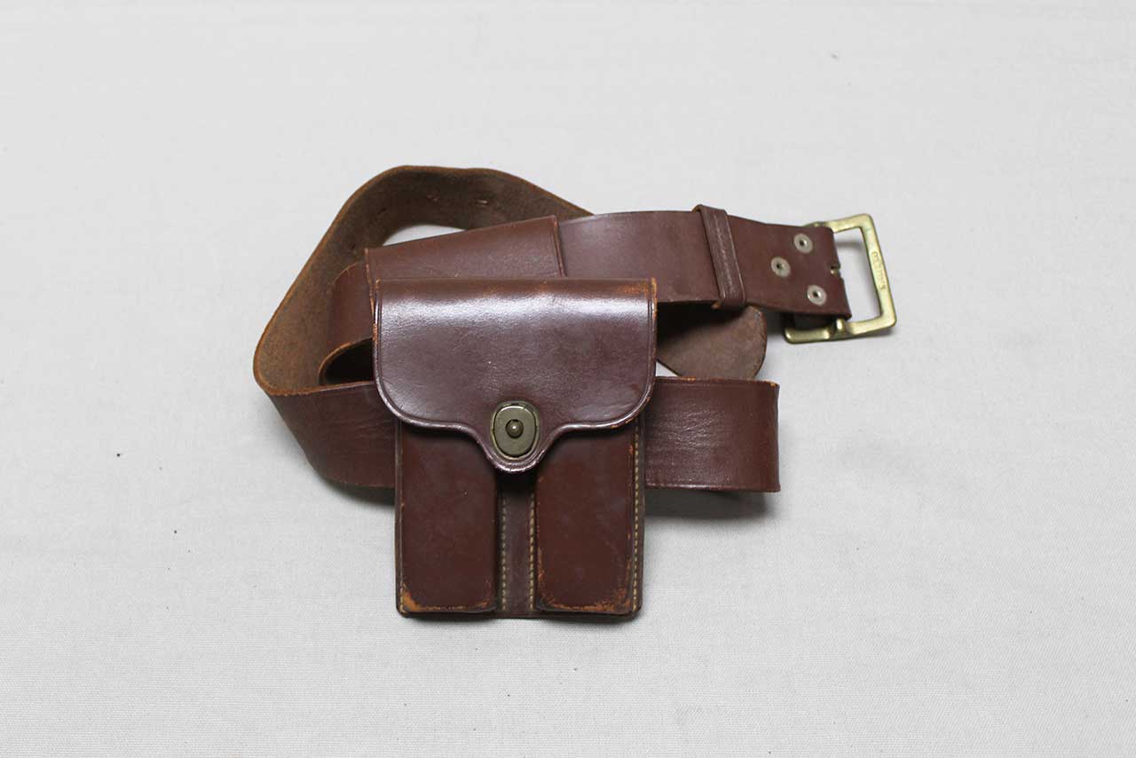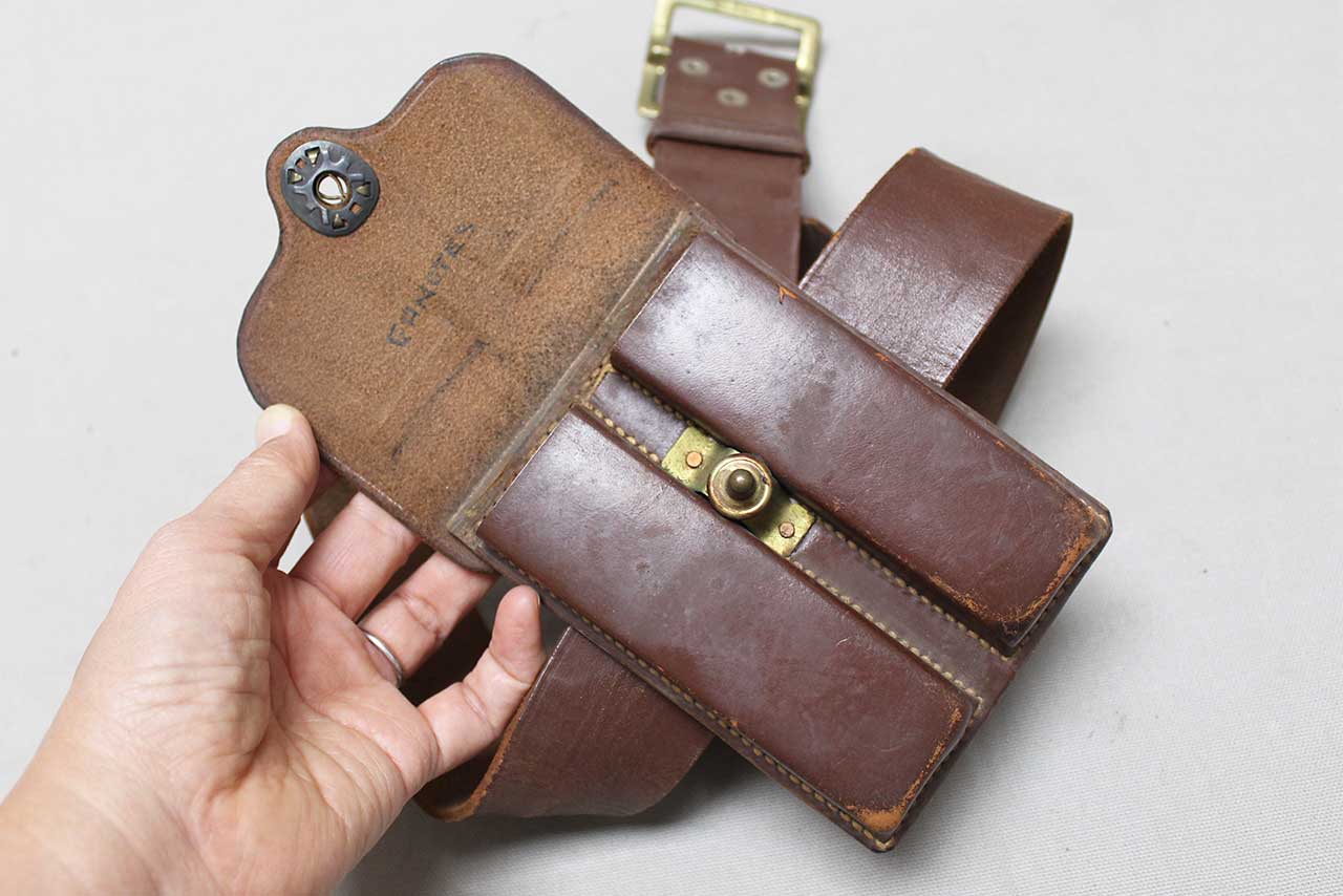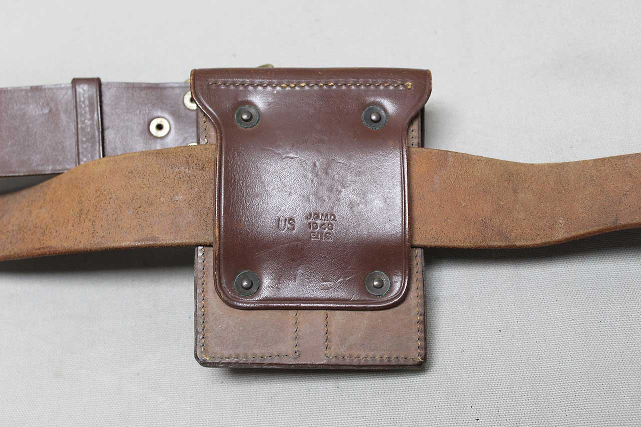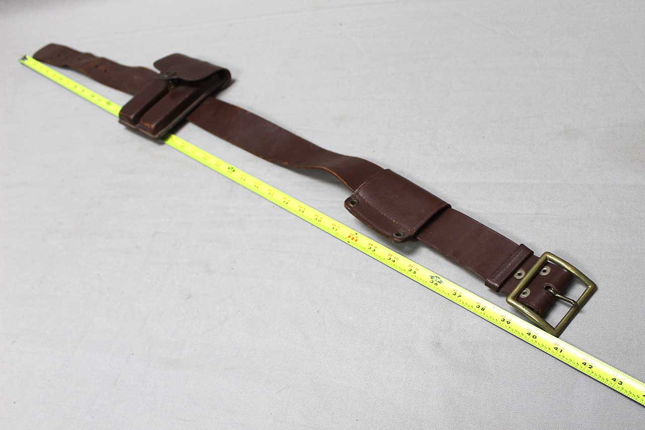 United States Army Officer Belt and Clip Pouch. Marker marked and dated 1946 on back on clip pouch slide. Named on inner flap of clip pouch. Also, named and dated on belt section and size marked 34 on belt snap. Overall length of belt appears to be about 40 inches. Worn condition.