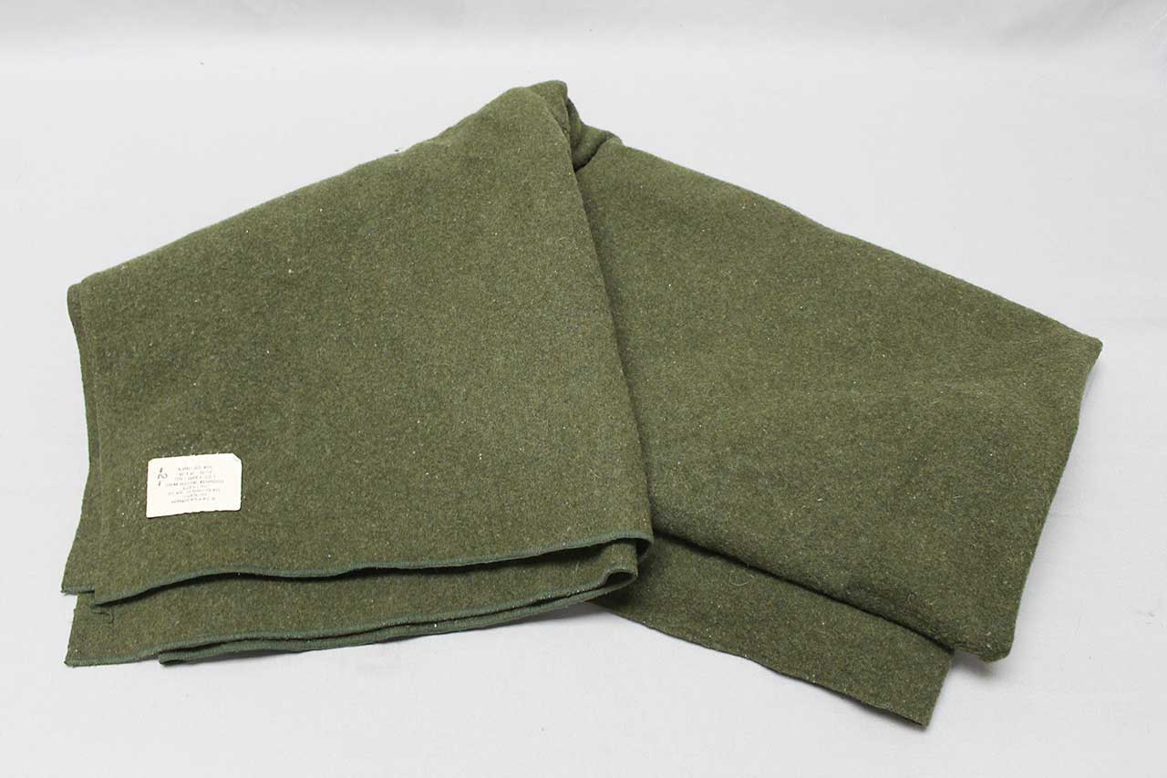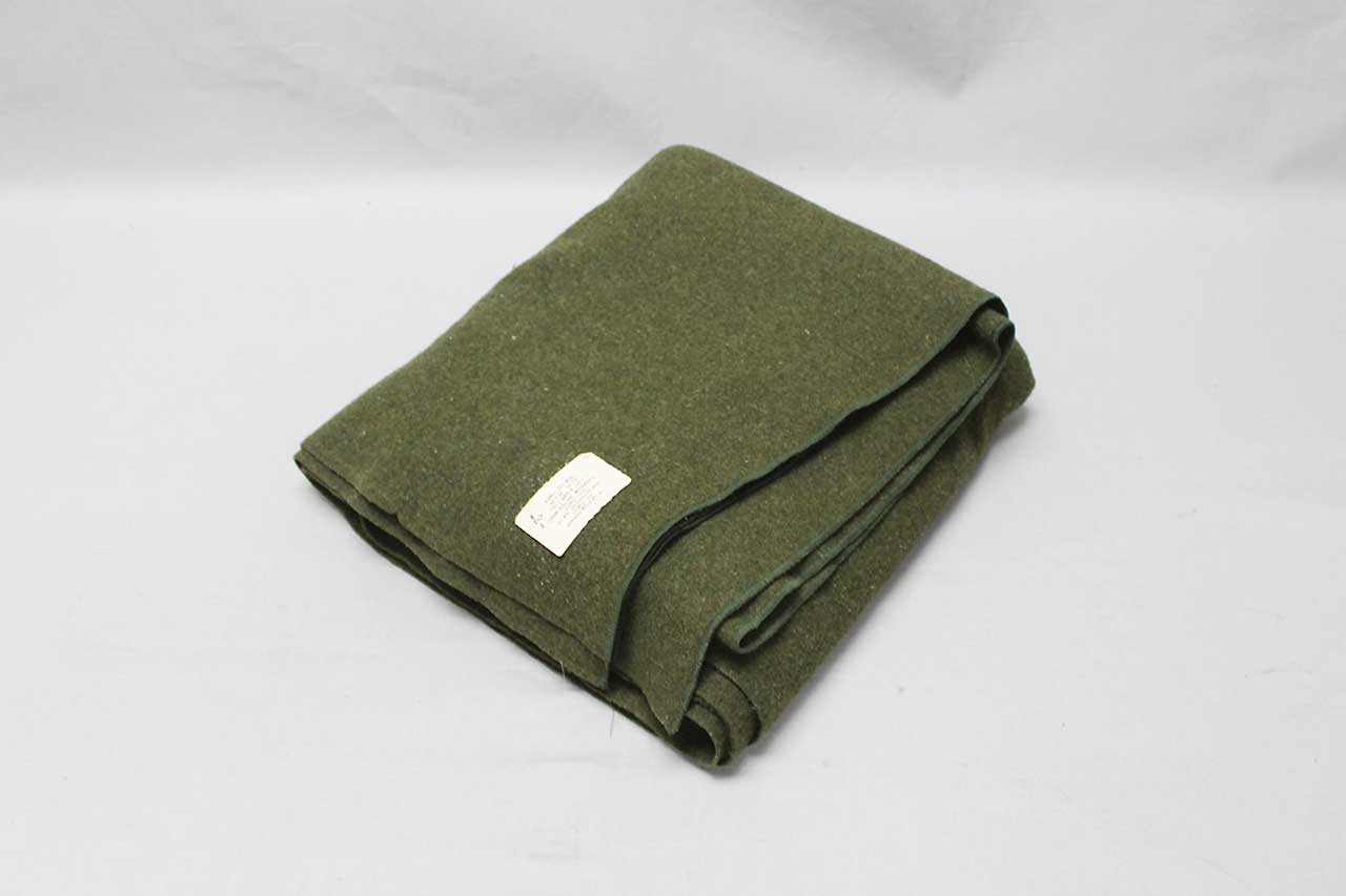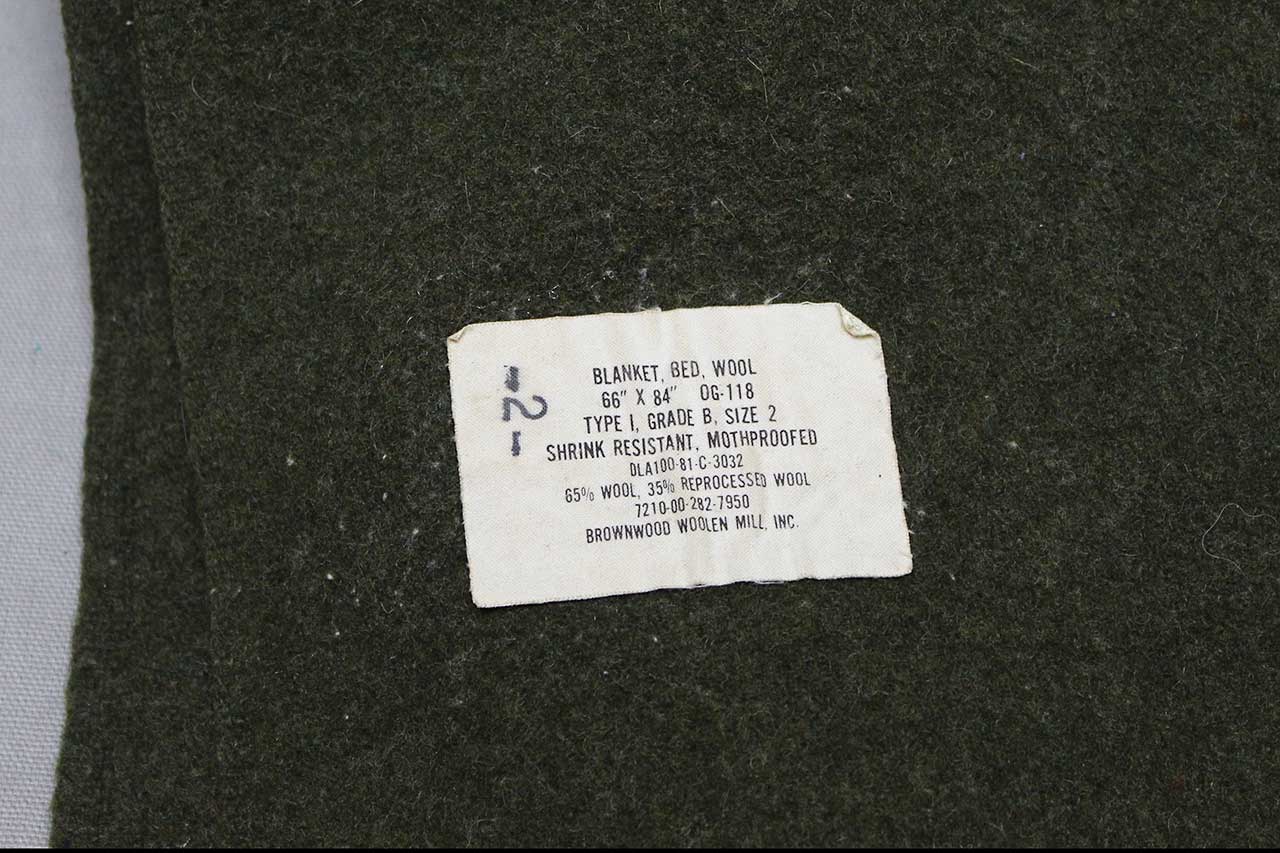 United States Army Wool Blanket. Contract tag marked: Blanket, Bed, Wool, 66″ x 84″ OG-118, Type 1, Grade B, Size 2, Shrink Resistant Mothproofed, DLA-100-81-C-3032, 65% wool 35% reprocessed wool. Worn condition.