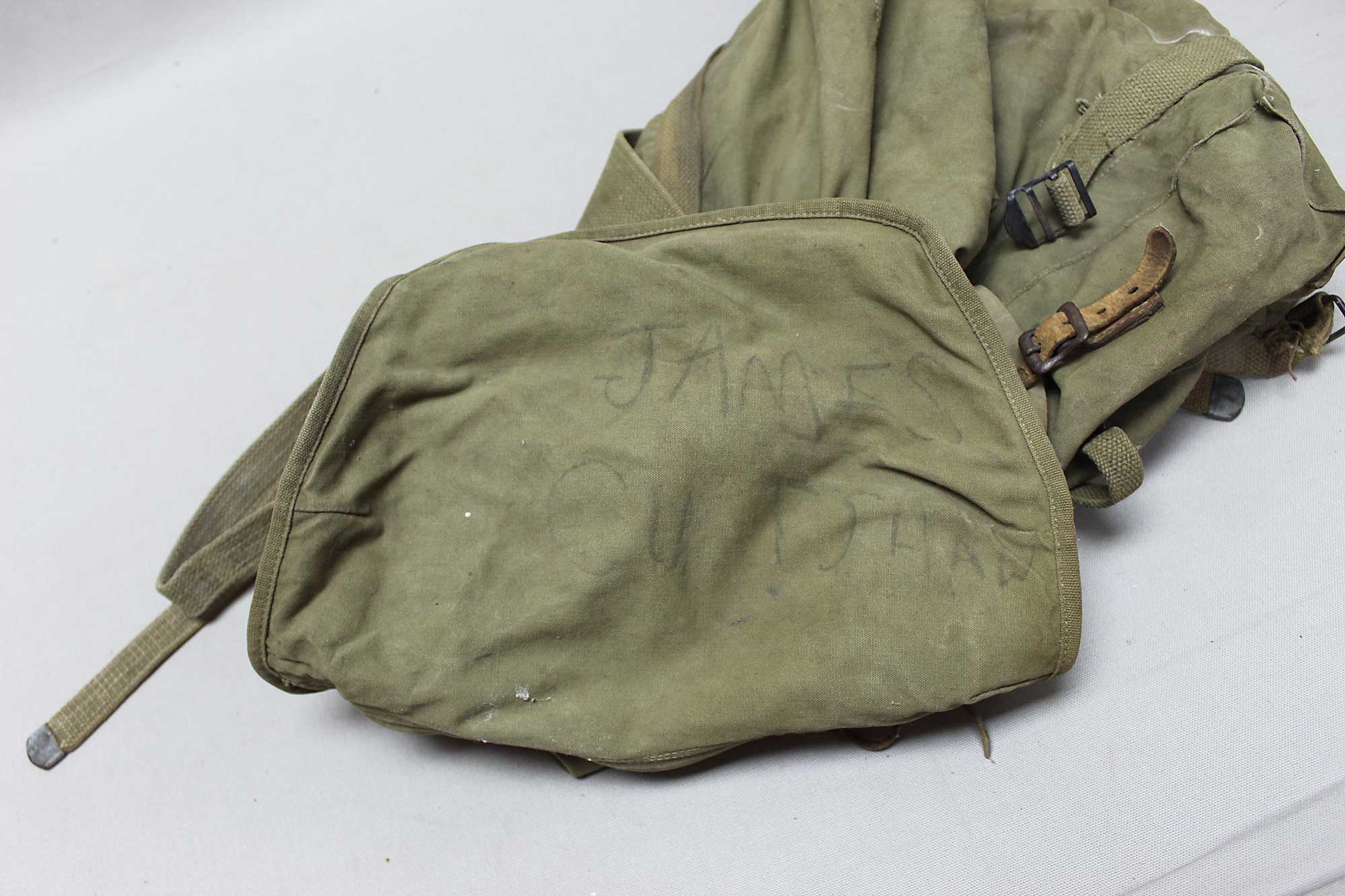 Additional Notes: The US Army M1942 rucksack had a leather frame support that bore heavy loads better than the 1941 pattern’s web frame support pocket. Attaching the shoulder straps directly to the frame support held the rucksack more tightly to the soldier’s shoulders and let him carry the rucksack without a frame if needed. Two wide, web straps with double-bar, bronze buckles encircled the rucksack pouch and pouch flap on both sides of the meat can pocket. The straps reinforced the pouch, kept the cover flap tightly closed to keep out snow, and squeezed the load close to the frame. A separate belly-band, worn higher than on the previous version, passed through slots made by the reinforcement straps. Four canvas equipment tabs, two on each side of the rucksack, provided attachments for equipment such as the intrenching tool, bayonet, and first aid pouch. The rucksacks continued to use the heavy ribbed web shoulder straps and thick felt pads found on the 1941 pattern rucksacks.