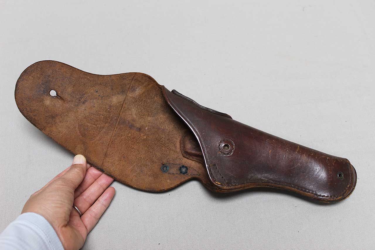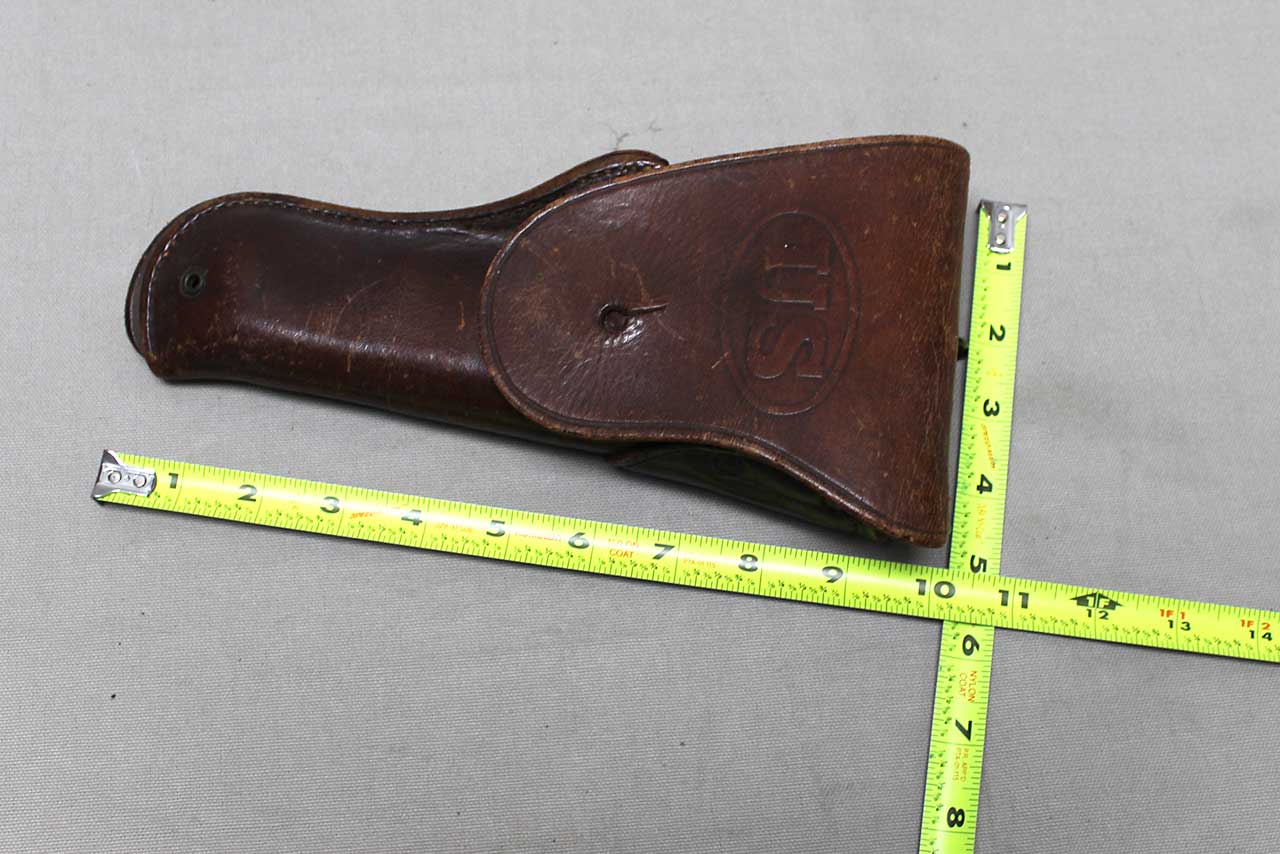 Additional Notes: The United States Colt 1911 M1916 Holster is a classic piece of military gear from WW1 and WW2. This heavy leather holster was designed to carry the Colt 1911 .45 caliber sidearm and was standard issue for U.S. troops. It can typically feature a leg tie-down strap for added security and has the “US” embossing to indicate military issue.