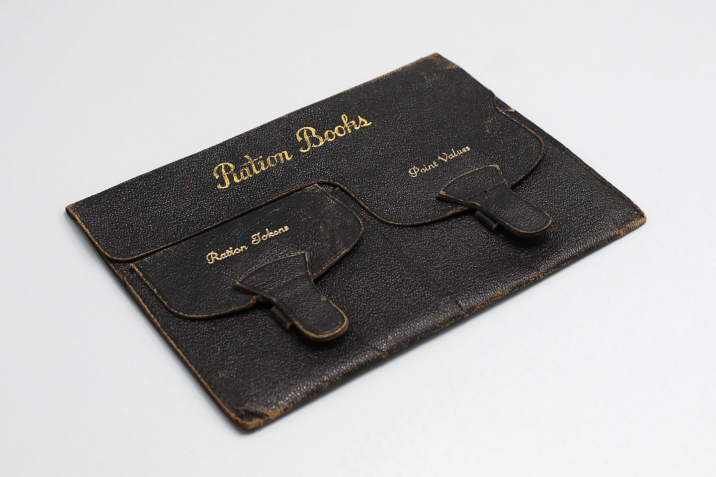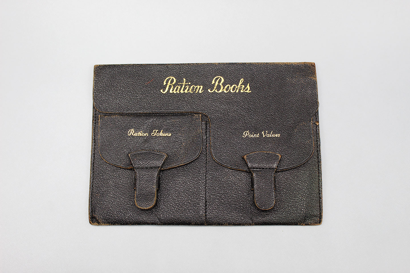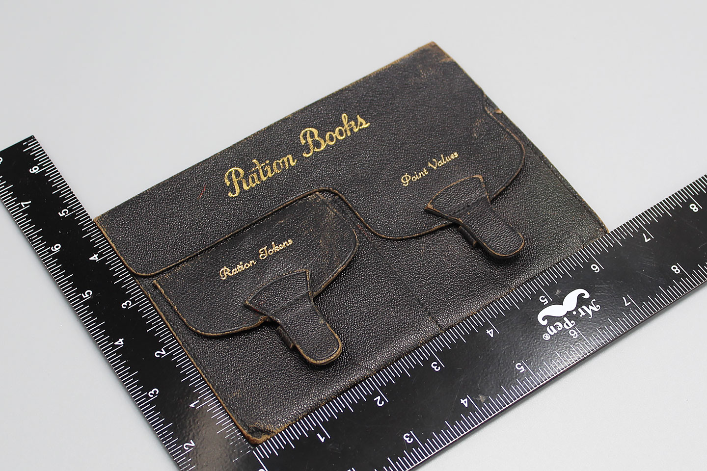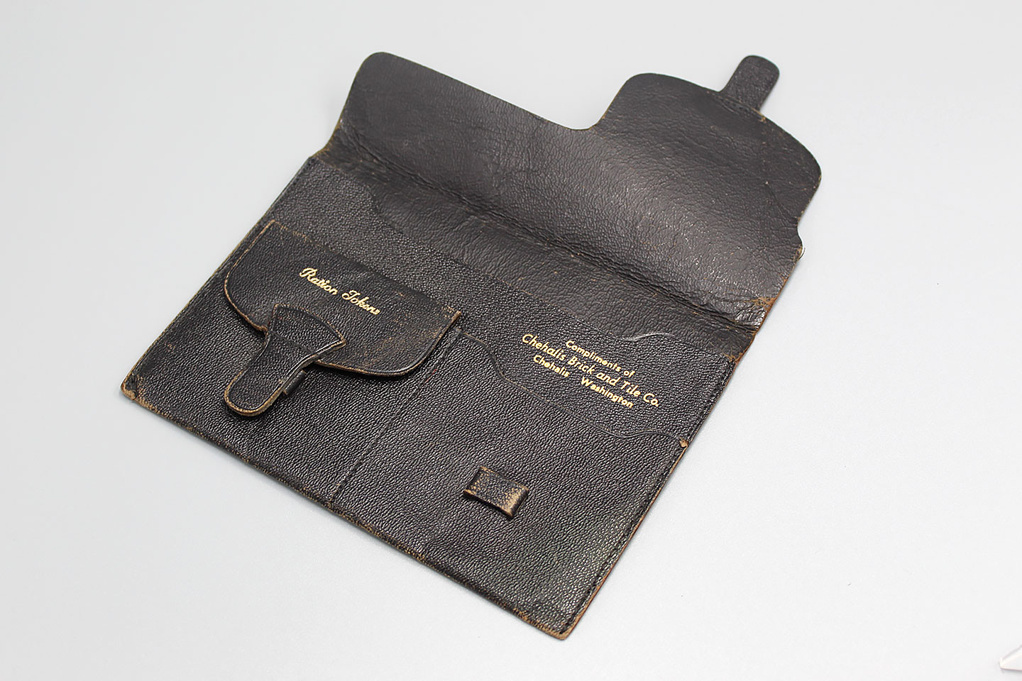 U.S. Ration Books holder. WW2 era. One section for ration tokens, another section for point values. Marked on inside flap: Compliments of Chehalis Brick and Tile Co. Chehalis Washington. Size approximately 6 1/2 inches X 4 1/2 inches. This is just the holder, no books, points, or tokens in this one. Used and worn condition.