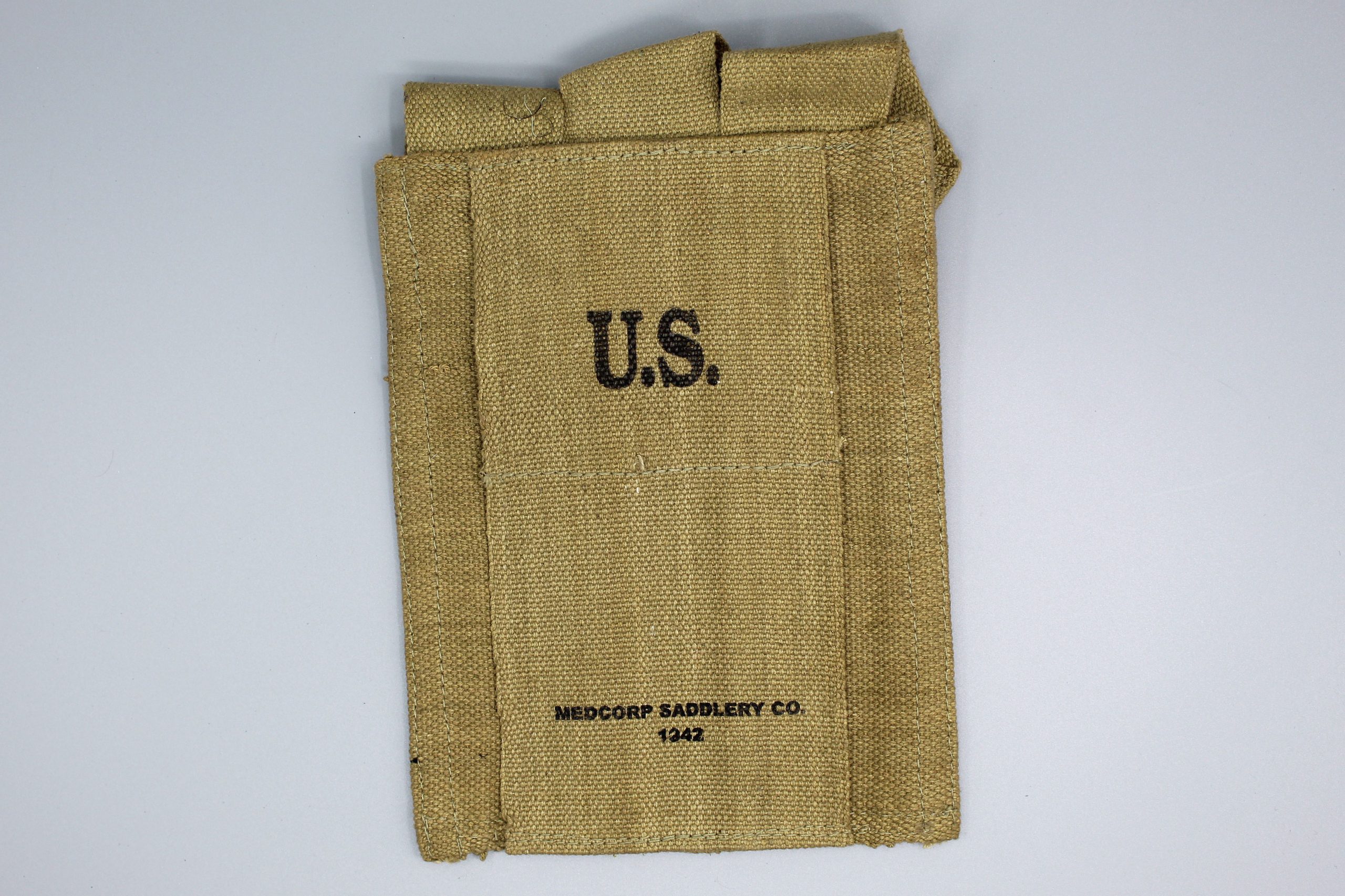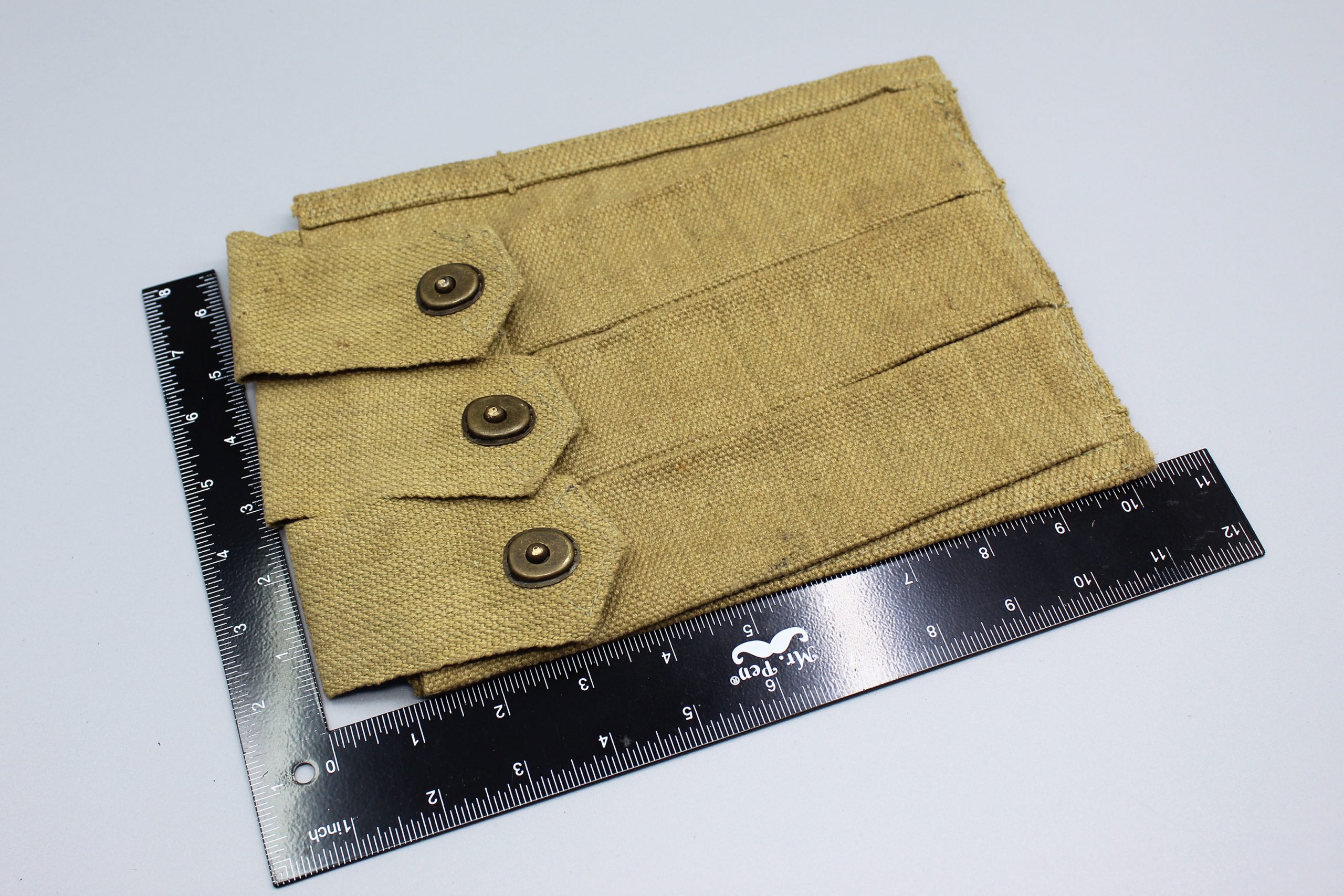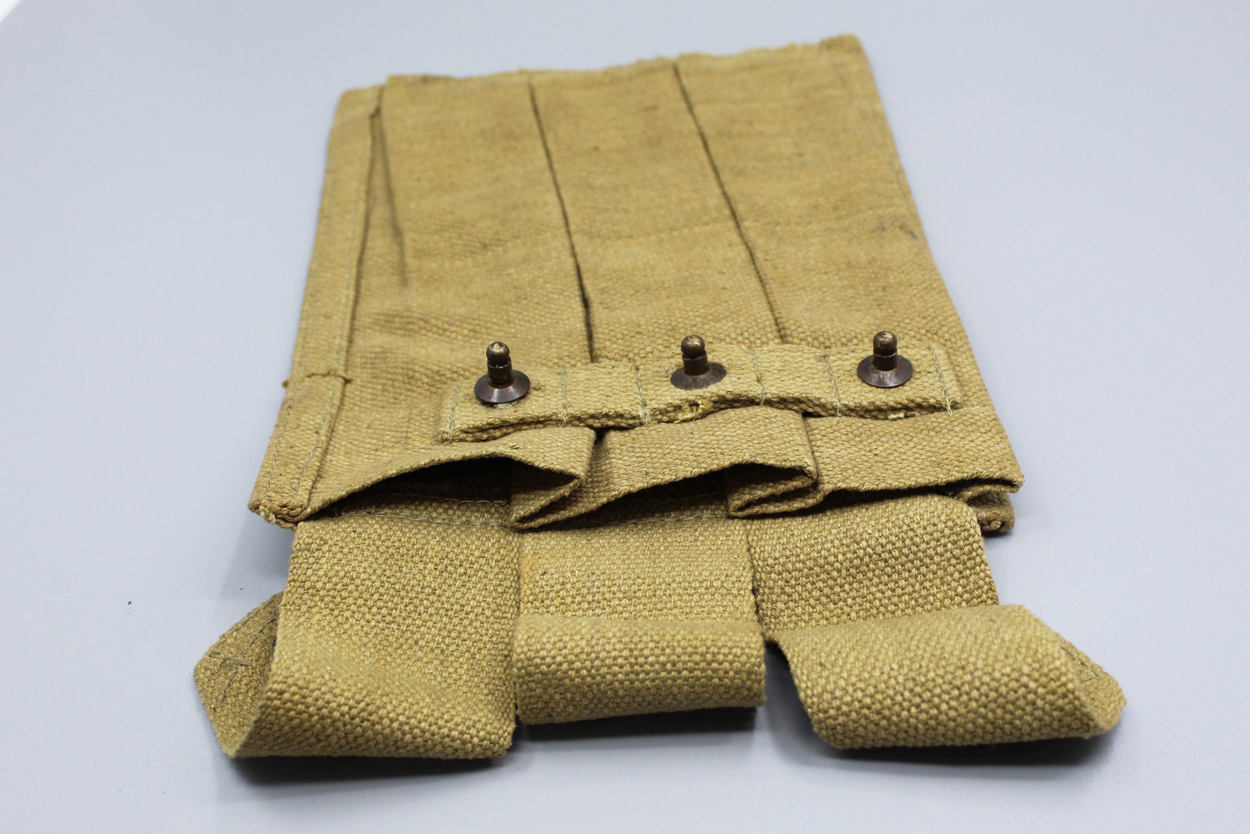 REPRODUCTION 3 Pocket U.S. Army Magazine Pouch. Marked on back of pouch. New made item. This is a reproduction piece of field gear. Size approximately 10 1/4 inches X 6 1/2 inches. Used and worn condition.