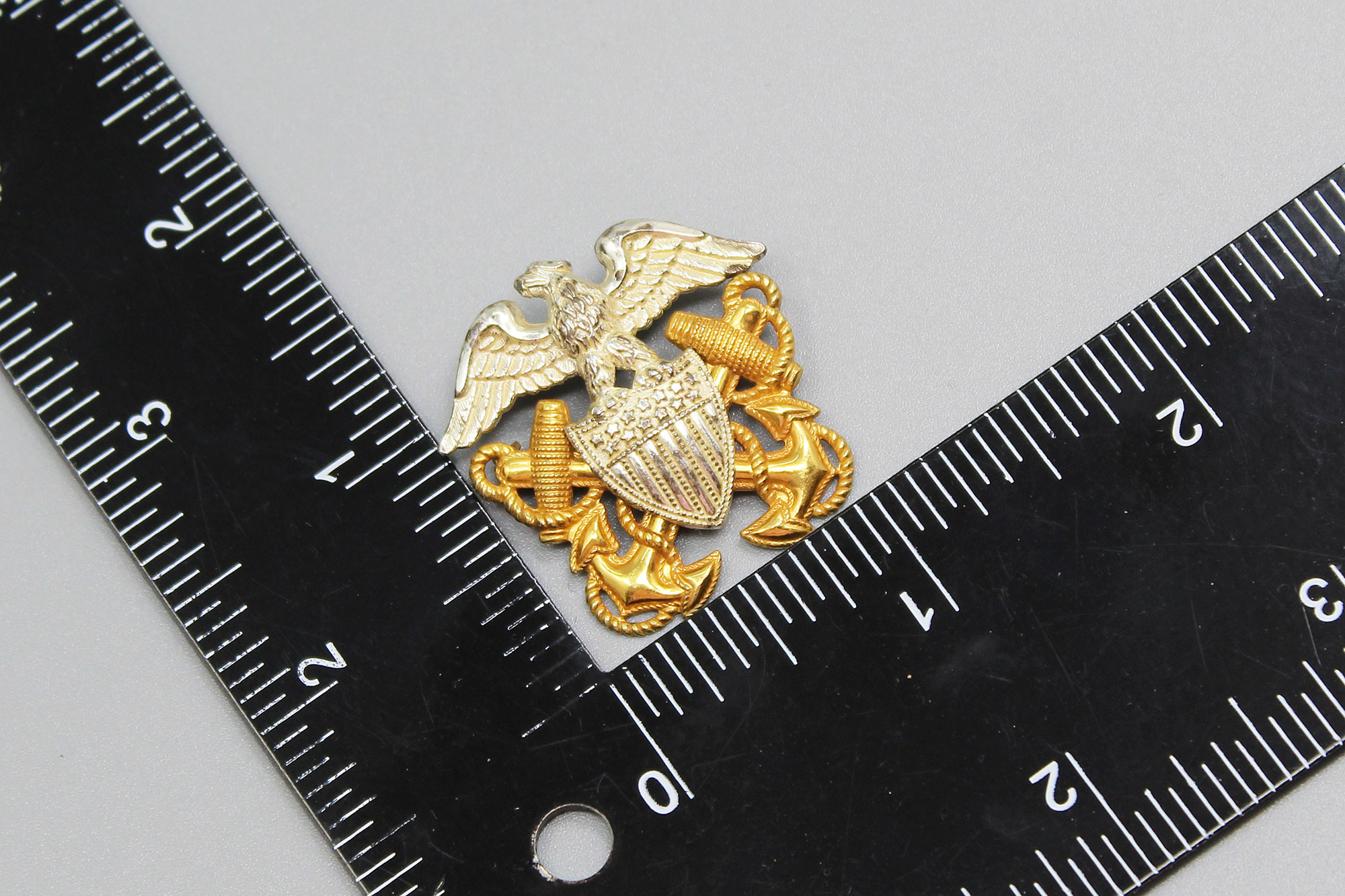 U.S. Navy Officer Small Pin. Appears to be multi-piece construction. Pin back. Marker marked on back Vanguard Sterling 1/20th 10K GF. Size approximately 1 1/4 inches x 1 1/8 inches. Most likely 1940s-1950s (WW2-Korea) era.
