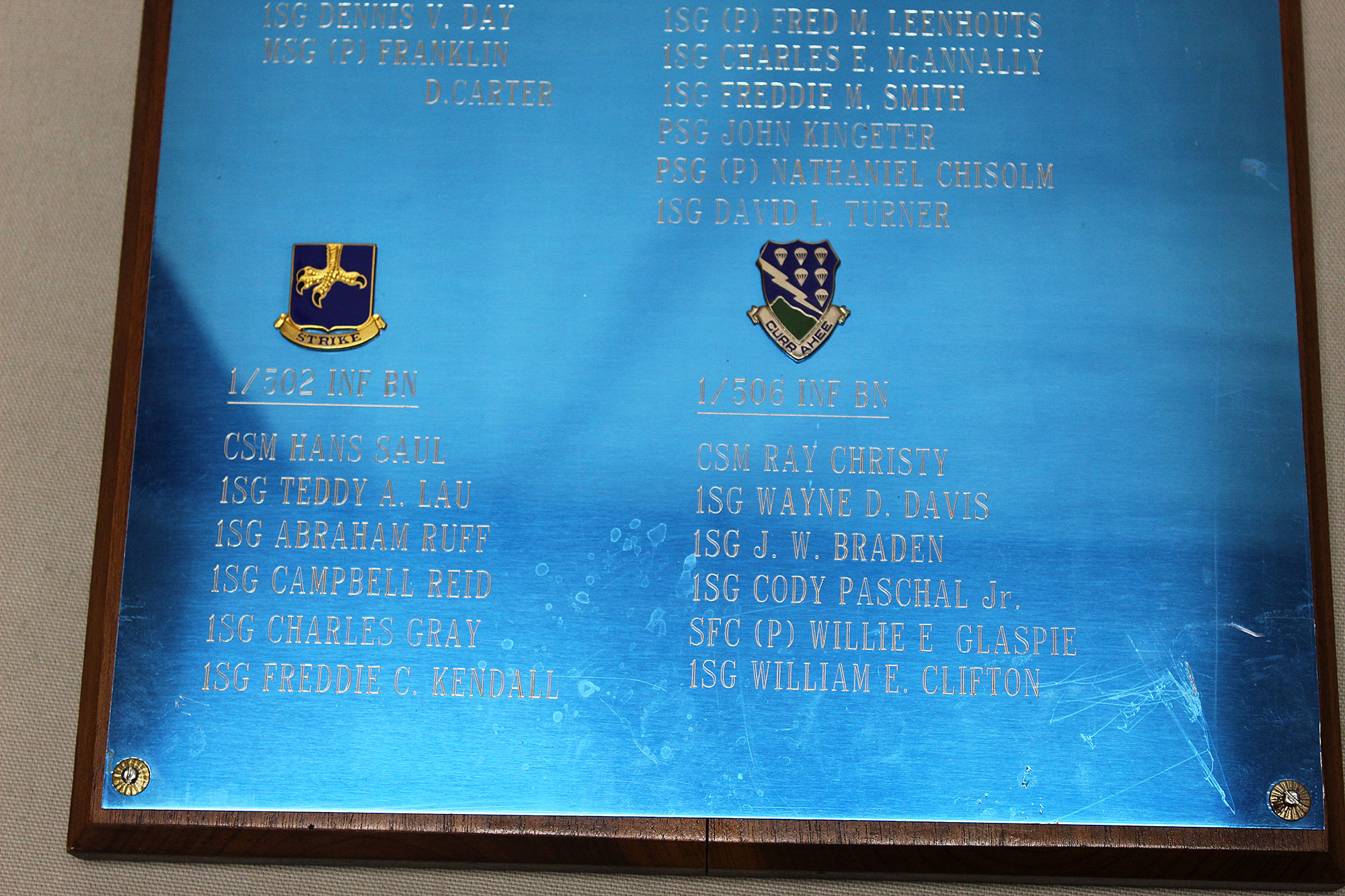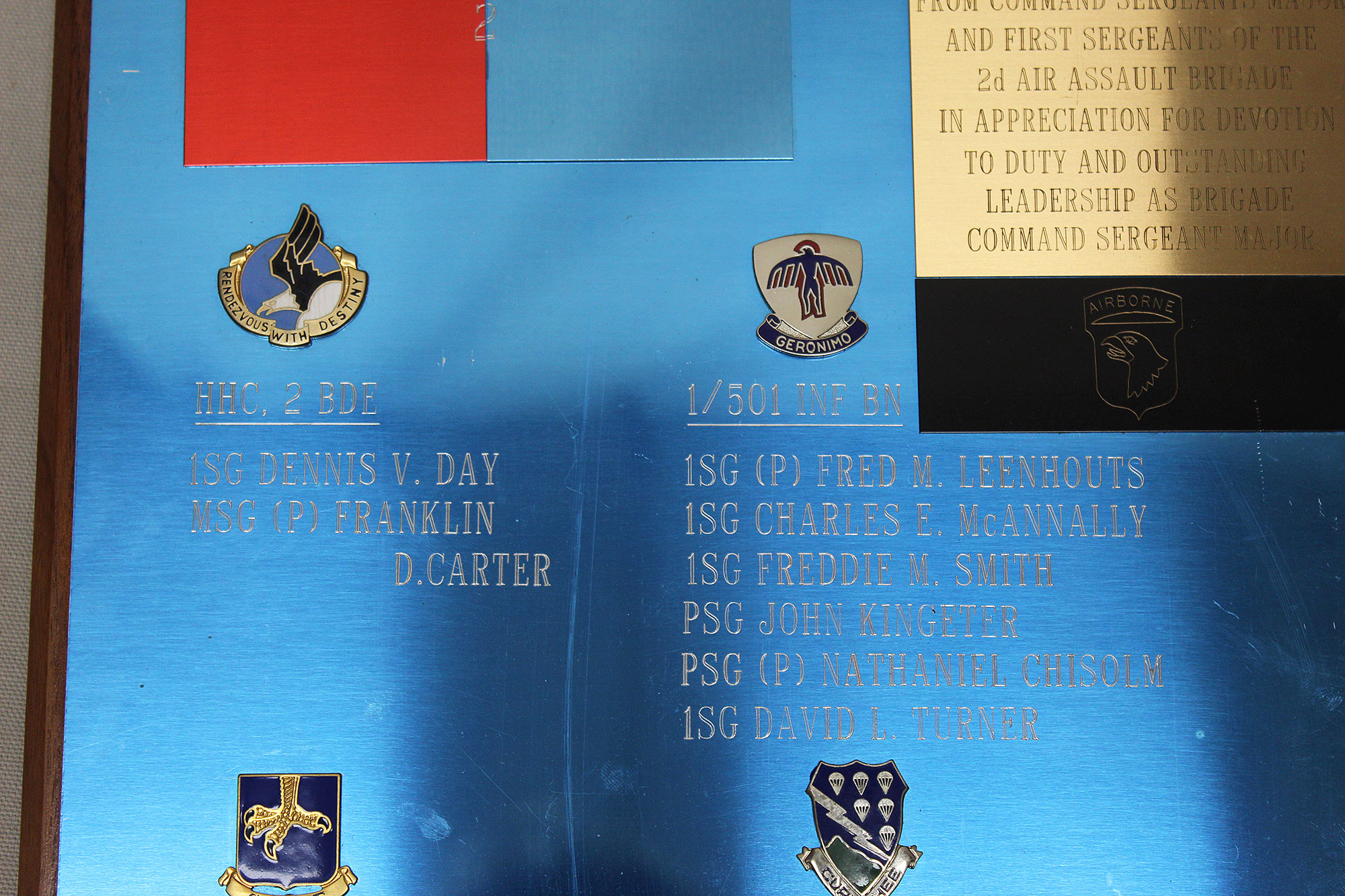 United States Army 101st Airborne Division 2nd Air Assault Brigade Presentation Plaque to Command Sergeant Major Albert Neal (appears to be a retirement or appreciation type plaque). There are 4 Distinctive Unit Insignias attached to plaque with names listed below each section. Size approximately 16 inches x 12 inches. Worn condition.
