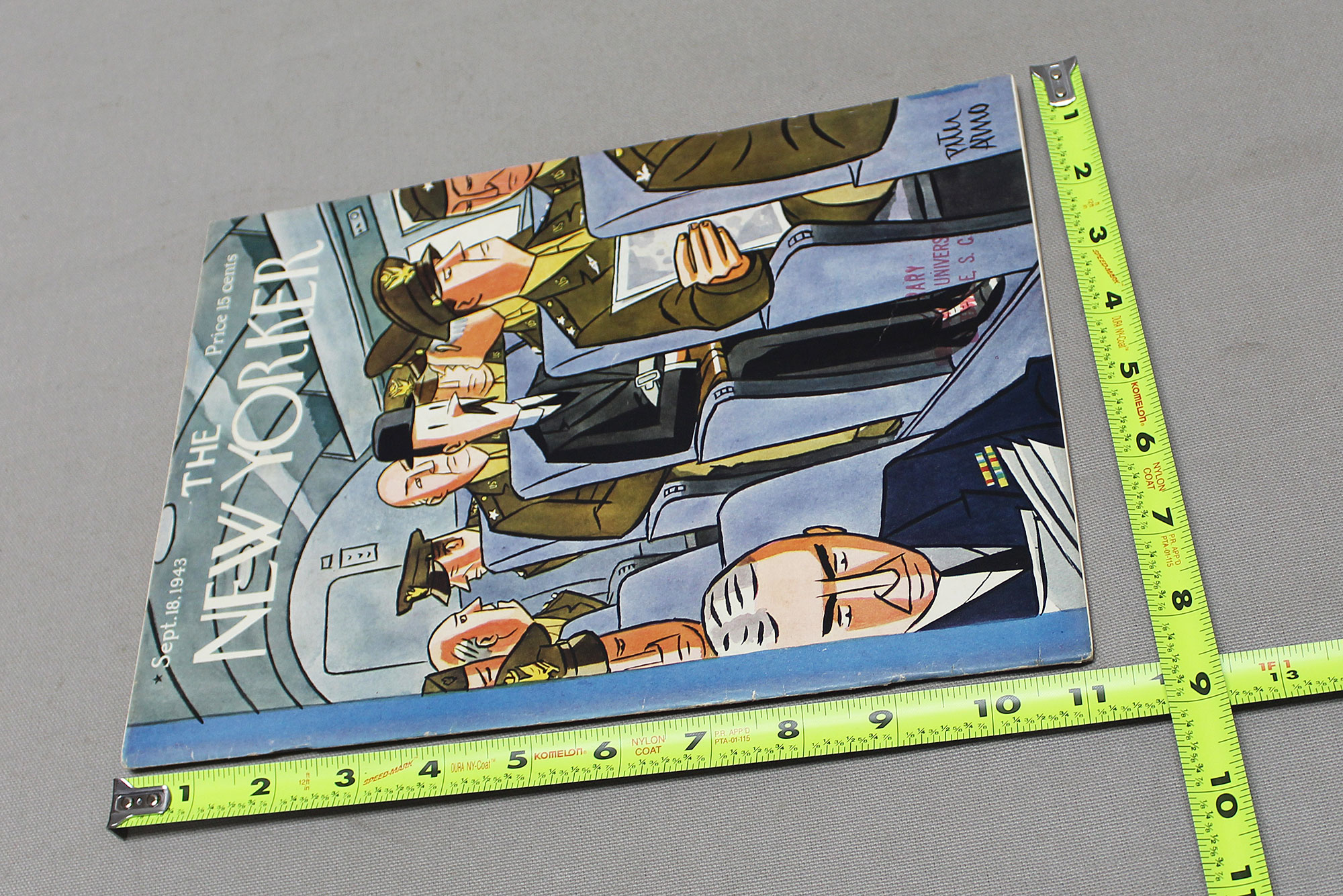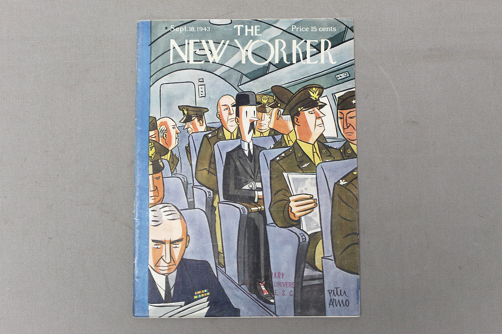 The New Yorker Magazine from September 18, 1943. WW2 Era magazine. University Greenville SC red ink stamp on front cover. Worn and used condition.