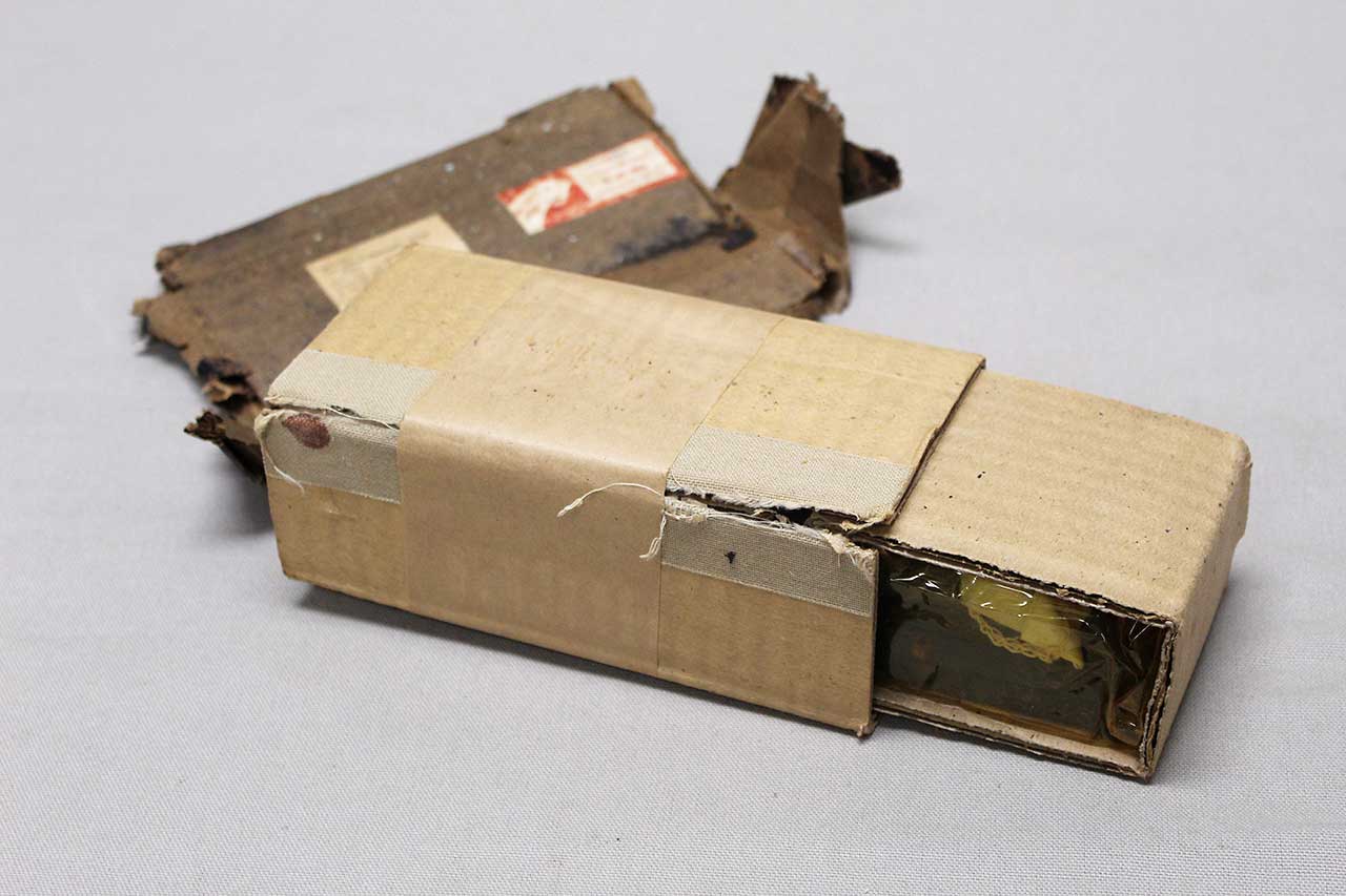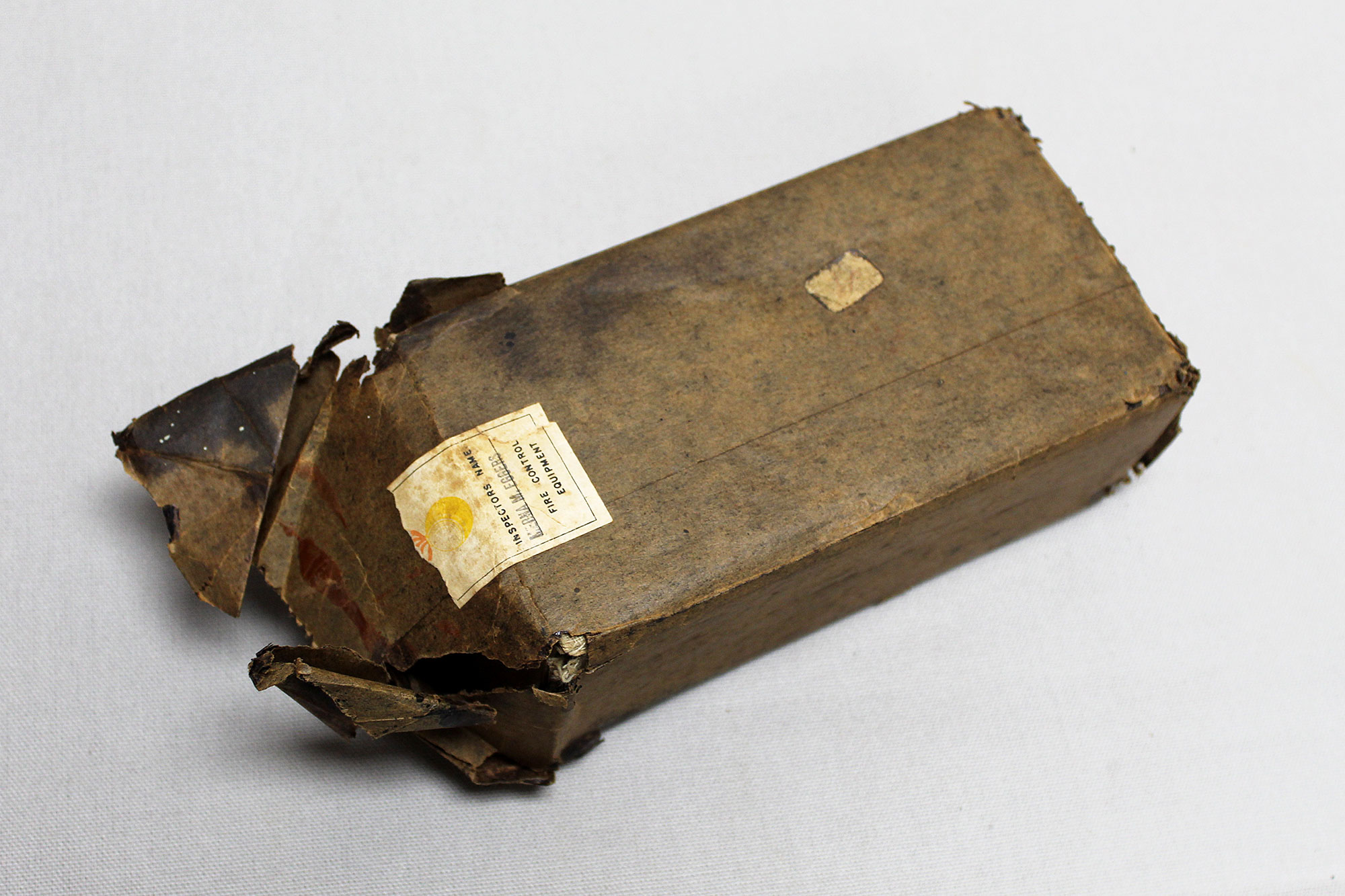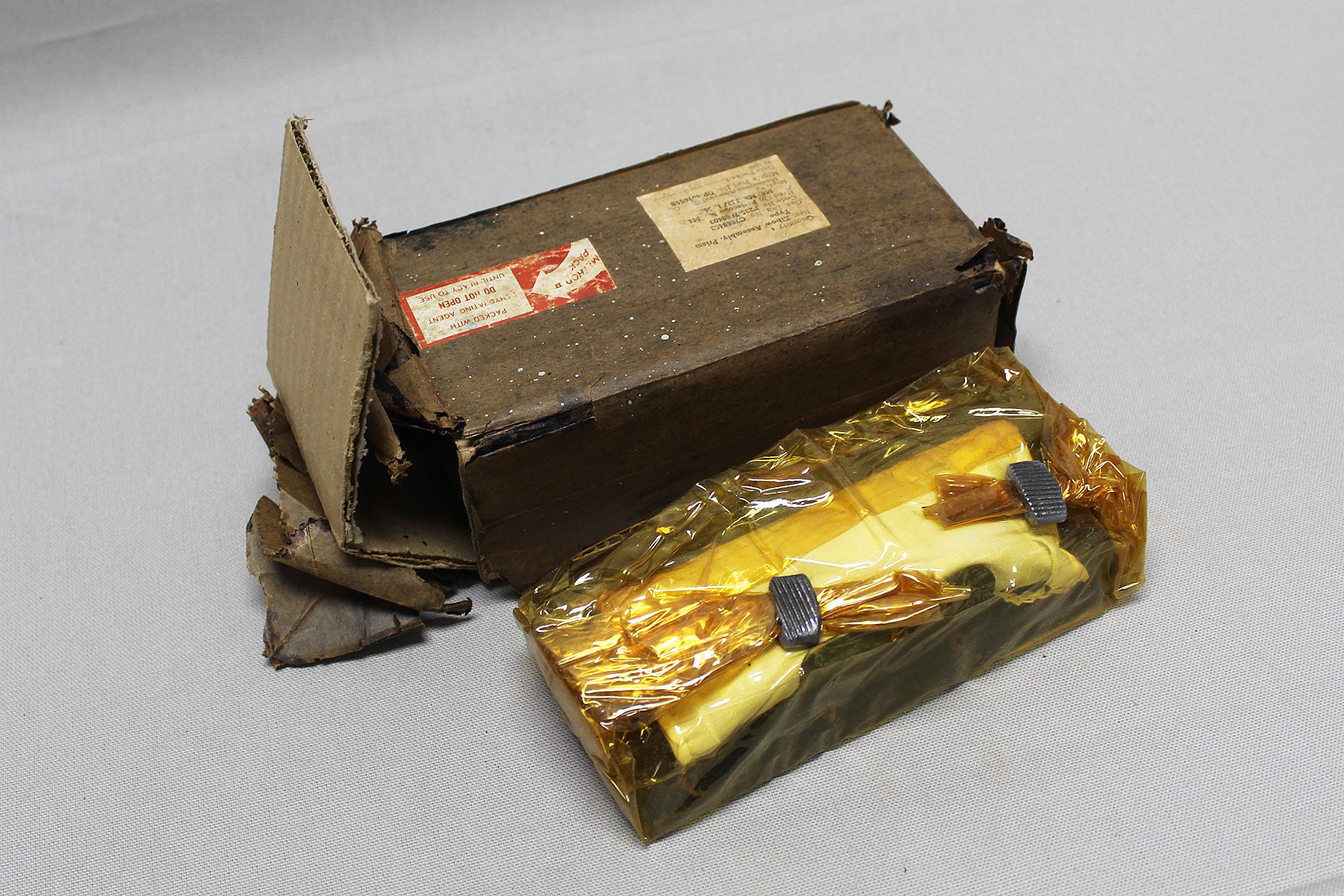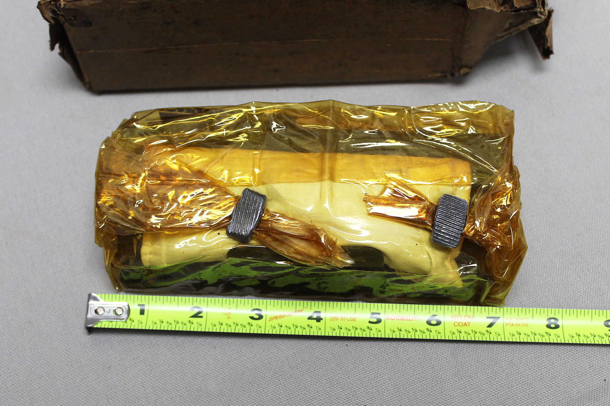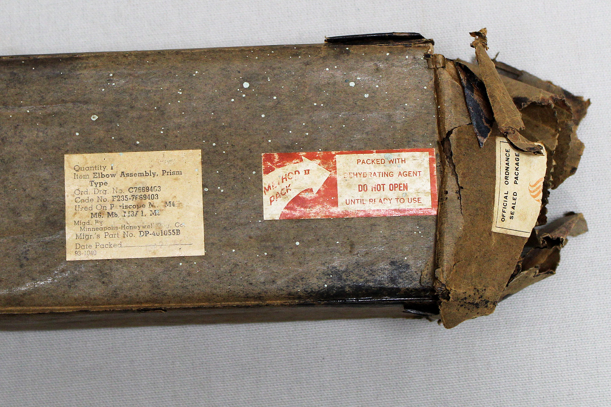 United States Periscope Head Assembly Prism Type in box for the Sherman Tank Periscope. Label on box with inspector label as well. Size of box approximately 7 inches x 3 1/2 inches. Most likely 1940s-1950s (WW2-Korea) era. Box in very heavily worn and damaged condition.