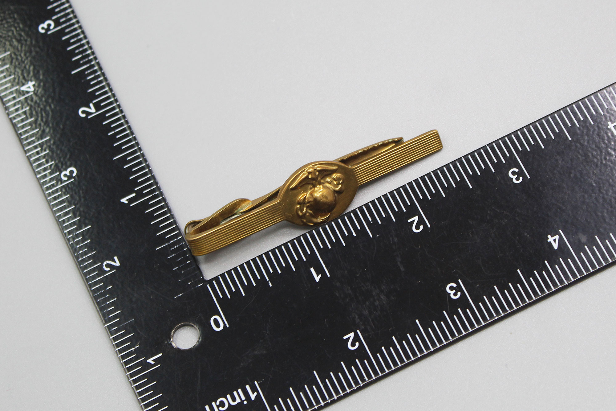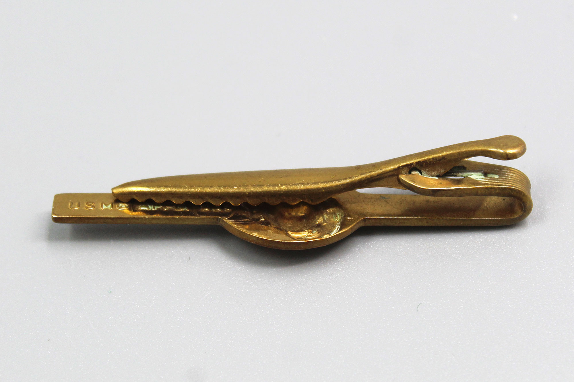 United States Marine Corps (USMC) Tie Clip. Marked on back USMC APPD. 536. Size approximately 2 1/2 inches across. Worn condition.