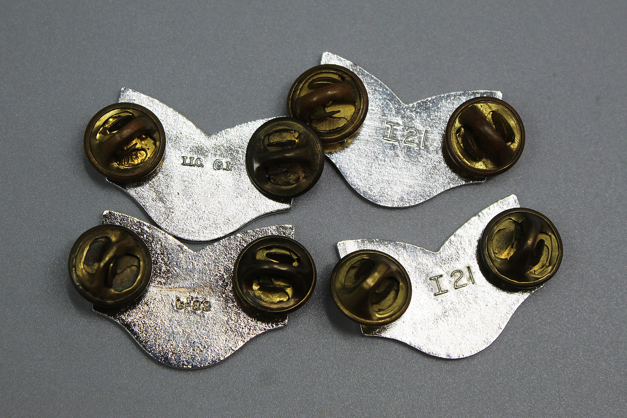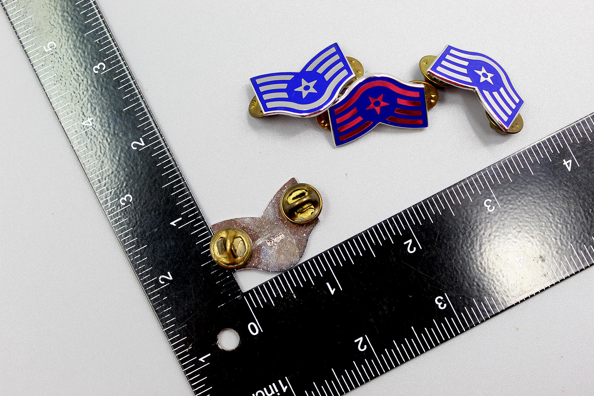 United States Air Force (USAF) Tech Sergeant Group of 4 Insignia. Clutch back. Various maker marks on back. Worn condition.