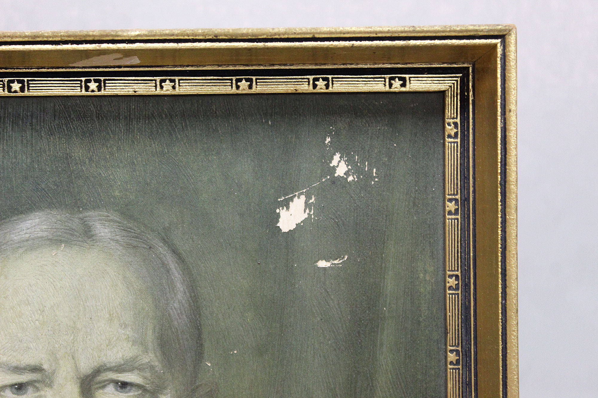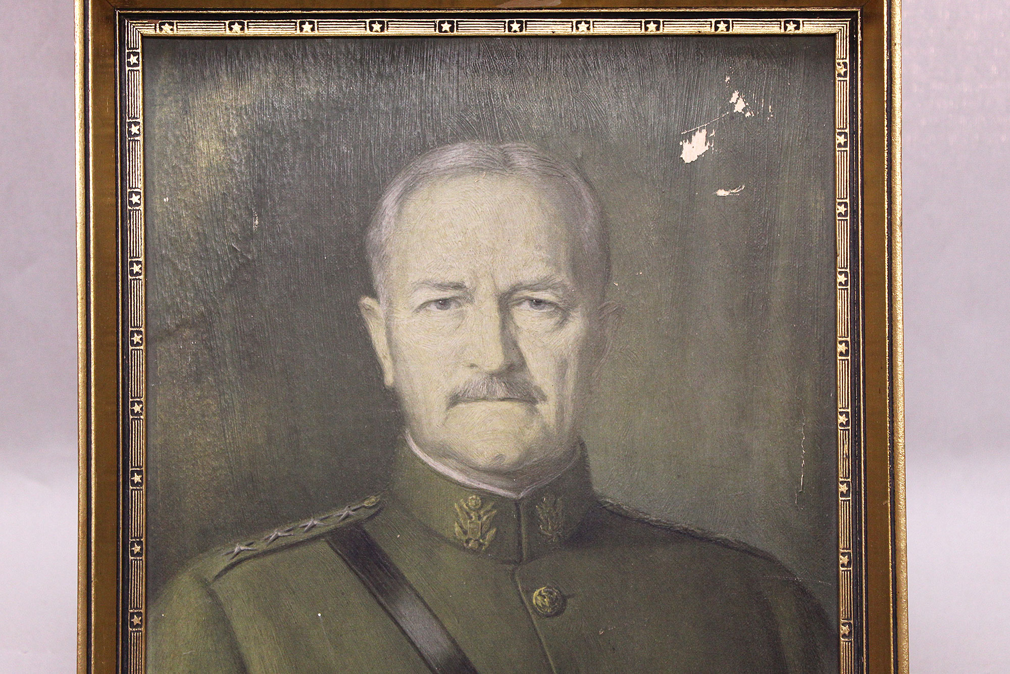 United States General Pershing Framed Portrait Print 1938. Size approximately 15 inches x 12 inches. Worn condition with some wear to front upper portion.