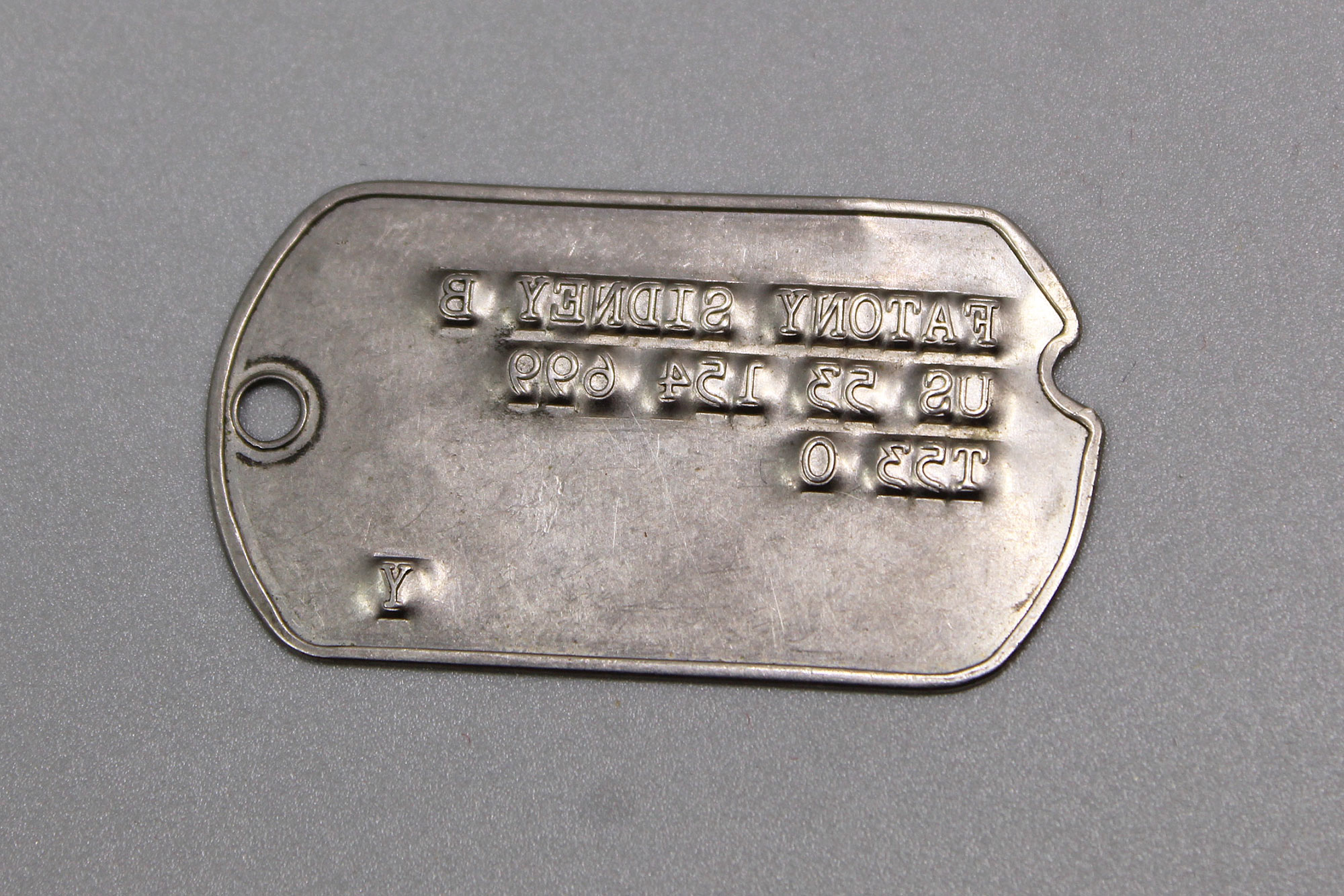 United States Army Single Notched Id Tag “Dog Tag”. The face of the id tag includes the individual’s name, service number (US 53 154 699), the tetanus vaccination letter “T” with the dates of vaccination of T53 (Korea). the blood type “O”. Notched dog tag (typically used on WW2 and Korea era tags). Worn condition.