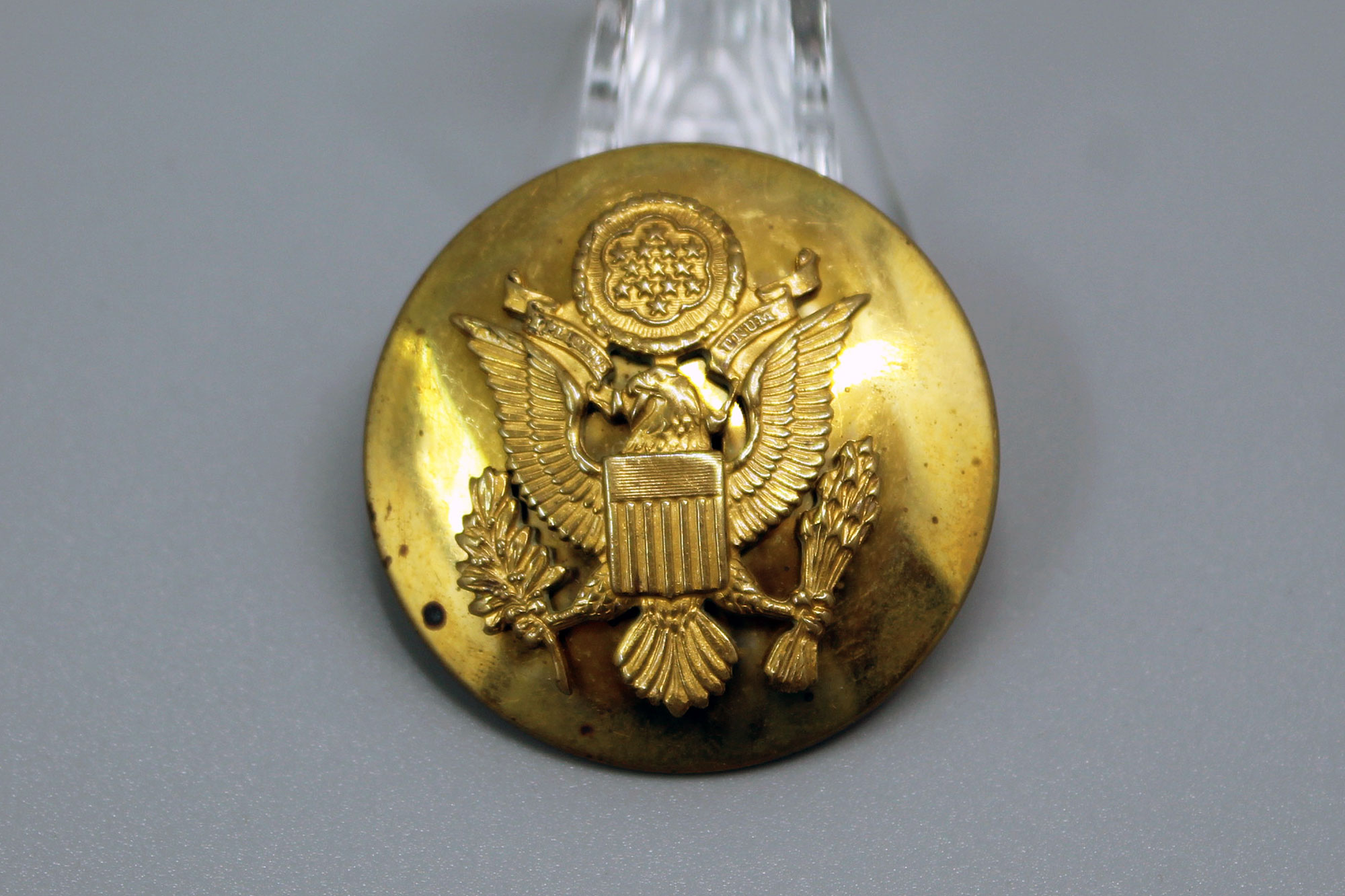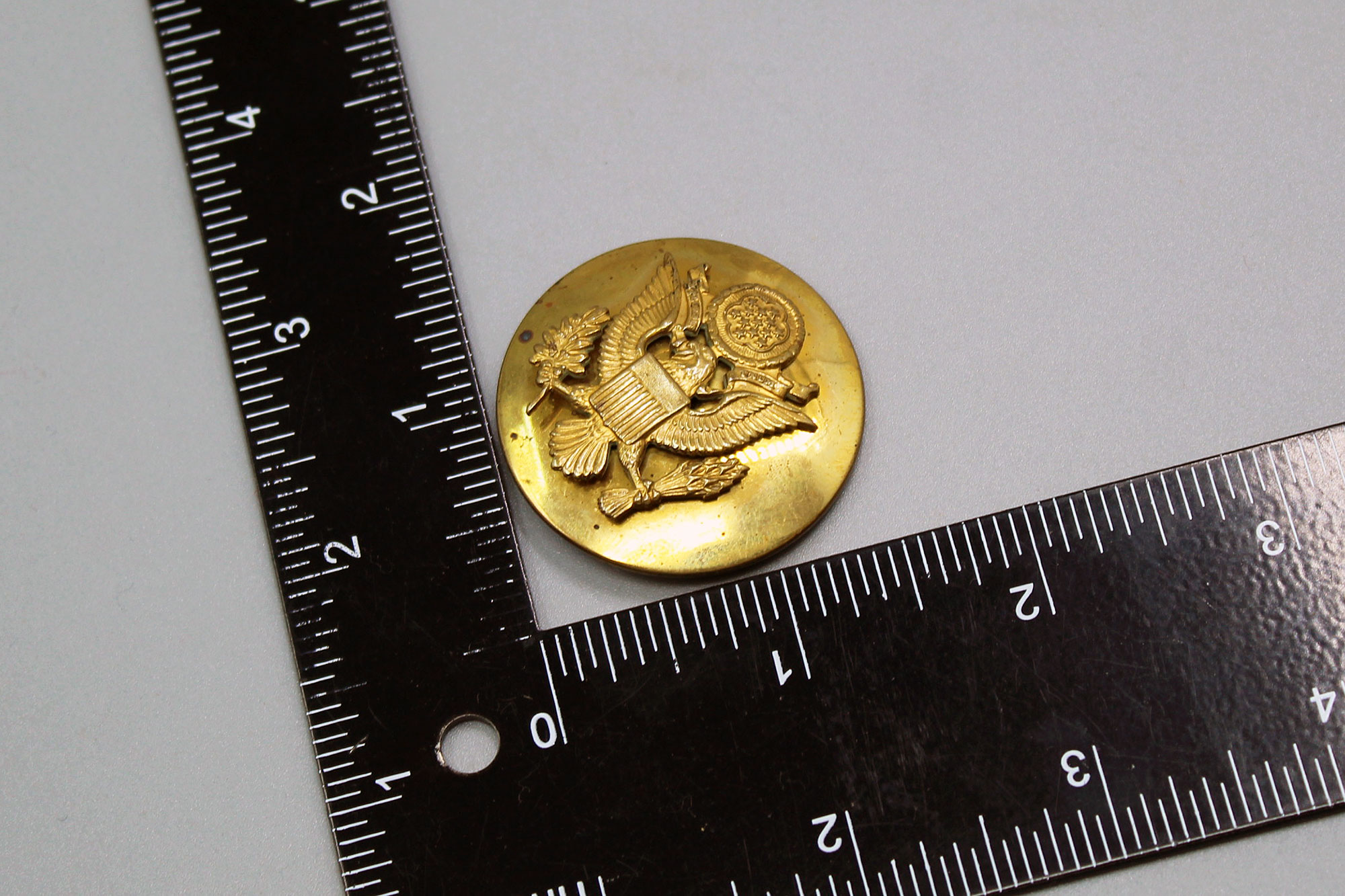 United States Army enlisted man (em) visor cap eagle. Brass screw post attachment. Most likely 1940s-1970s era. Worn condition.