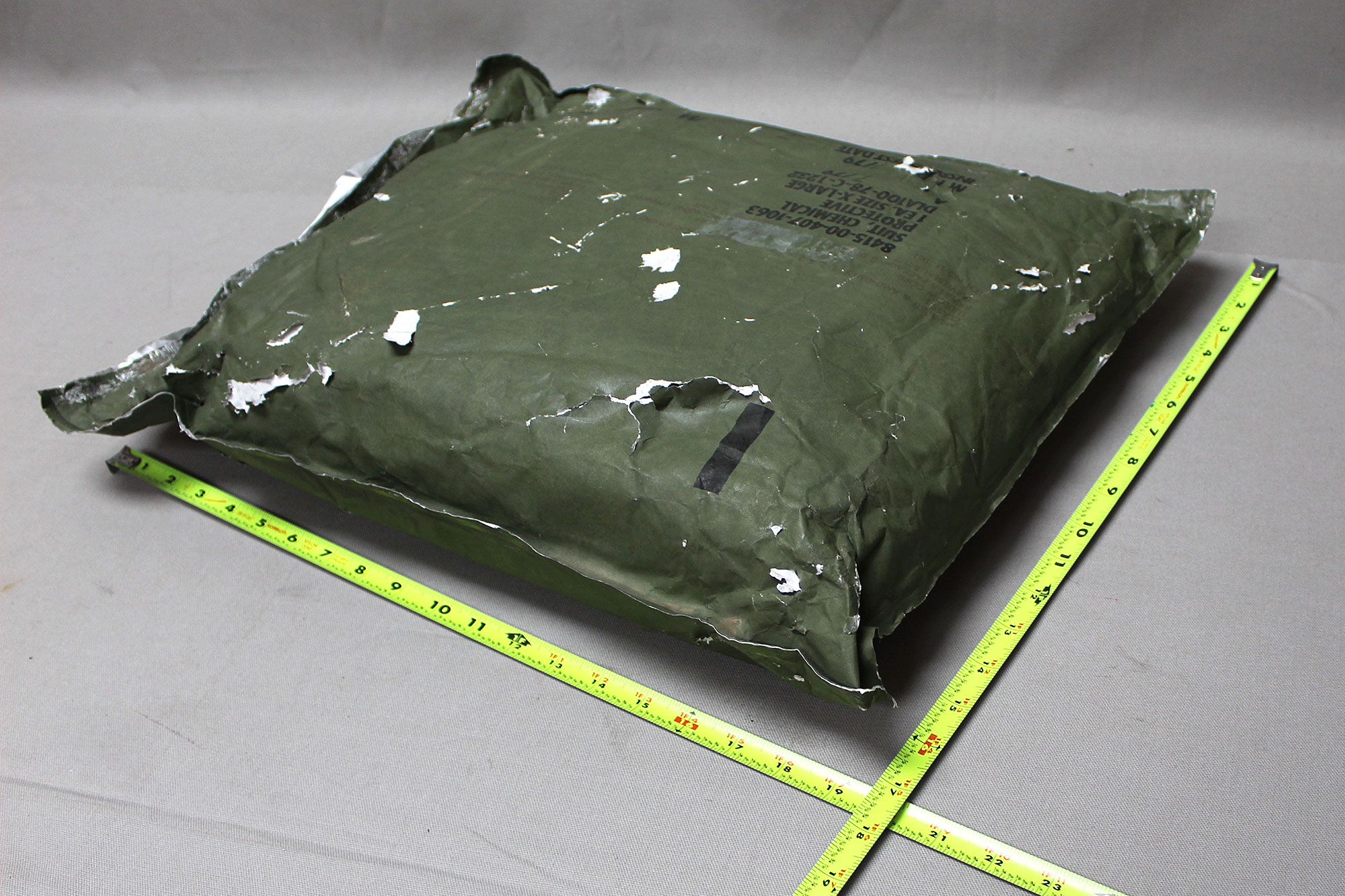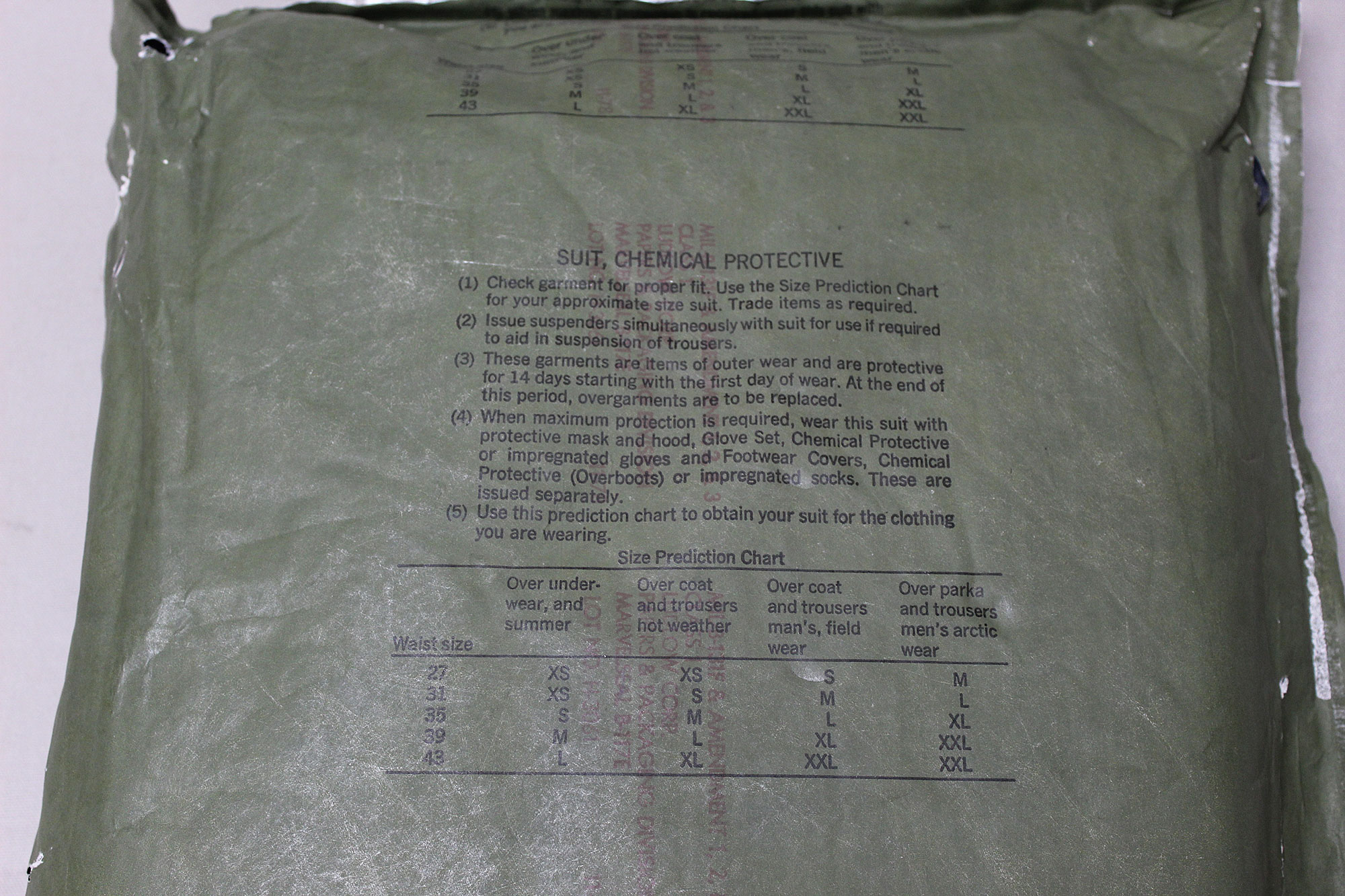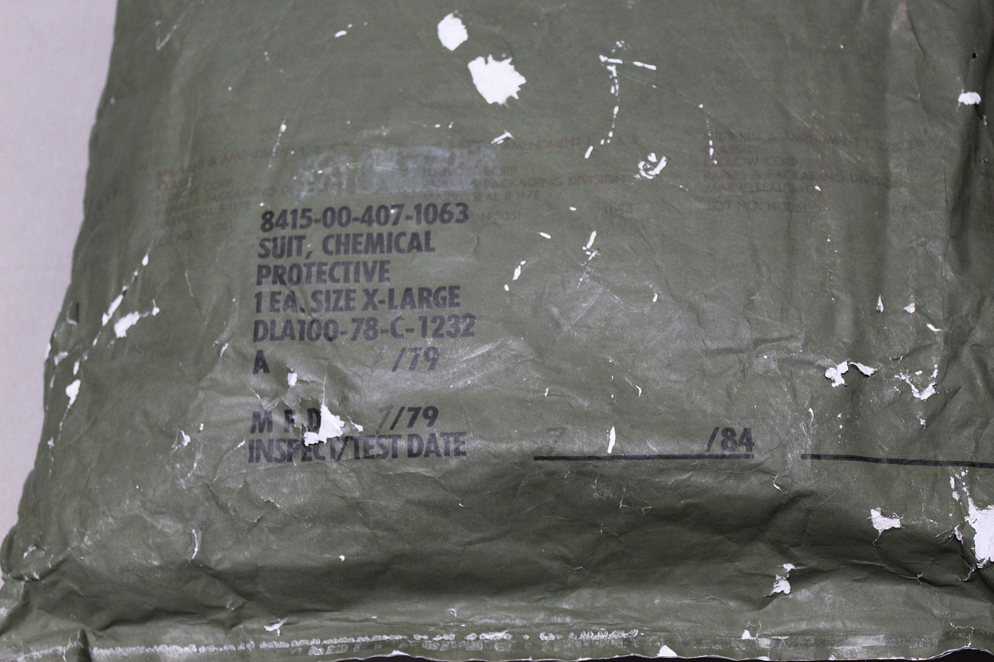 United States Military Chemical Protective Suit. Outer package very rough condition with wear and tears. Size marked X-Large on outer package. Contract dated (DLA-100-78-C) 1978 and 1979. Worn condition outer packaging.