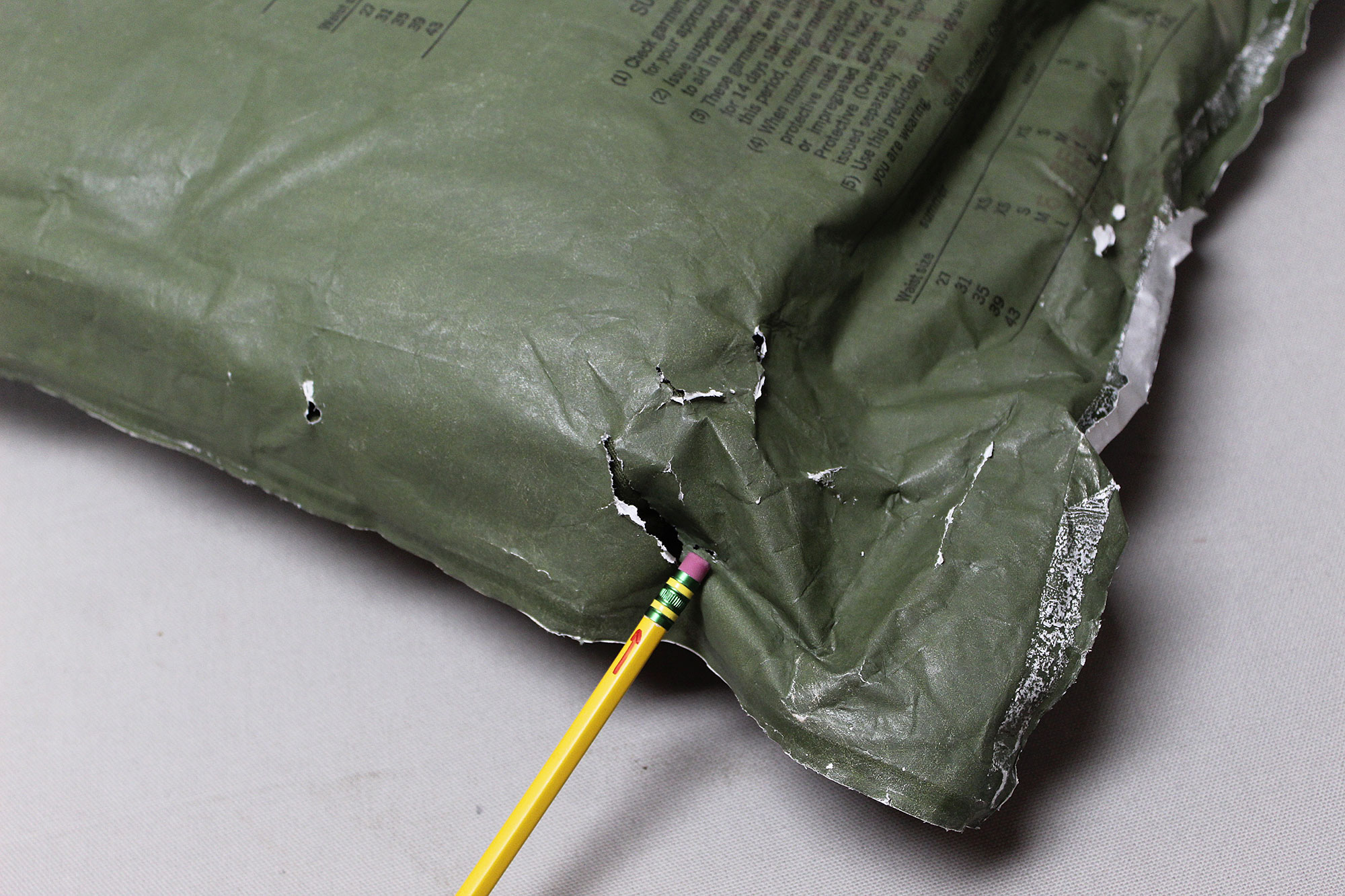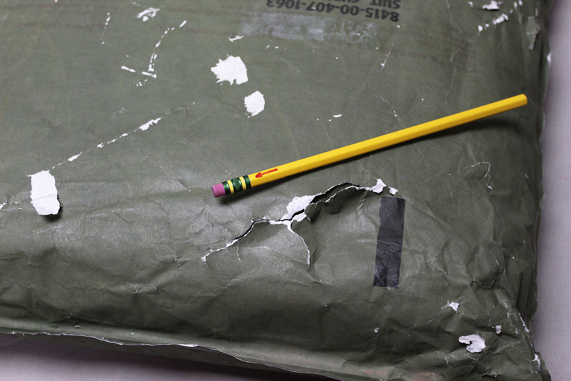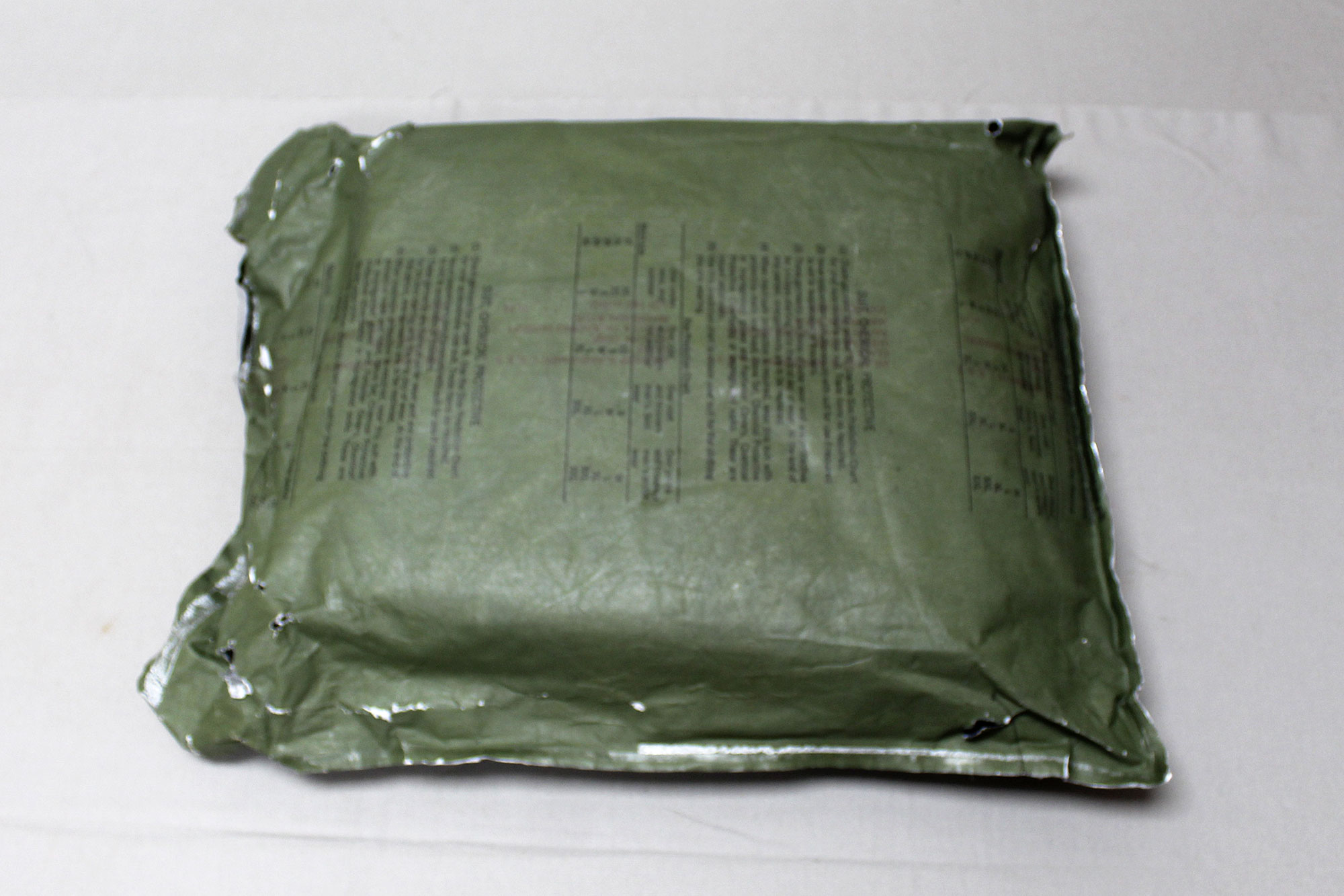 United States Military Chemical Protective Suit. Outer package very rough condition with wear and tears. Size marked X-Large on outer package. Contract dated (DLA-100-78-C) 1978 and 1979. Worn condition outer packaging.