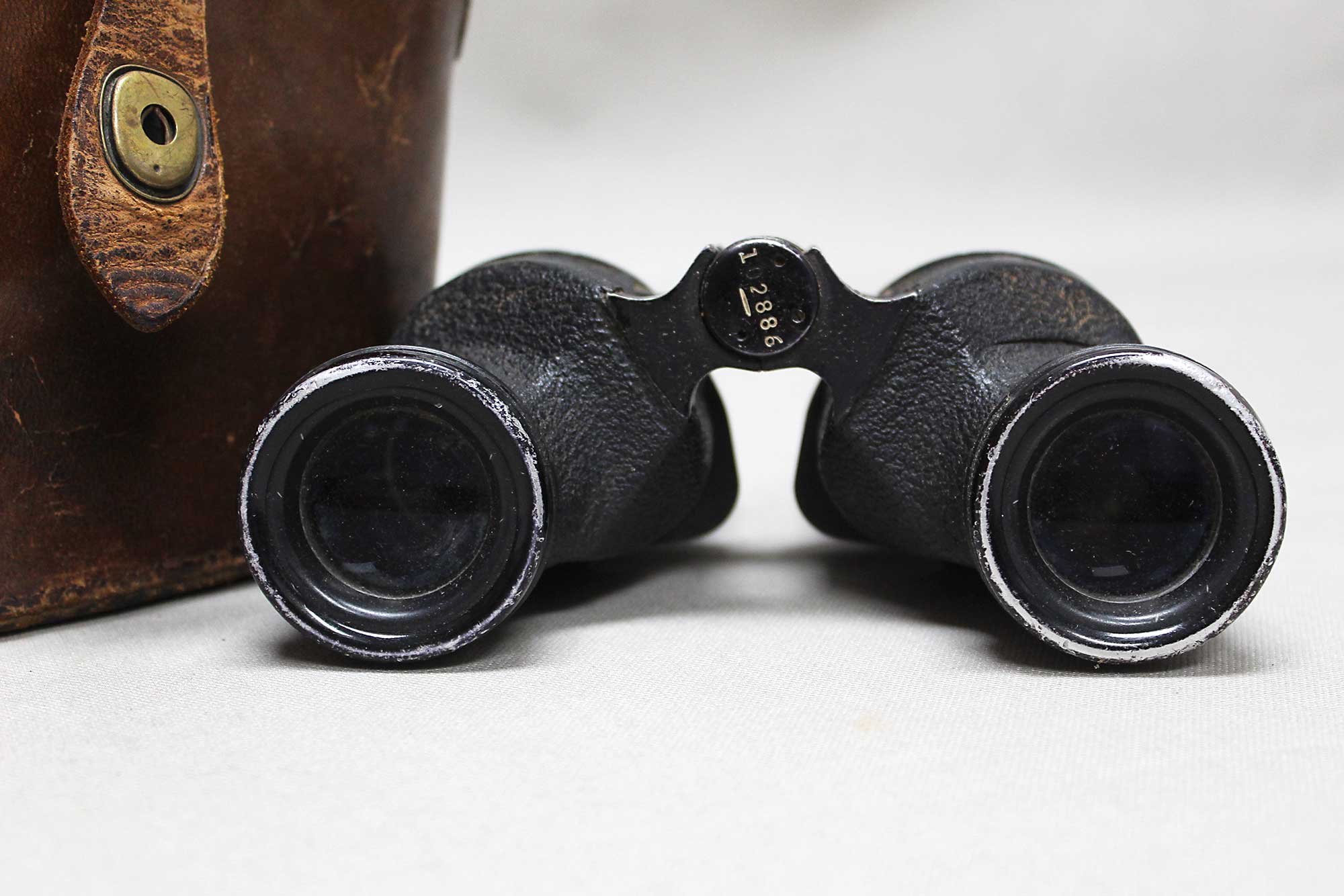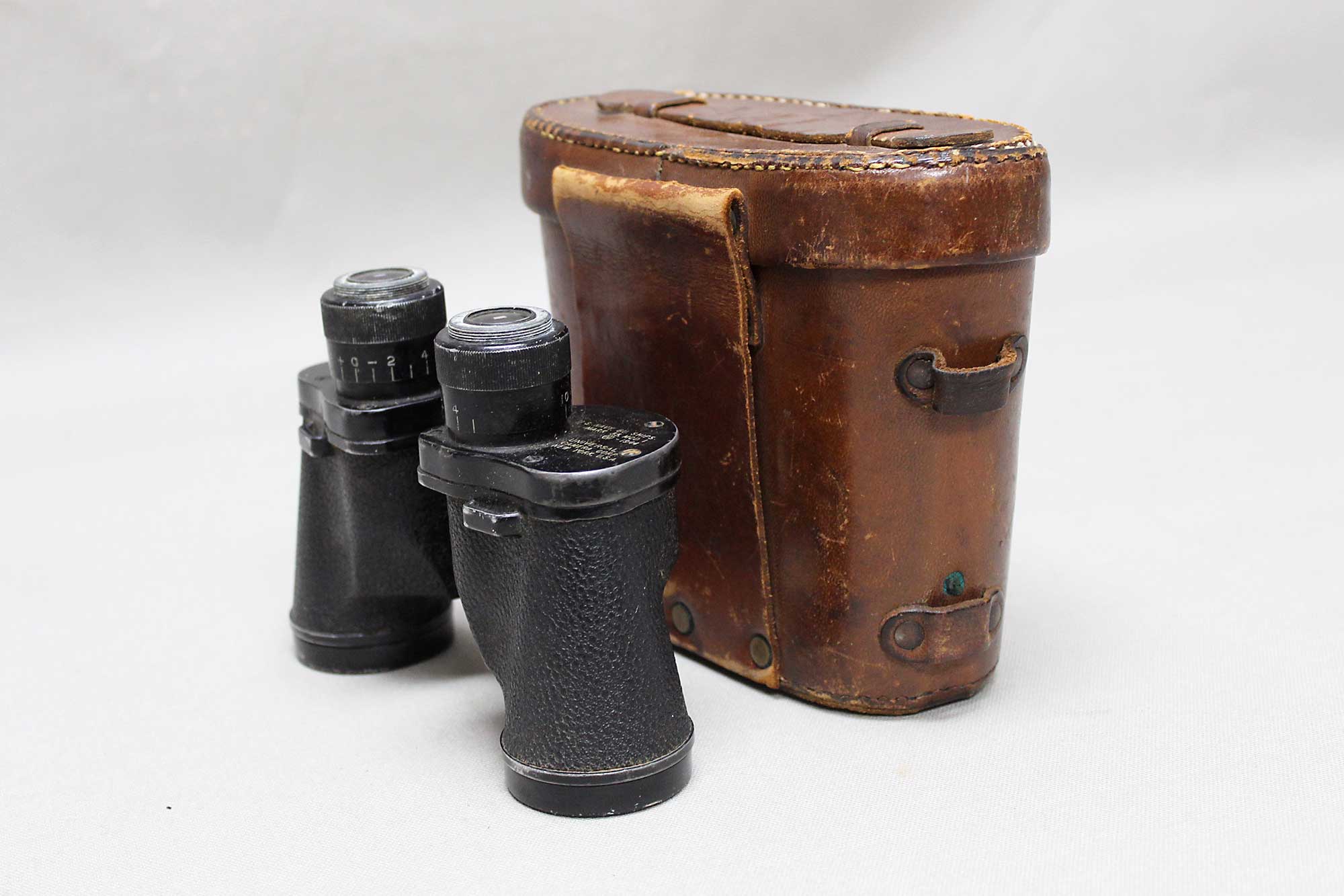 United States Navy 6X30 binoculars with a case. Binoculars also marked BU Ships 33 Mod.1 1944 and Universal Camera Corp New York USA. Optics in good condition with a couple of black specs, however, no crosshairs or range finder marks in the optics. Missing the screw-on eye caps. Very worn condition case, which is also marker marked Bausch & Lomb USA. 1940s (ww2) era. Overall worn condition.