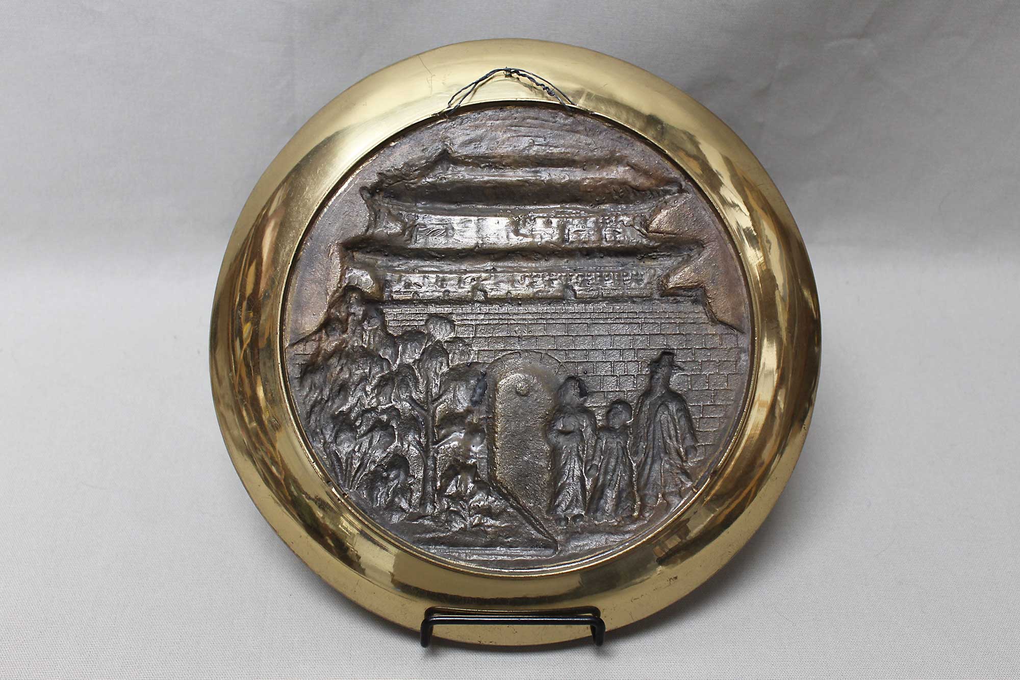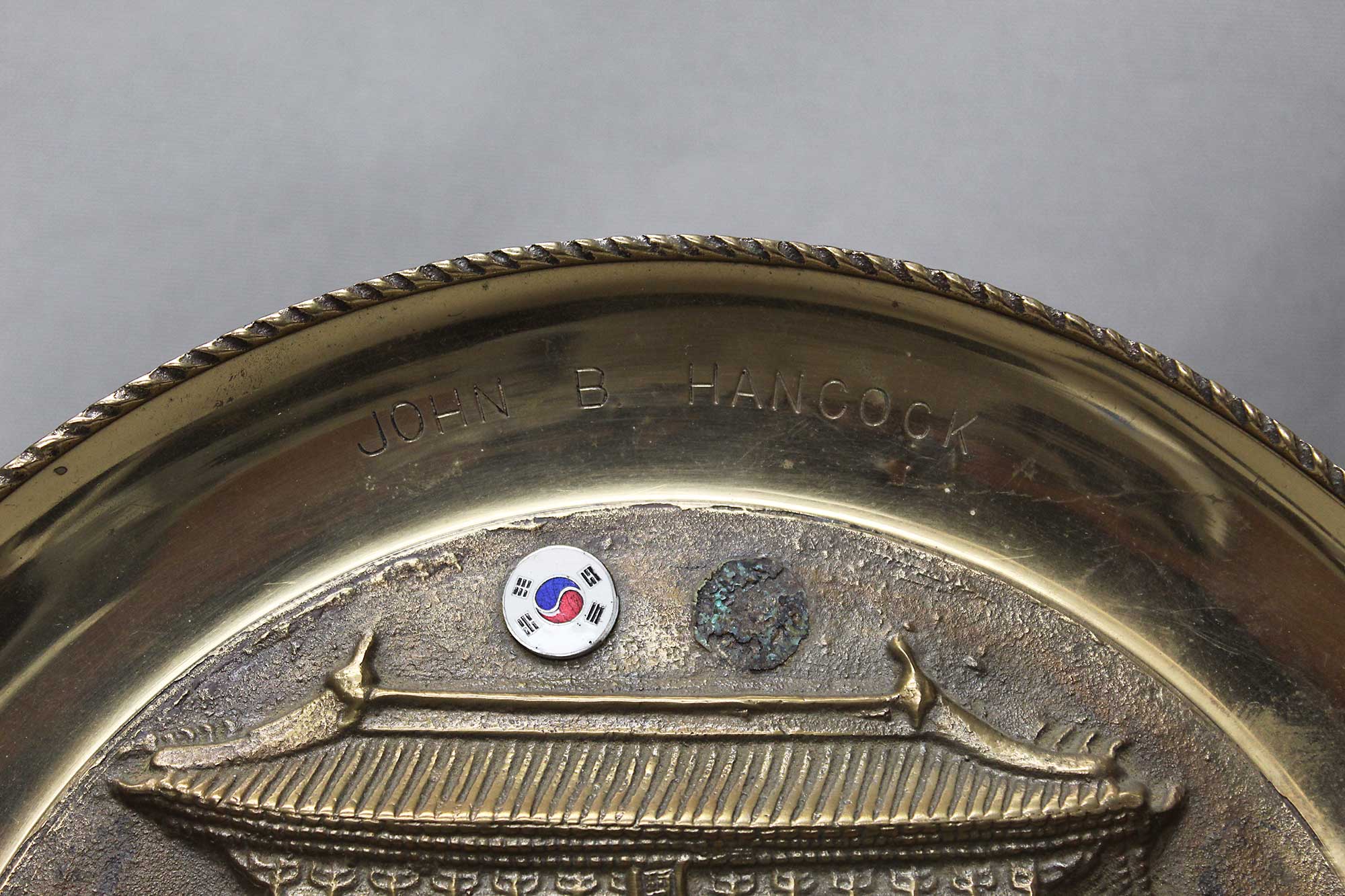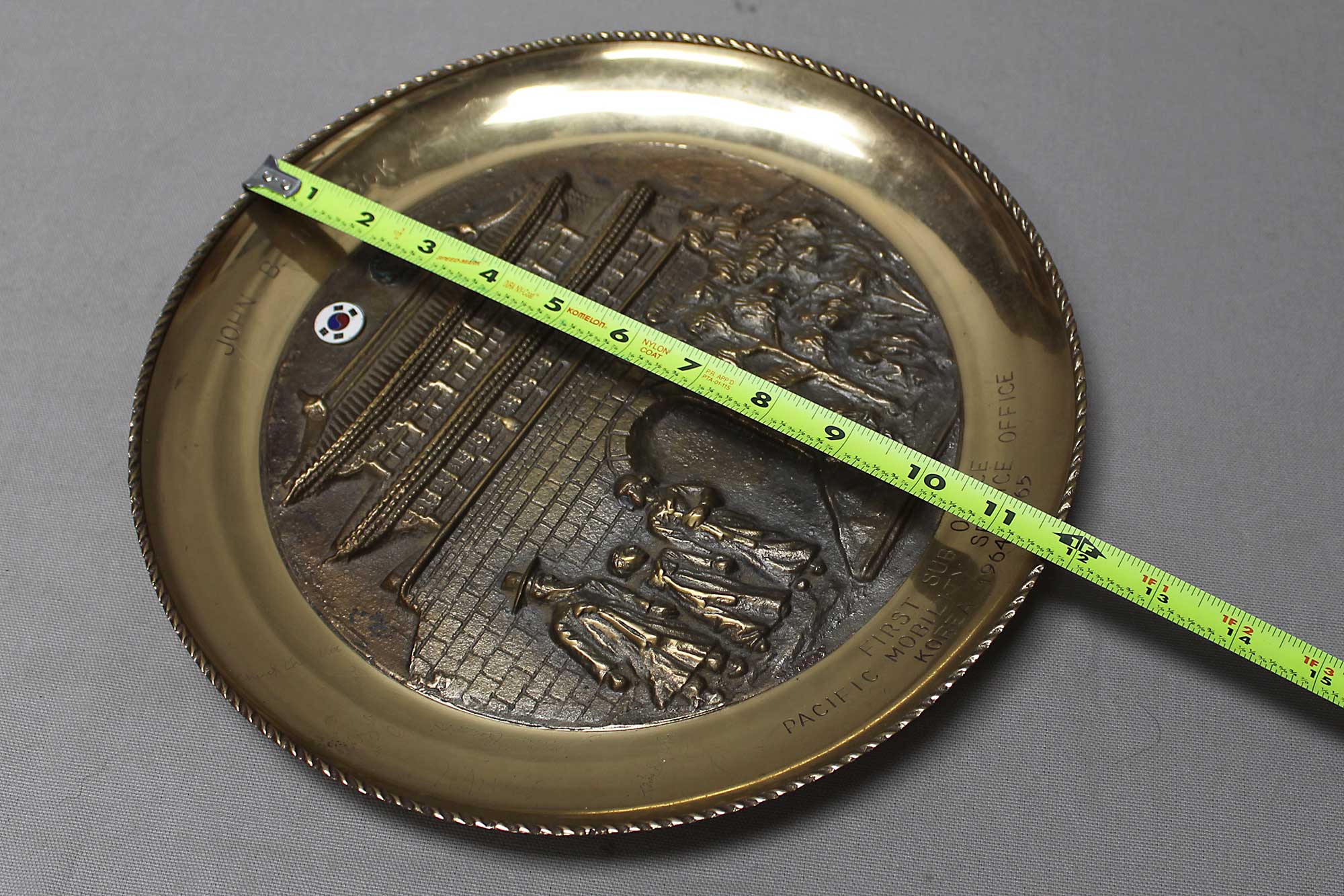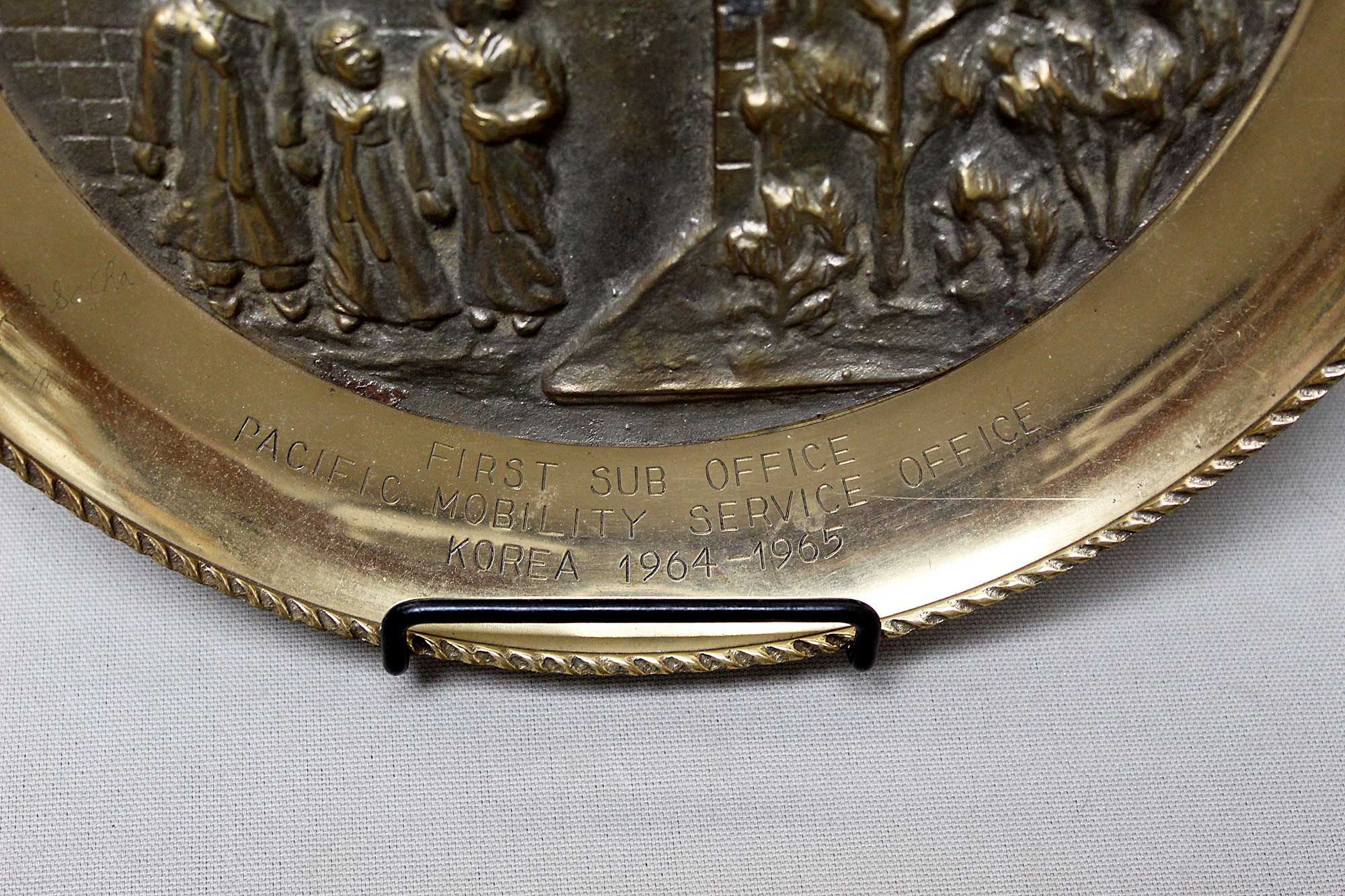 United States Brass Plaque First Sub Office Korea. Engraving on top of plaque: John B. Hancock. Engraved on lower portion of plaque: First Sub Office, Pacific Mobility Service Office, Korea 1964-1965. Size approximately 11 3/4 inches across. Worn condition, missing one small round emblem next to the Korea round emblem near top of plaque (can still see the glue residue).