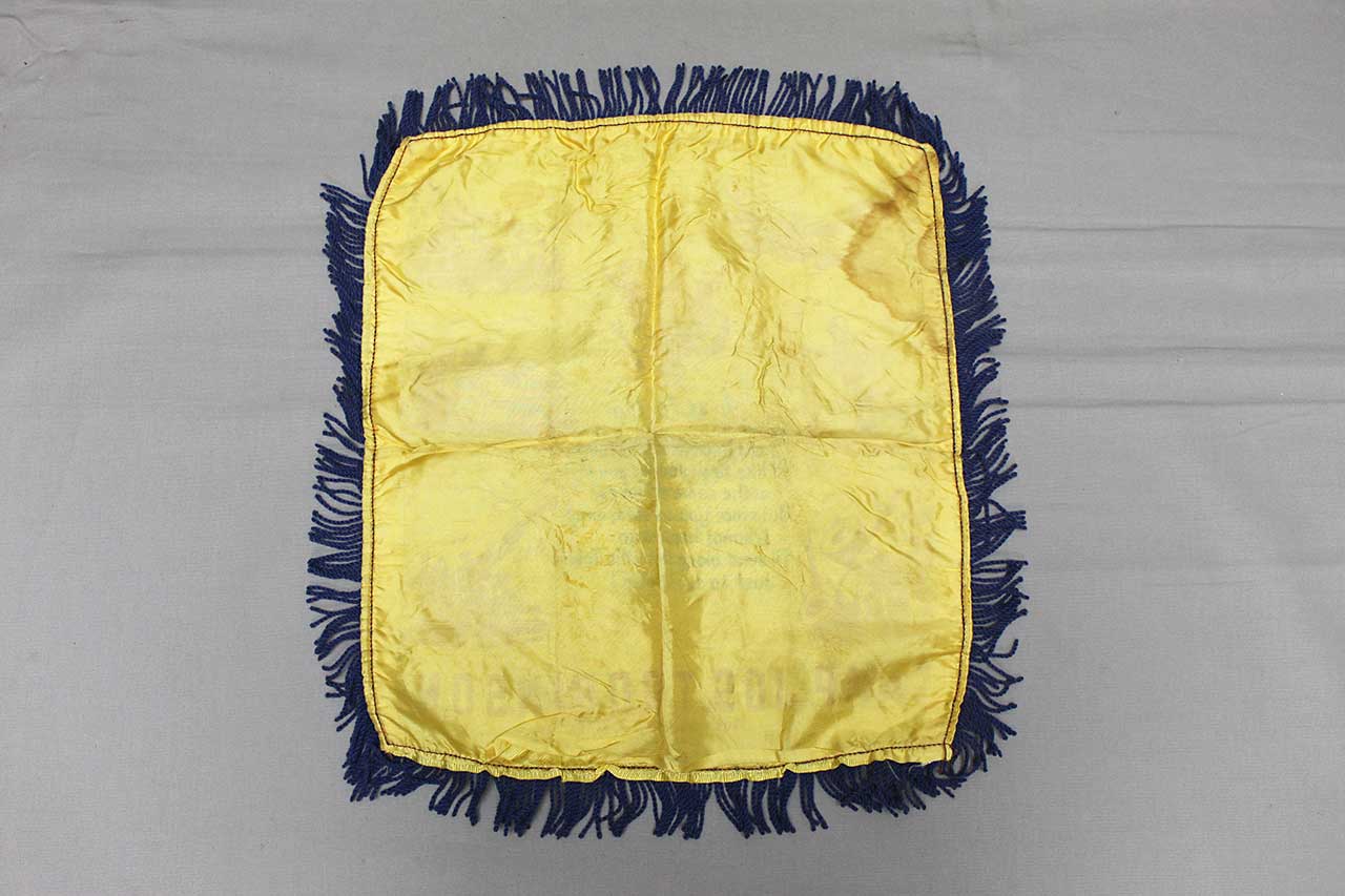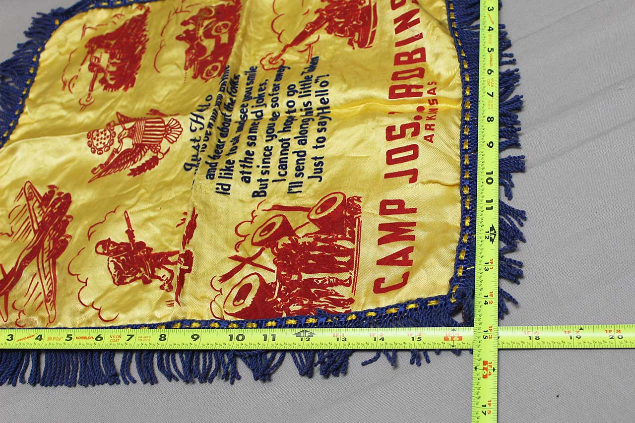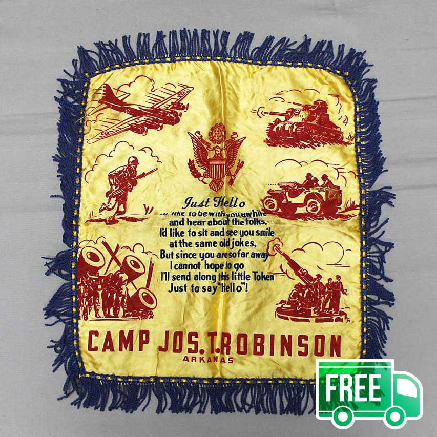 U.S. Camp Jos.T. Robinson, Arkansas GI Souvenir Pillowcase. Yellow background with blue fringe. Just Hello. Size approximately 16 inches X 16 inches. This design of pillowcase was typically from the 1940s-1950s (ww2-Korea) era. Worn condition.