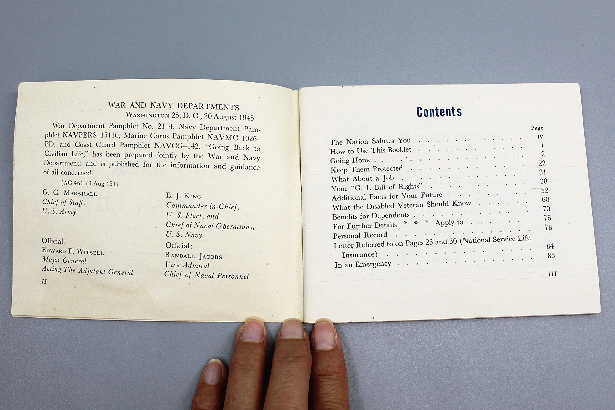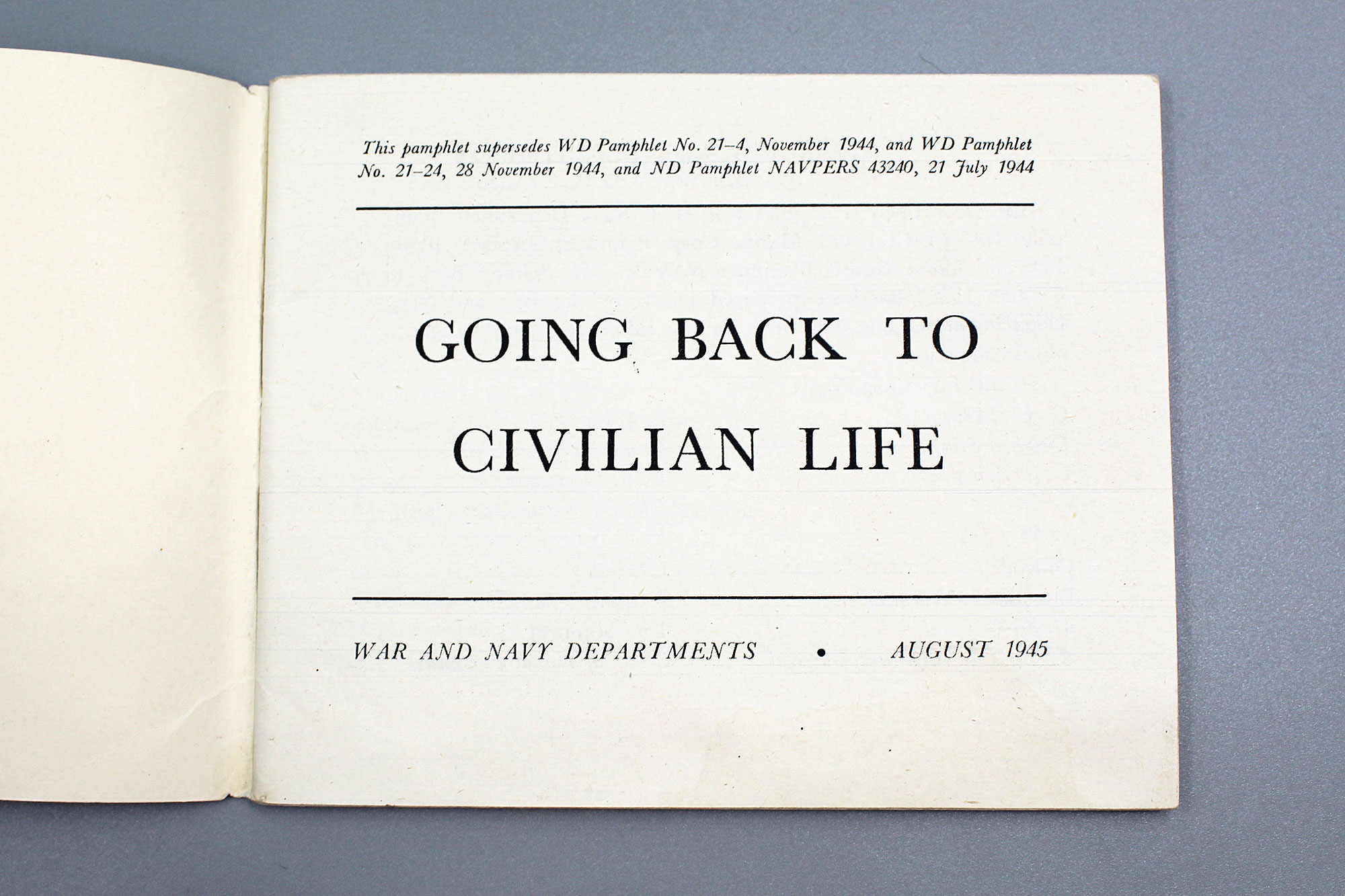 U.S. Military “Going Back to Civilian Life” book. War and Navy Department August 1945. Size approximately 5 1/2 inches x 4 1/4 inches. Worn and used condition.