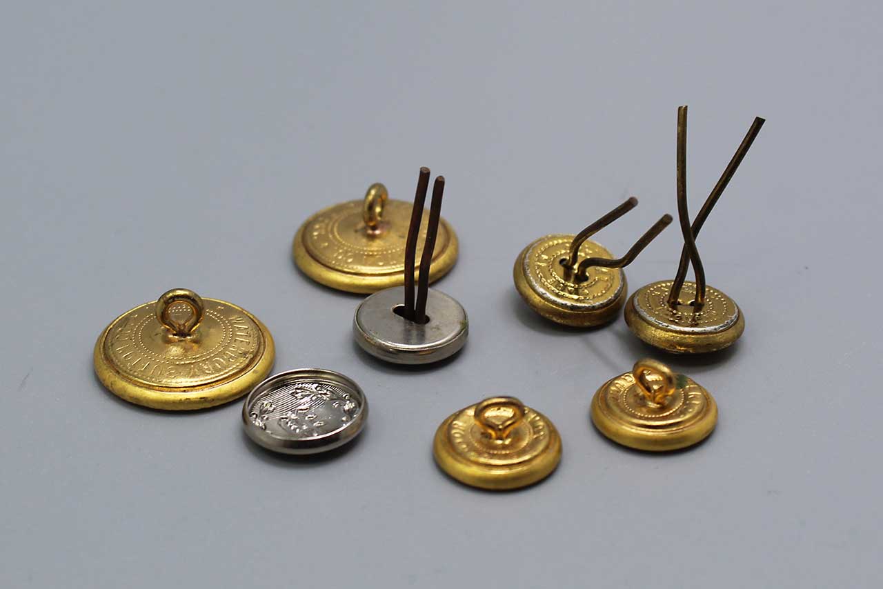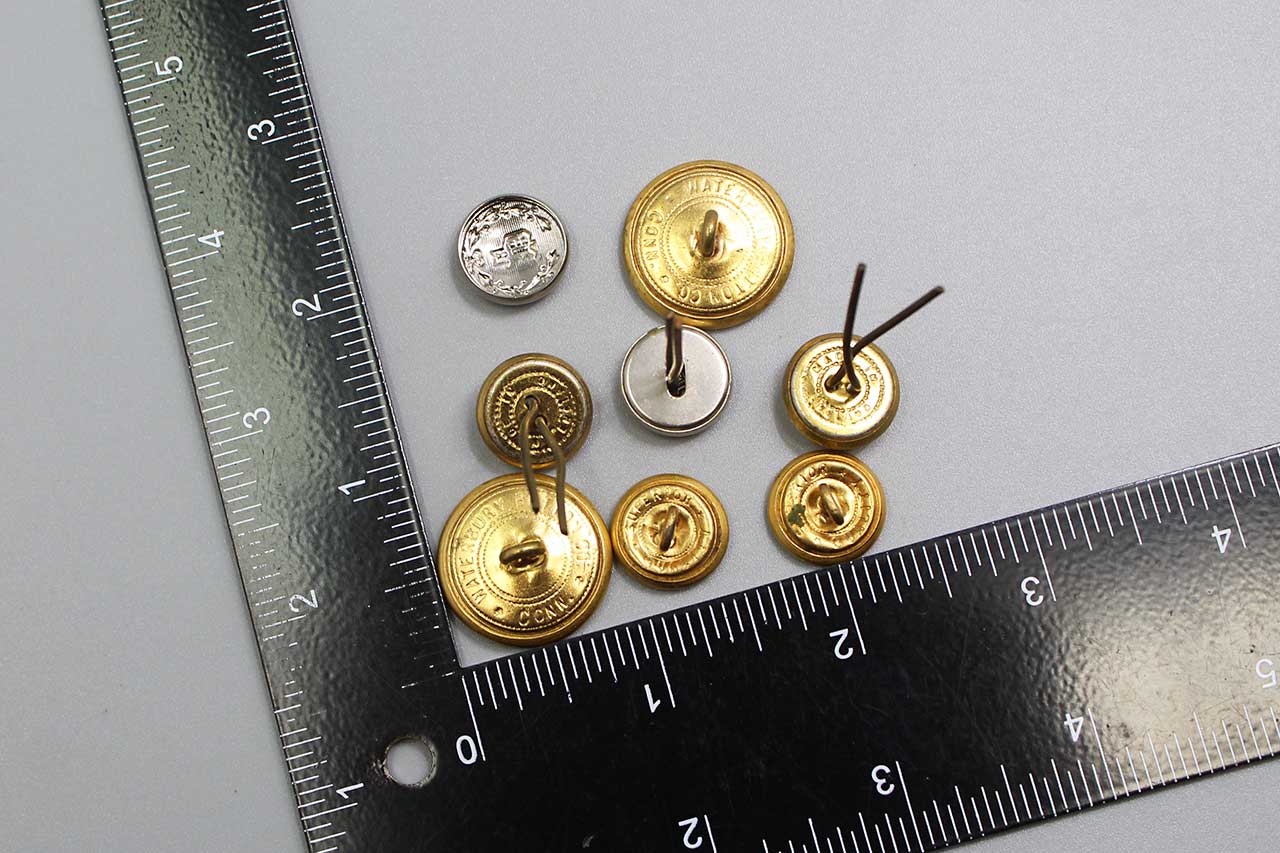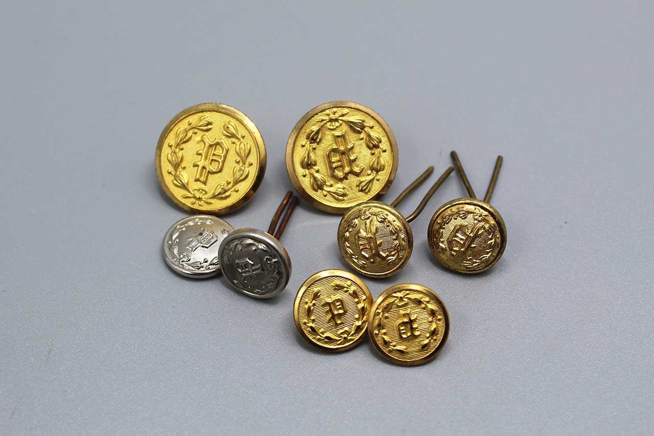Group of eight buttons. Miscellaneous sizes. They all have a “P” in center, maybe some type of Police buttons. Most likely 1940s-1960s era. Missing back on one of the buttons. Worn condition.
