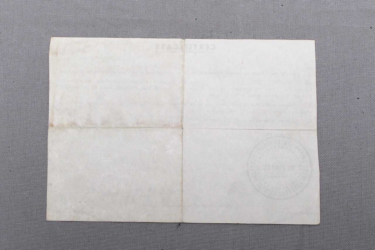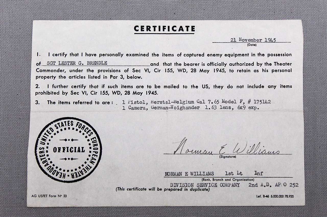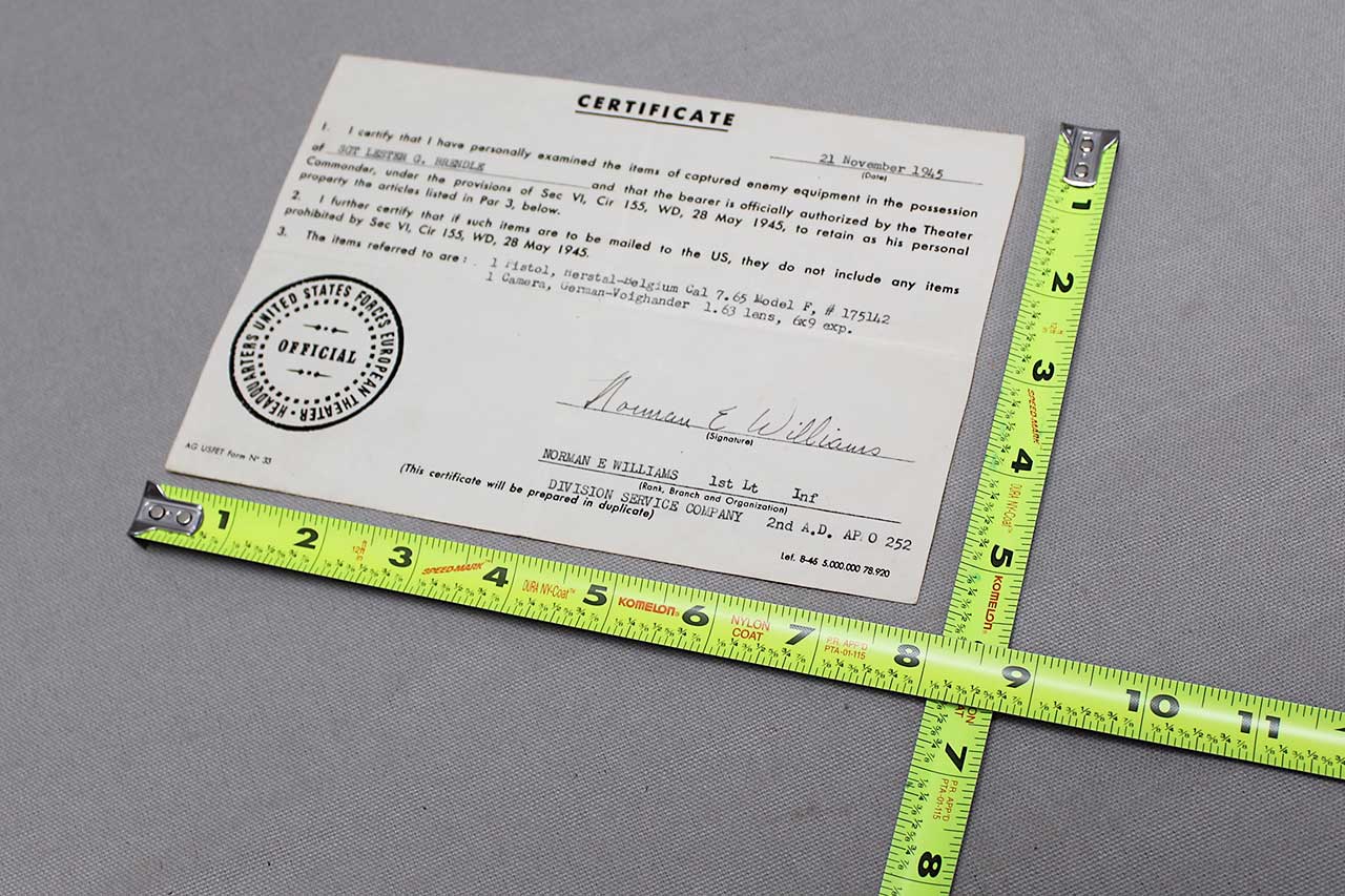 United States WW2 Military War Trophies Certificate dated 21 November 1945. Filled out to bring back a Pistol and Camera. Size approximately 7 3/4 inches x 5 1/2 inches. Worn condition.