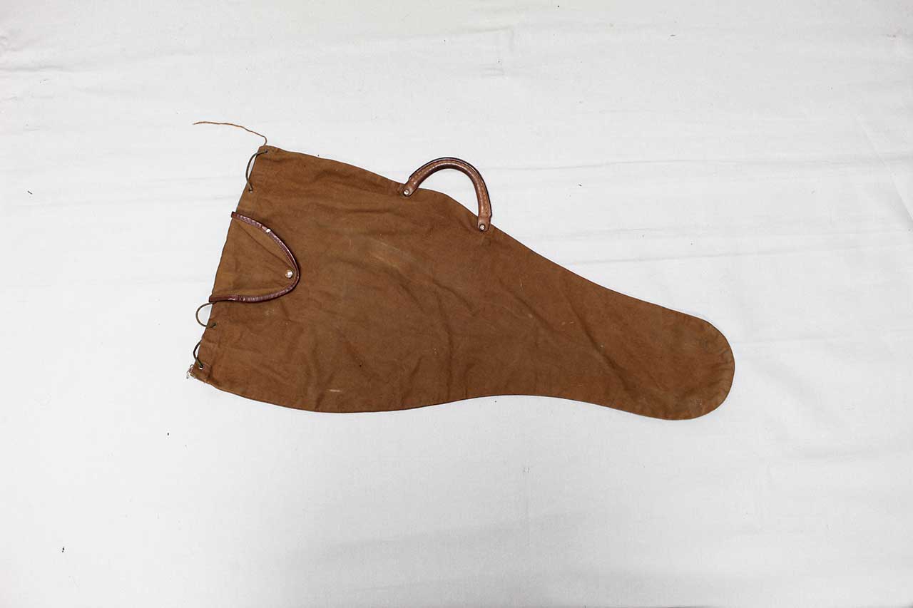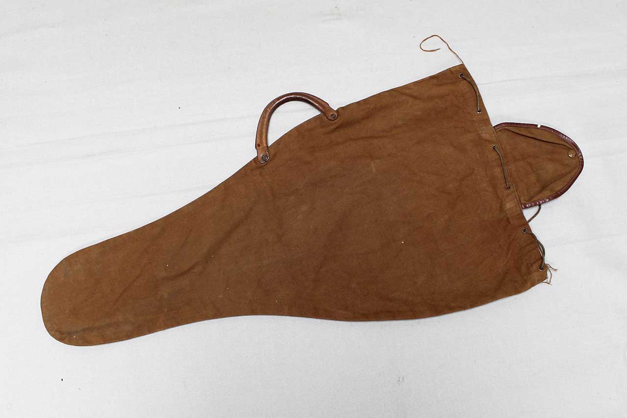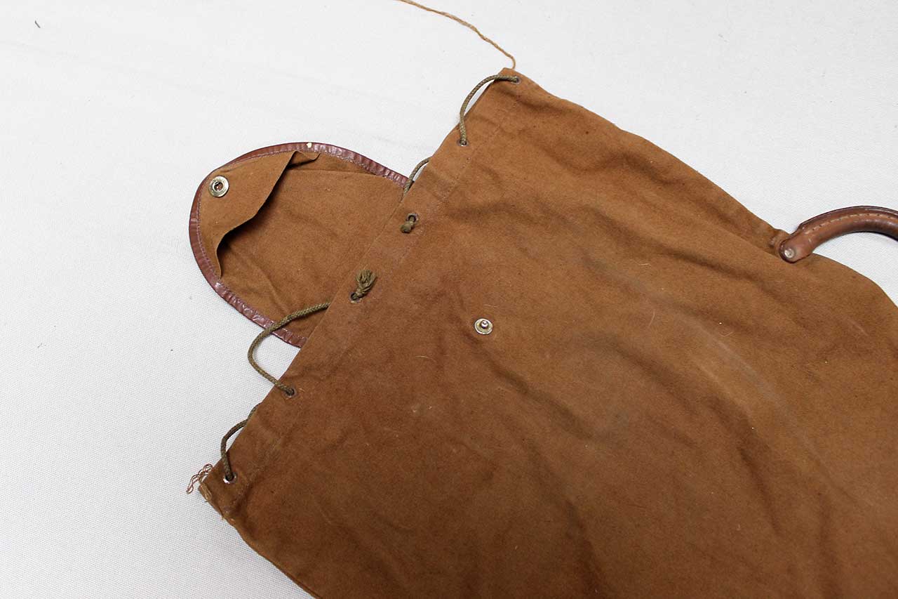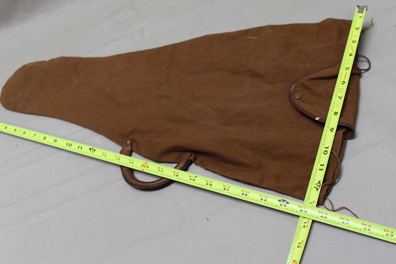 United States Cloth Carry Bag with Leather Handle. Draw type string and small flap with snap closure. Not sure what this was used for (maybe some type of weapon) or what time period. No contract tags or printed details I could find. Size approximately 25 inches x 13 inches at widest point. Appears to be fairly old, most likely 1940s-1960s era maybe. Worn condition.