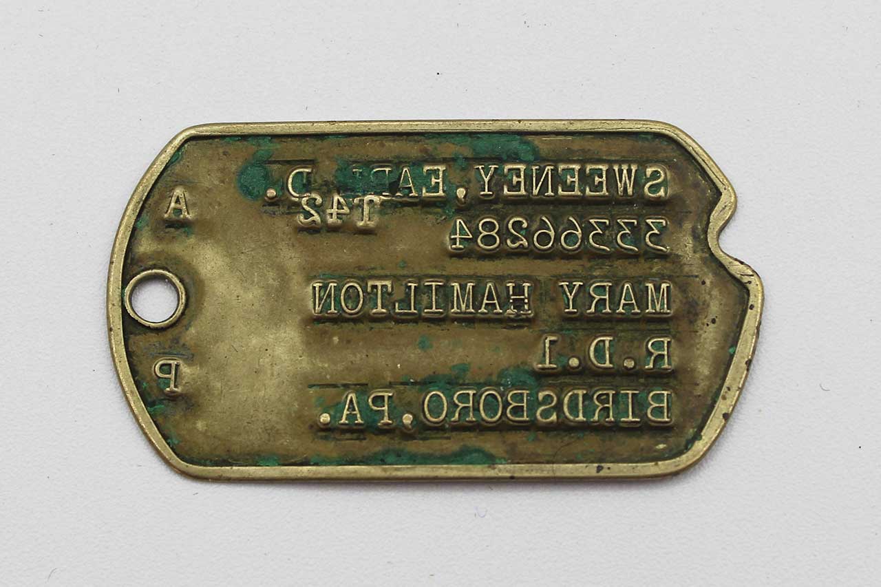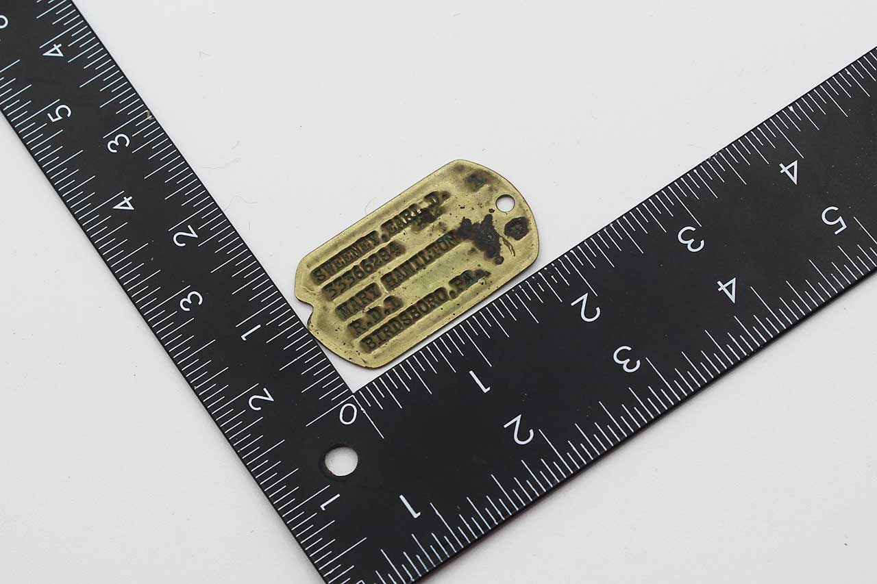 United States Army Single Id Tag “Dog Tag”. This is the NoK (Next of Kin) ww2 version. Address of NoK tag is from Birdsboro, PA. The face of the id tag includes the individual’s name, service number (33366284). The blood type “A”. Next of Kin (NoK) id tags were used early ww2 era. Worn condition.