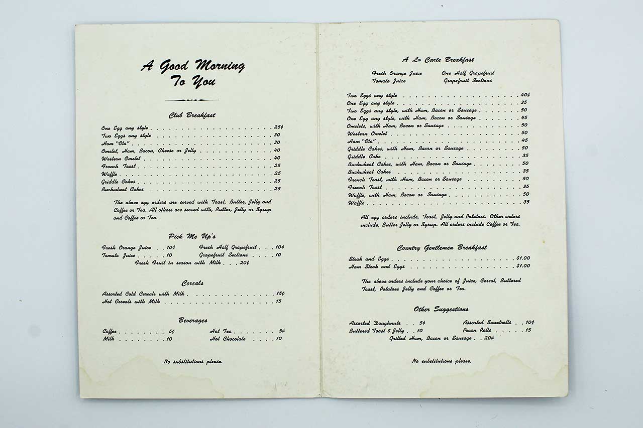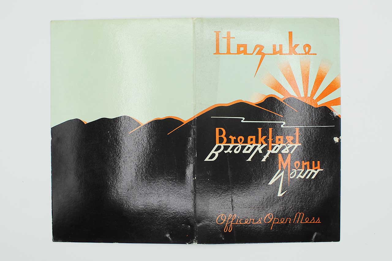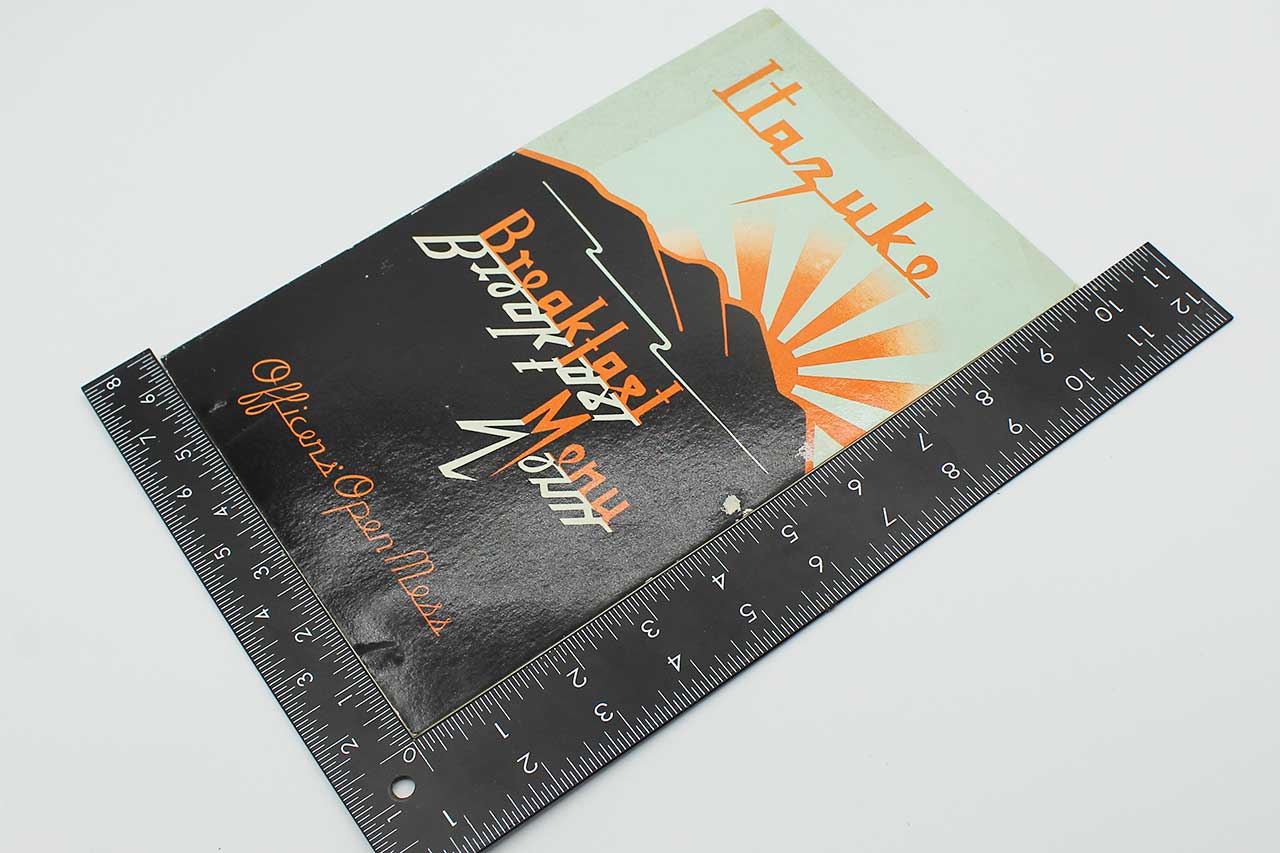 United States Officers’ Open Mess Breakfast Menu Itazuke Air Base. Appear to be mostly from 1950s-1960s era. Size approximately 6 1/4 inches x 10 inches. Worn condition.