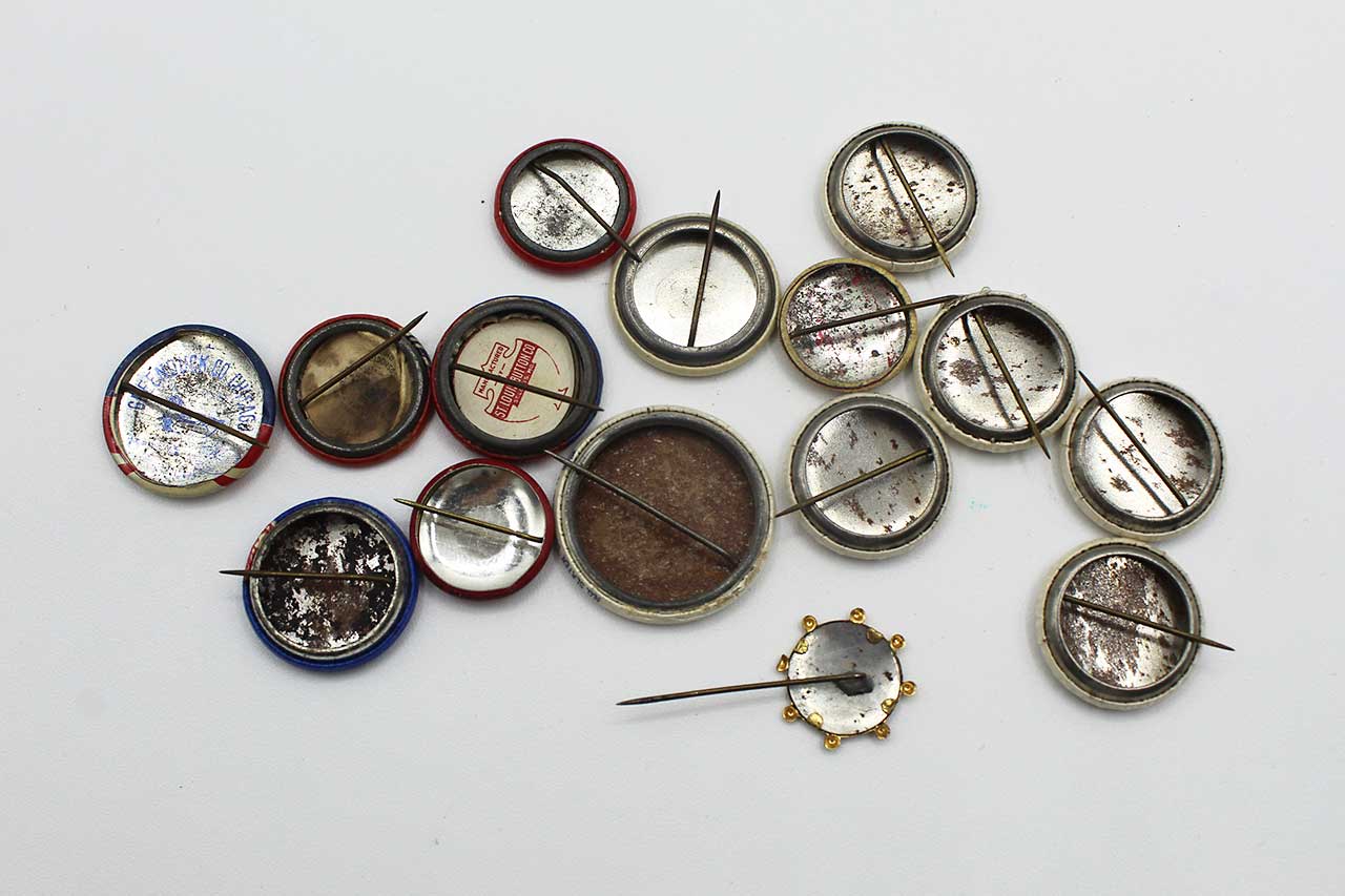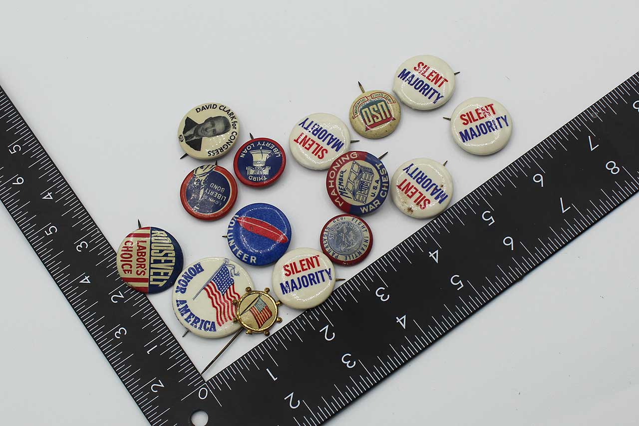 Group of 15 Patriotic and Political American Pins/Buttons. Price is for the whole group of pins pictured. Appears most from 1940s-1970s era. Worn condition.