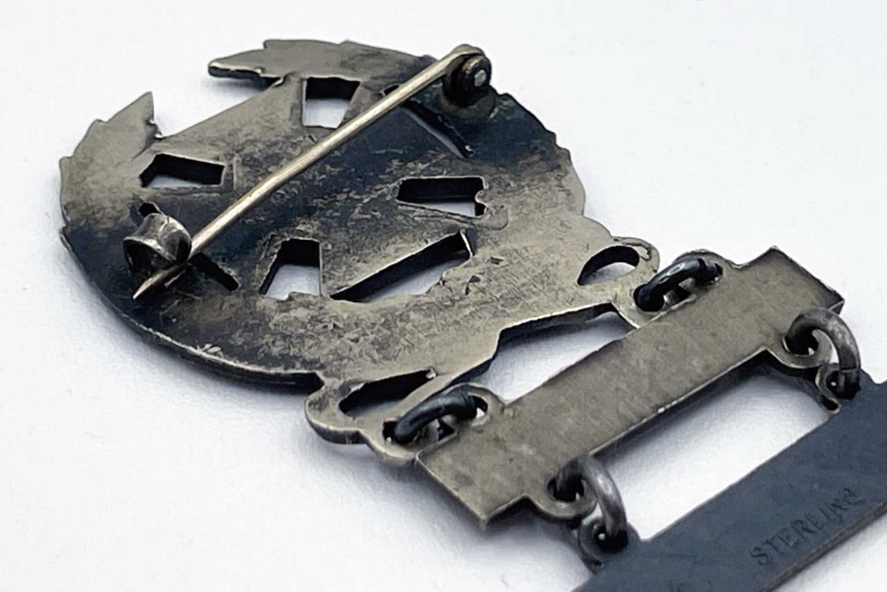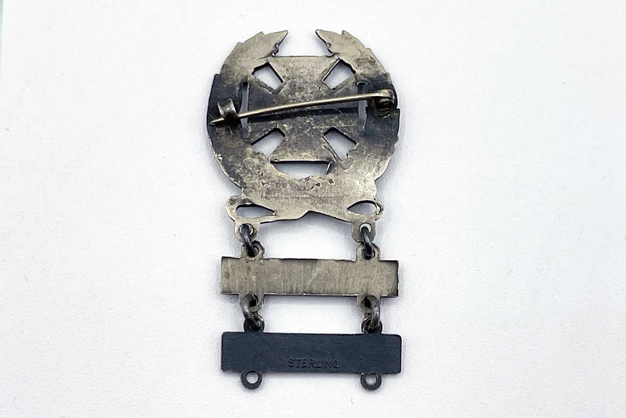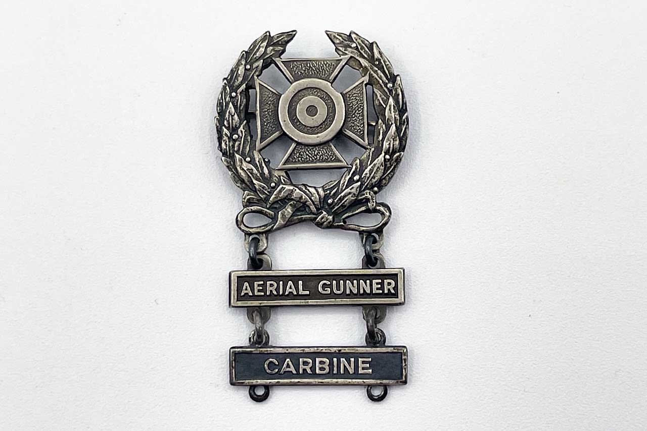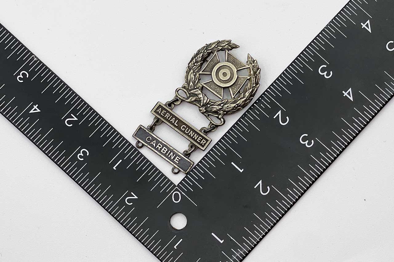 United States Army Expert Qualification Badge with two bars. Bars are for: Aerial Gunner and Carbine. Pin back. Sterling marked only on one of the bars. Most likely 1940s-1960s era. Worn condition.