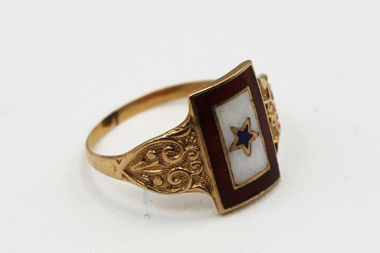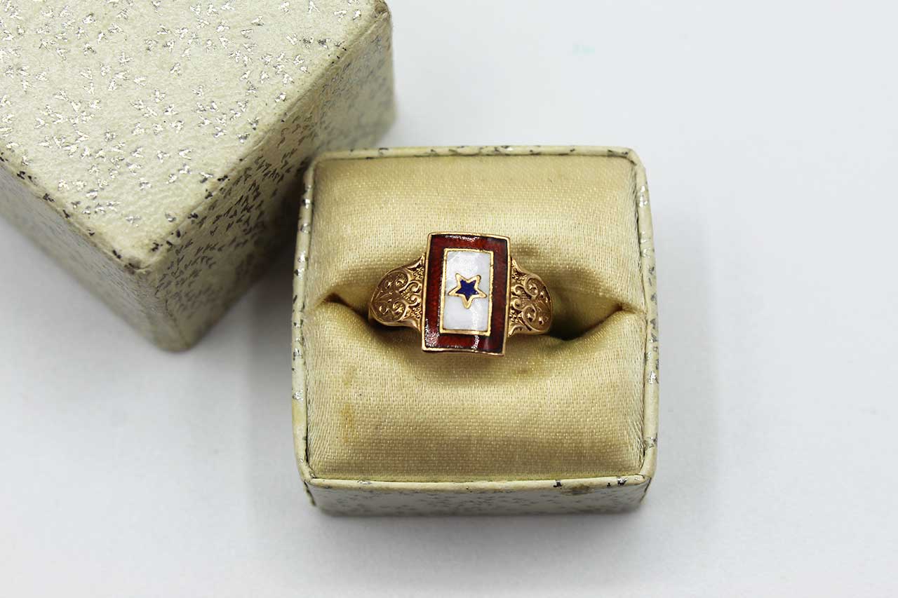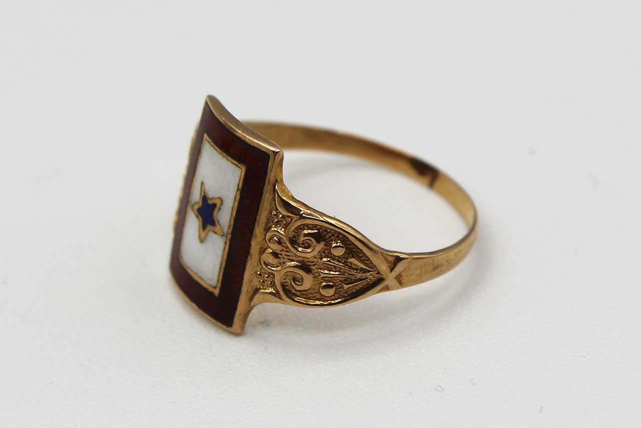 United States Homefront Blue Star Son-in-Service 10k Gold Ring in box. This one has 1 blue star for 1 son in service. Marked on back of ring: 10k. Appears to be a very small sized ring. Worn condition.