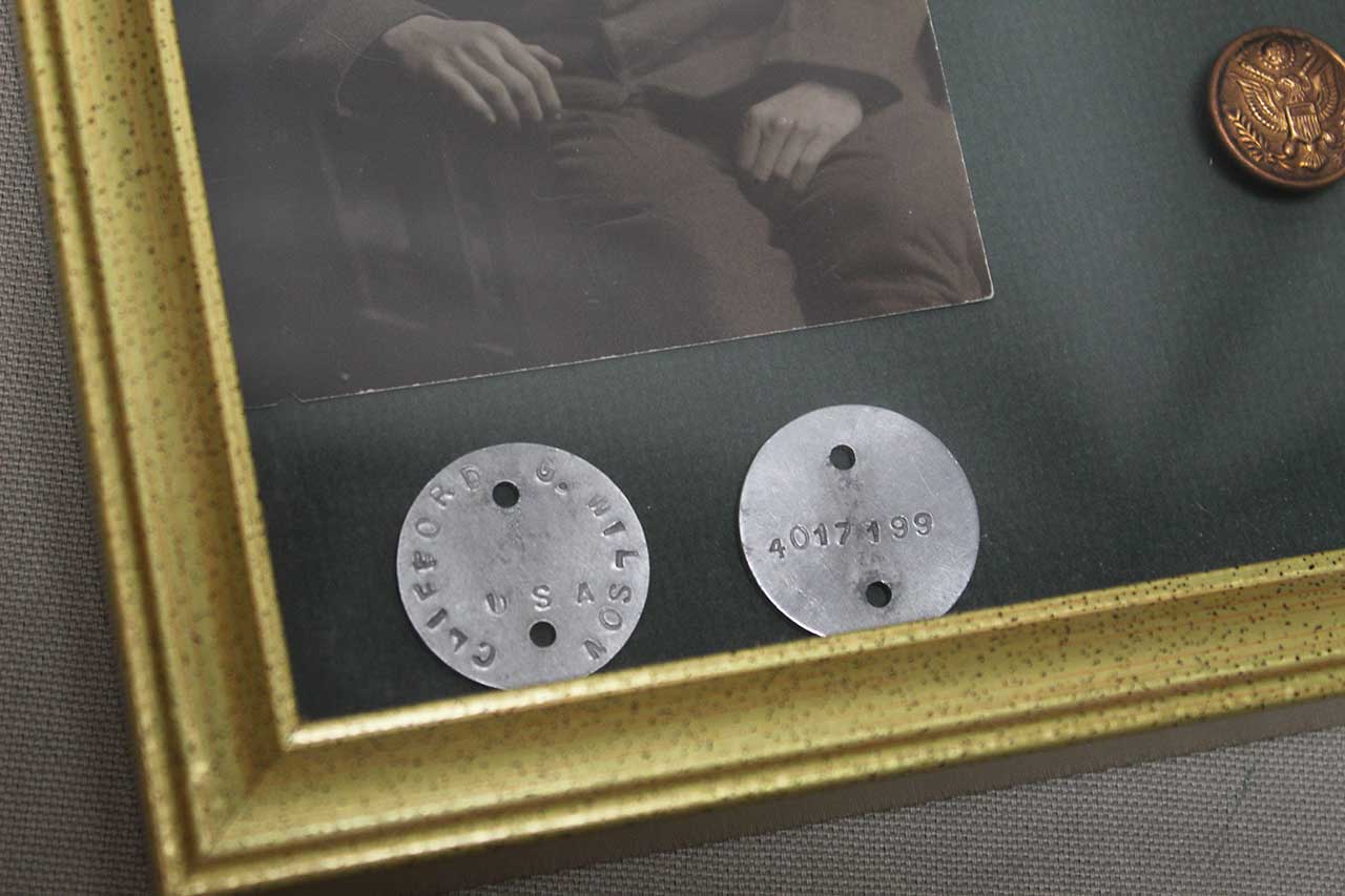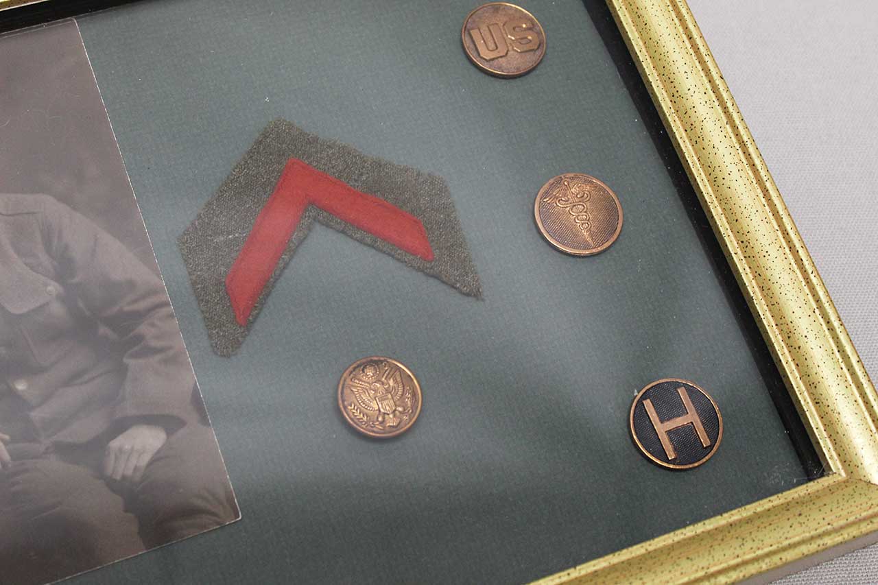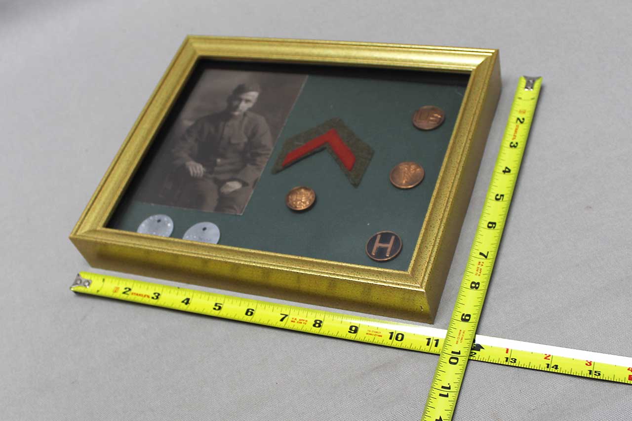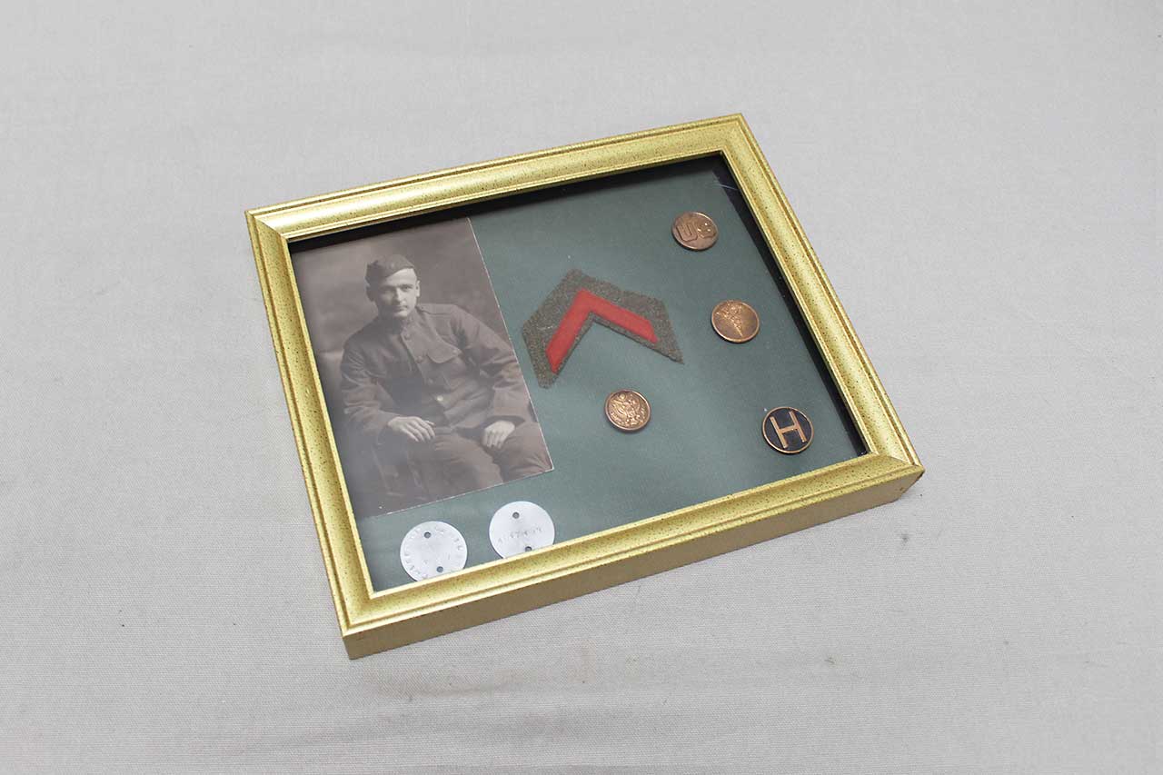 United States WW1 Framed Grouping. Framed items include Id Tags (Dog Tags) Collar Disks, Picture, and Discharge cloth insignia. Size of frame approximately 11 inches x 9 inches. Worn condition.