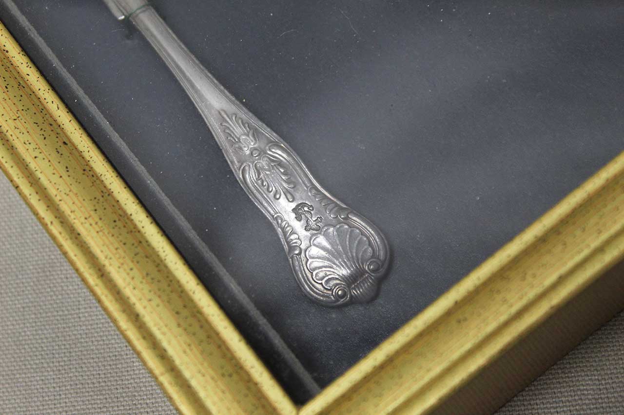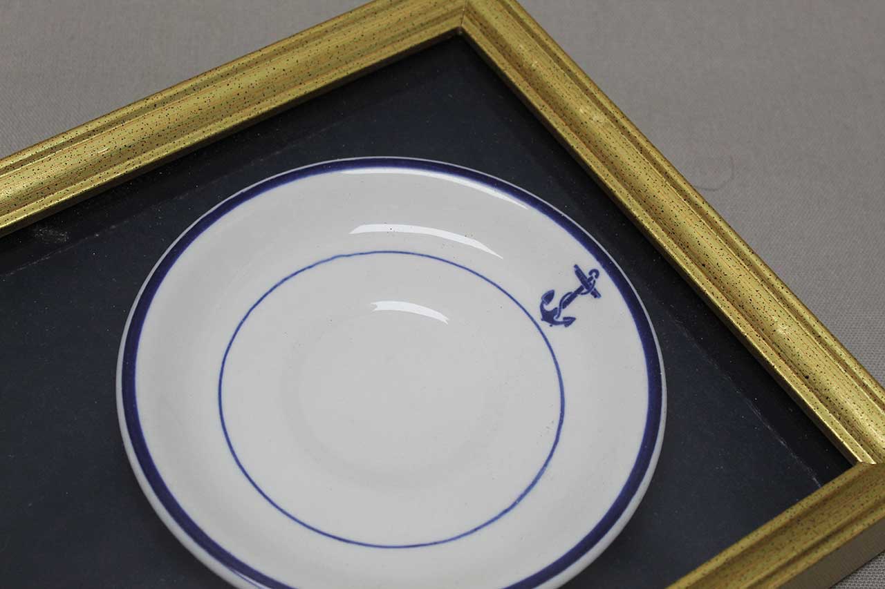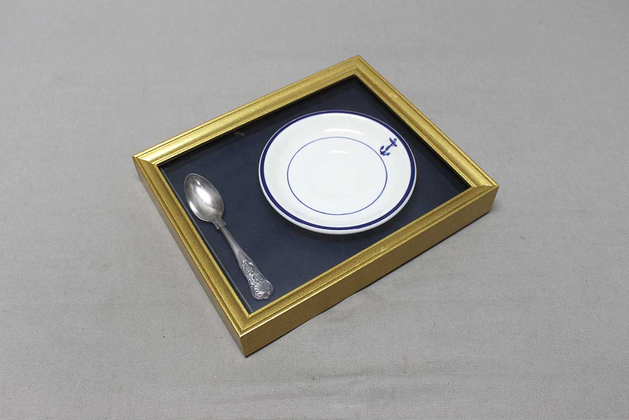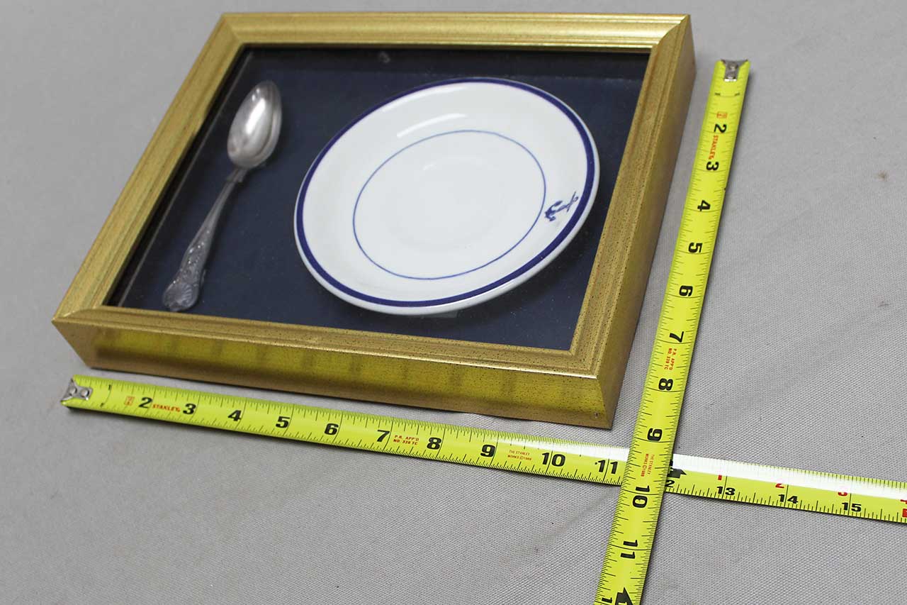 Framed United States Navy Plate and Spoon. Size of frame approximately 11 inches x 9 inches. Worn condition.