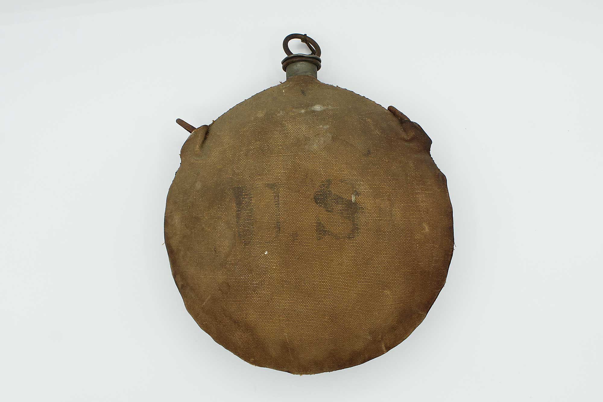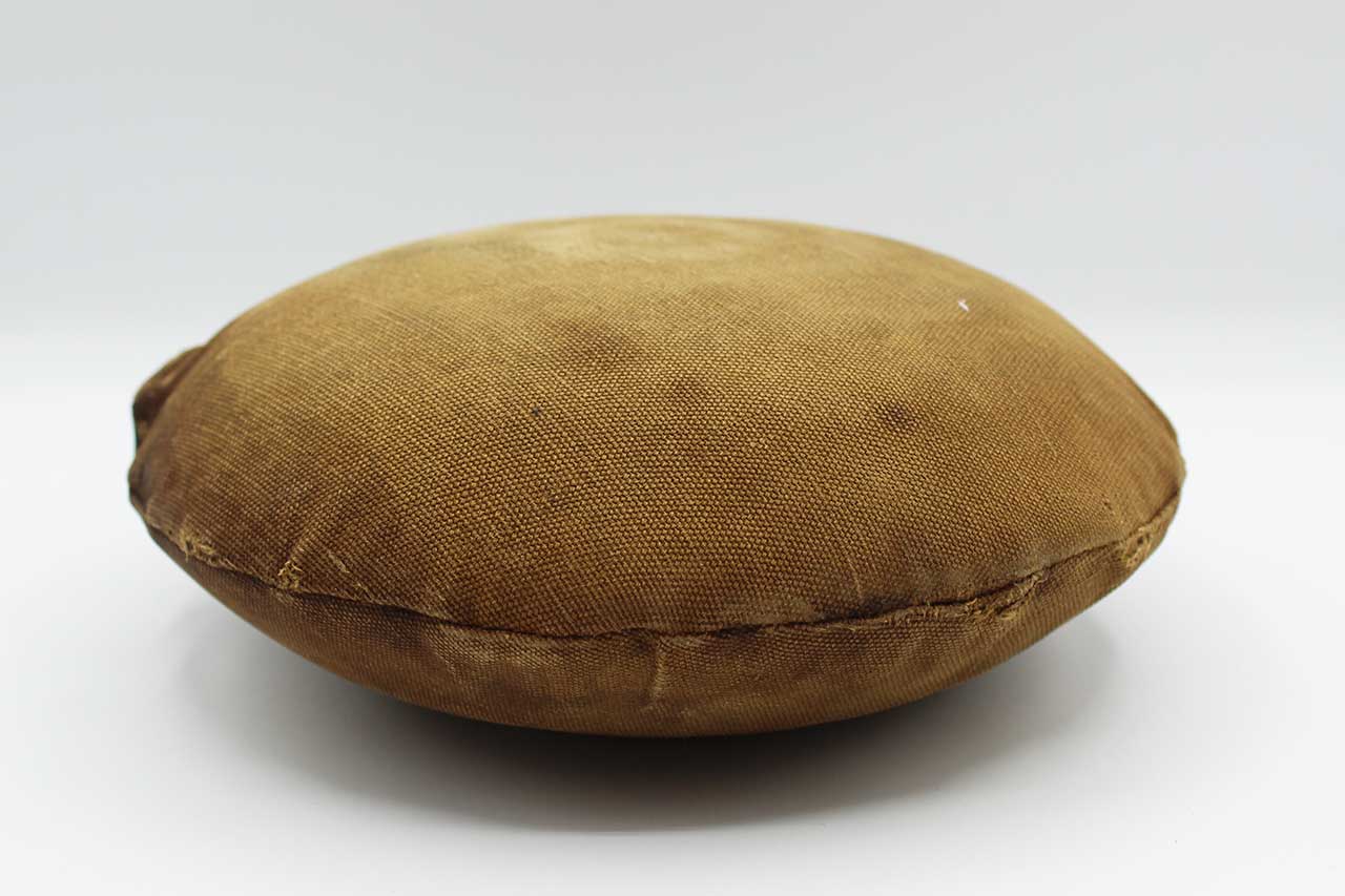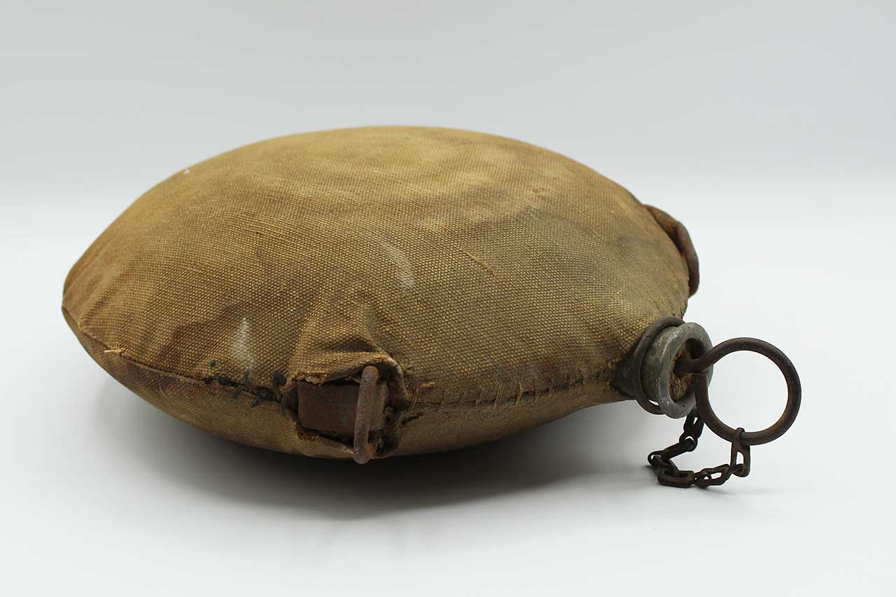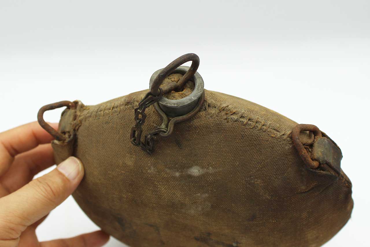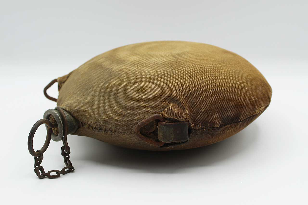 United States Spanish-American War Canteen. This canteen is the classic style known to collectors as the “Bullseye” pattern with the reinforcement rings on the sides. The canteen has two of the three of the original strap loops are still present, the bottom strap loop was removed for Spanish American War conversion and cover added during that time. This canteen also still has the cork topper piece still there as well. Heavily worn condition cover, you can make out some of the design of the bullseye pattern canteen below cover.