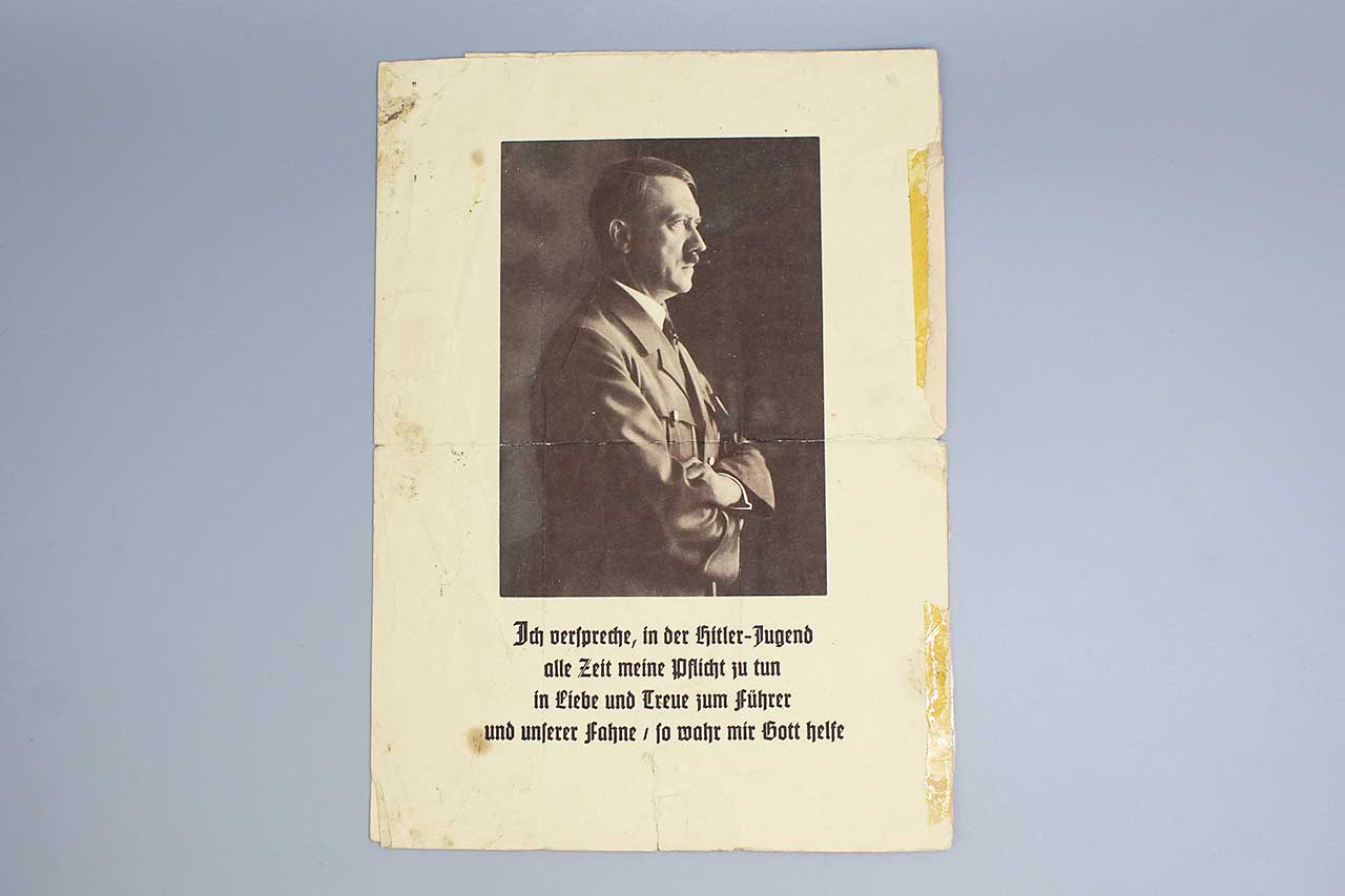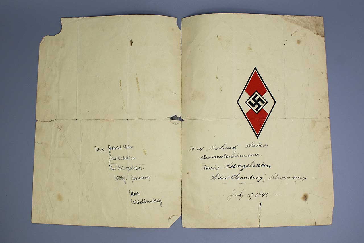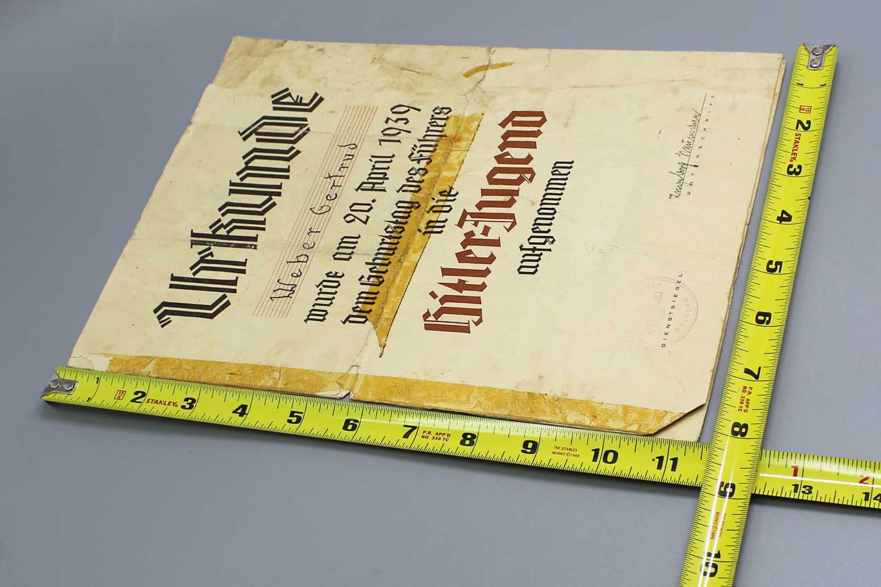 WW2 German HJ Certificate 1939. Made out to Weber Gertrud. Fold out type certificate with writing on interior. Size folded about 11 1/2 inches x 8 1/4 inches. Very heavily worn and damaged condition.