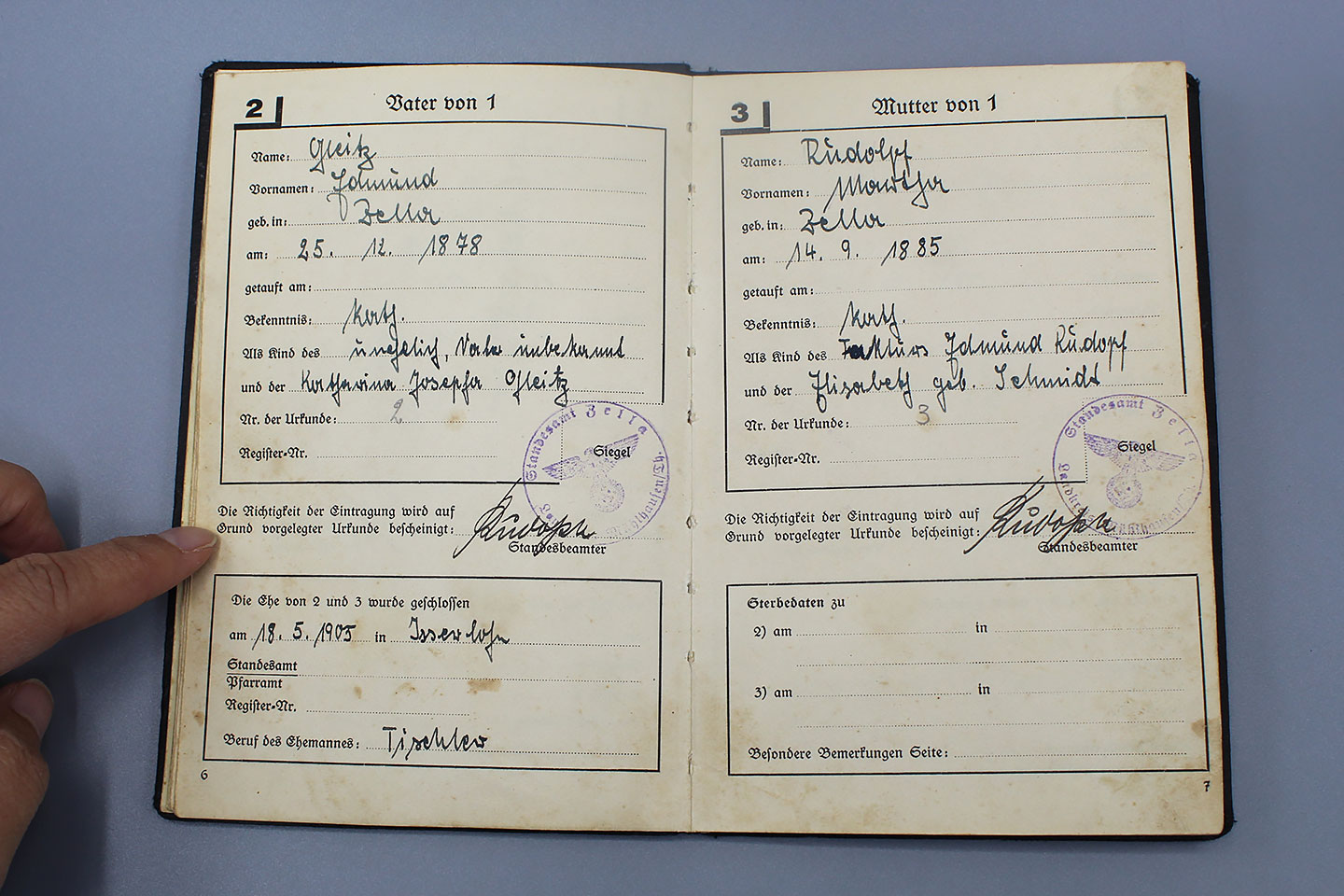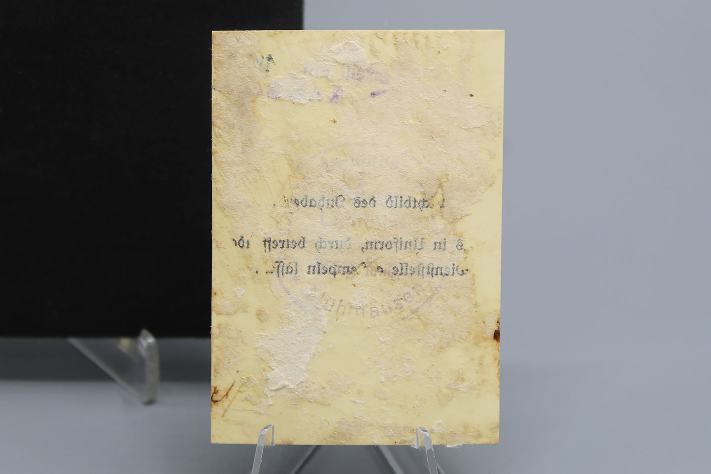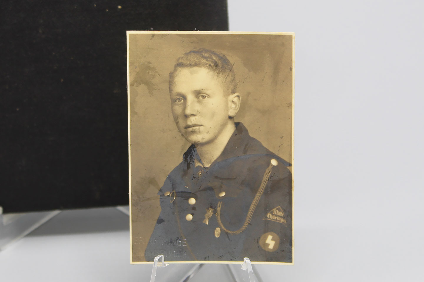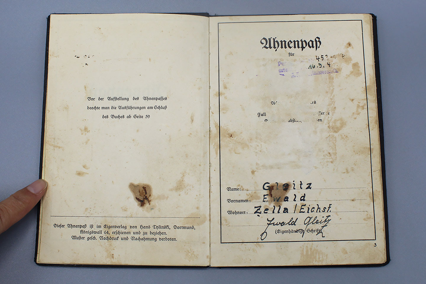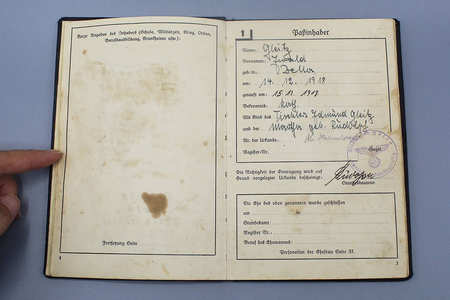 WW2 German Genealogical record book (Blood Line Record Book) done to prove decent, called an “Ahnenpass”. This book is to Ewald Gleitz. The book had a large official photo of him in his HJ uniform, which has come loose over the years, however, still included with book. After his service with the RAD in 1938, he joined the Panzer.Aufklabt.4 of the I.Pz.Div., renamed Kradsch.Btl.1 (Pp.nr.17586). He was killed-in-action 28-11-42 in Russia. He took a bullet hit to the head while leading his platoon during an attack against Russian positions. He won the Iron Cross, the Tank Battle Badge, and the Russian Campaign Medal.