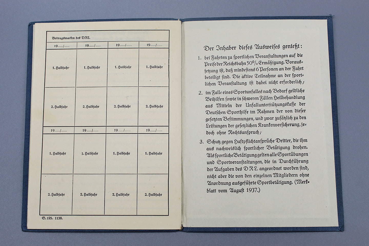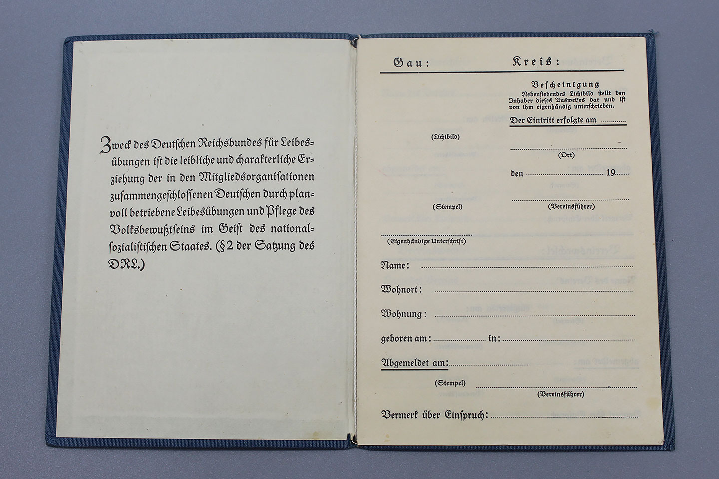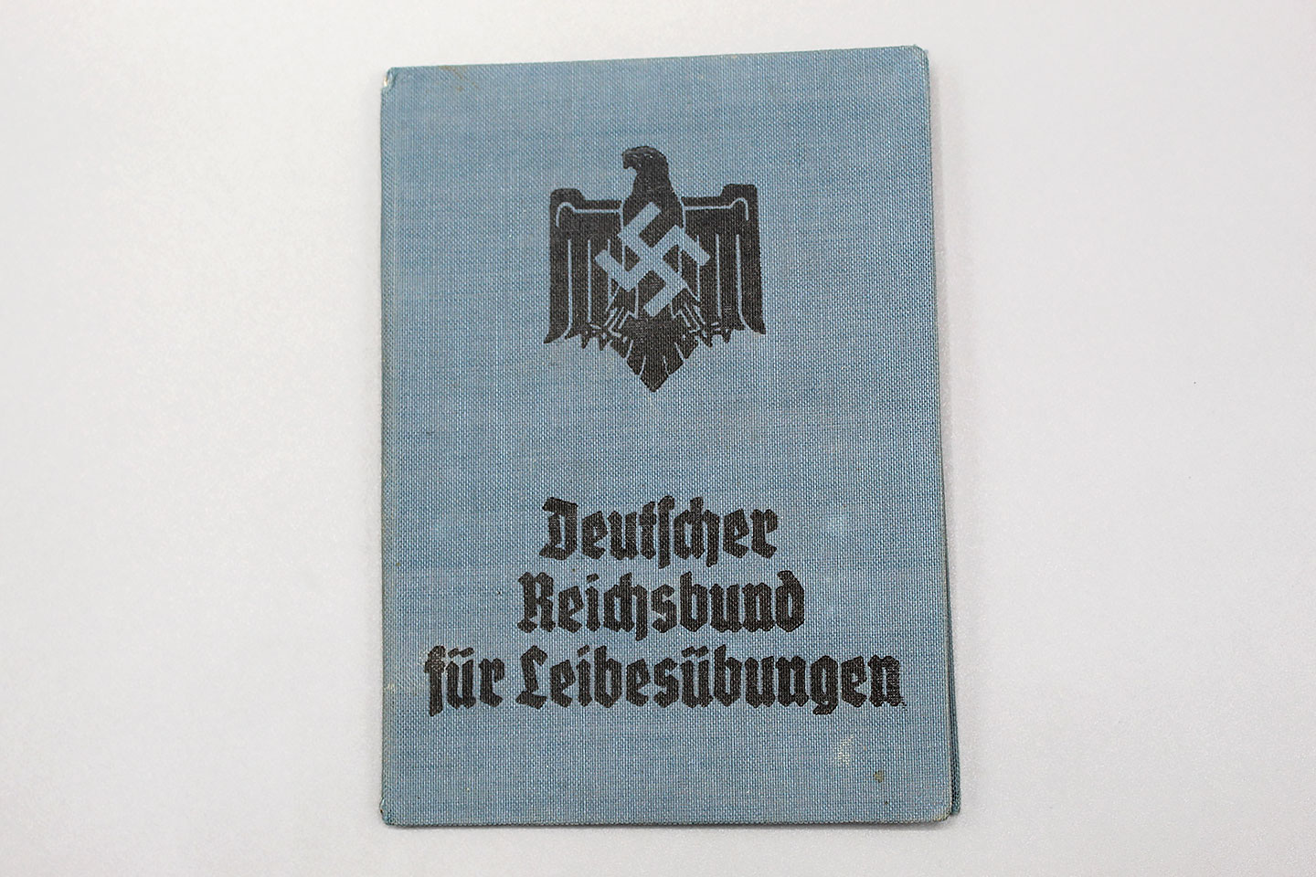 WW2 German DRL Identification and Contribution Booklet. Wording on front of book: Deuscher Reichsbund fur Leibesubungen (German National Organization for Physical Education). Booklet is blank and not filled out.
