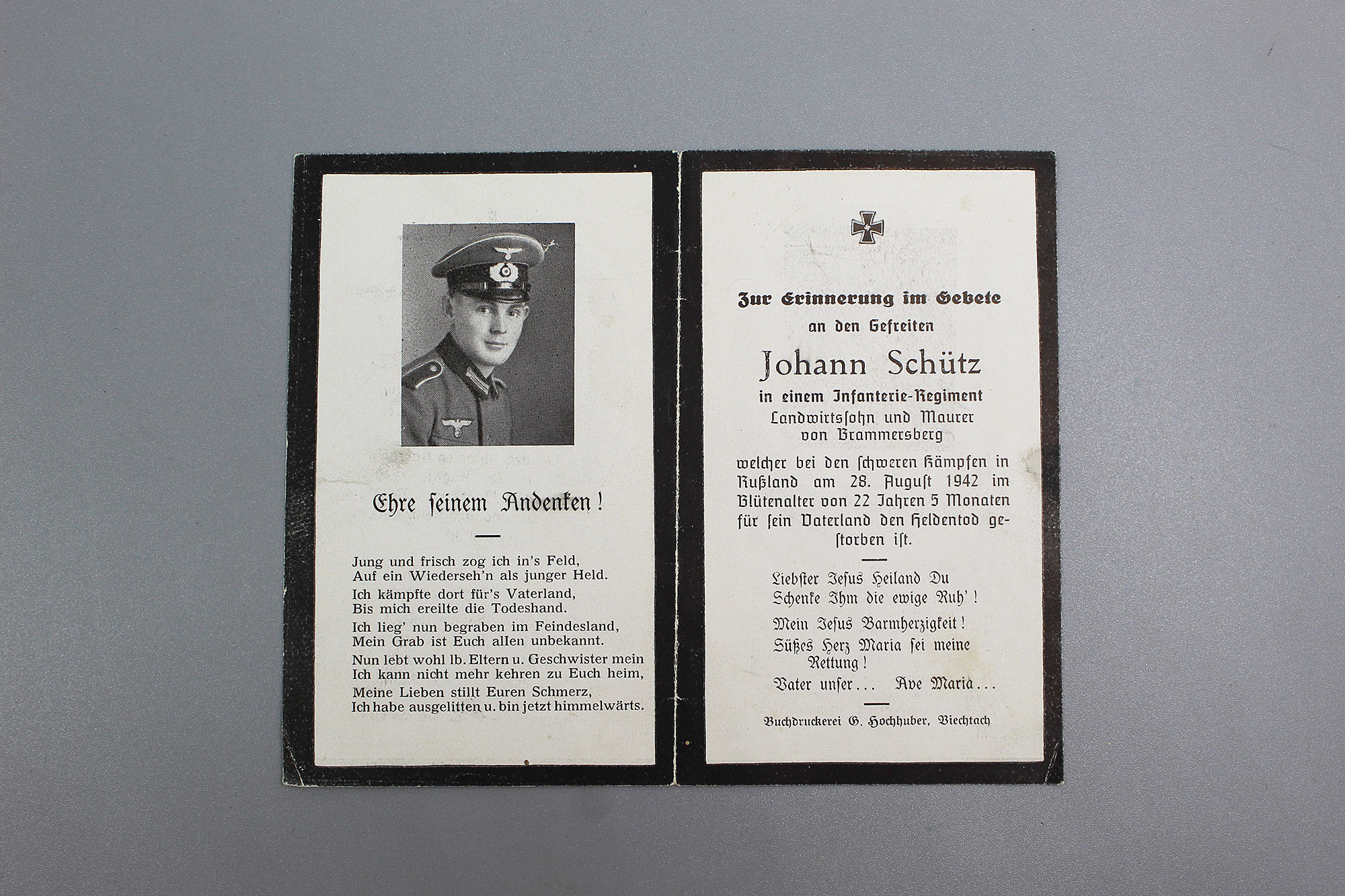 WW2 German Army Remembrance (Memorial) Card. Johann Schutz. Size approximately 5 3/8 inches x 4 3/8 inches. Very worn condition.