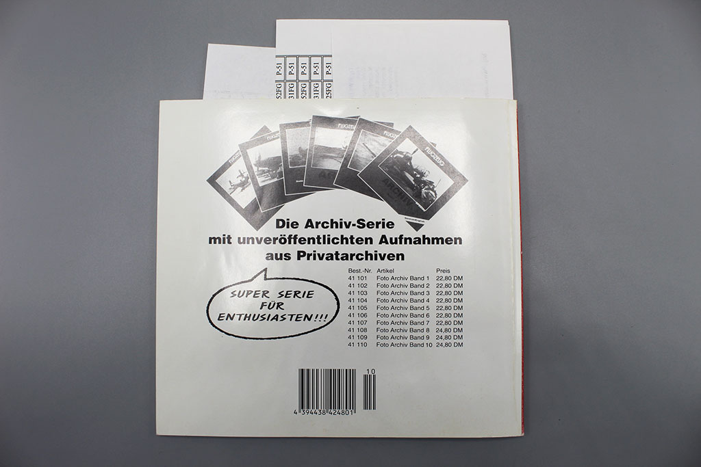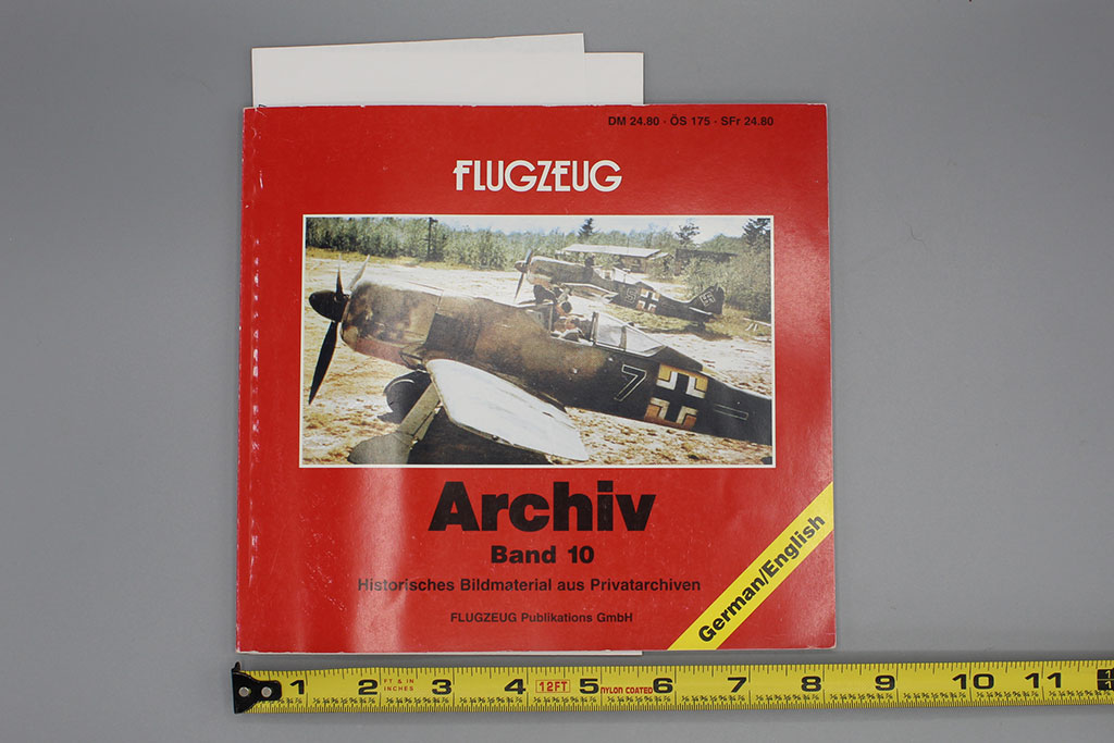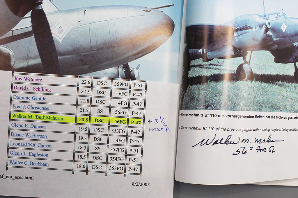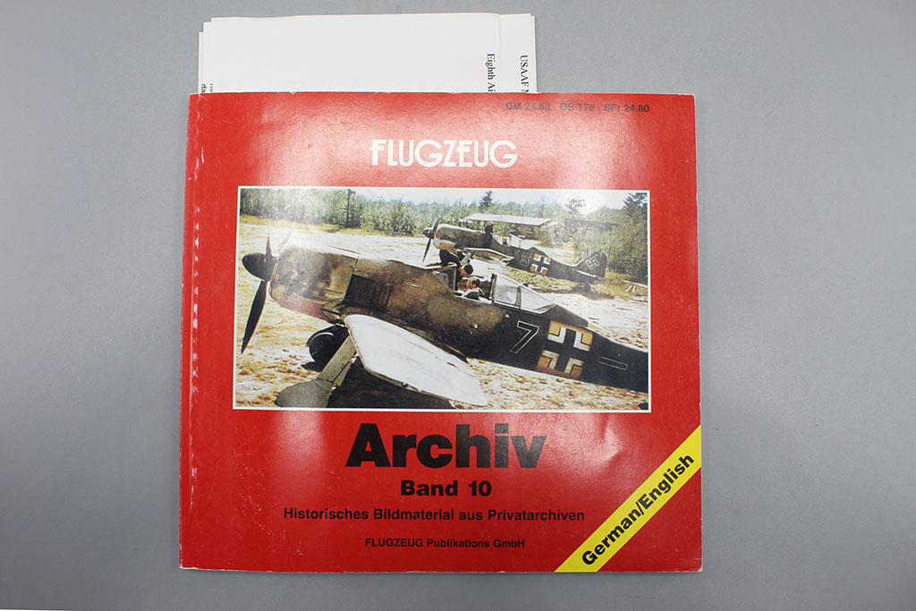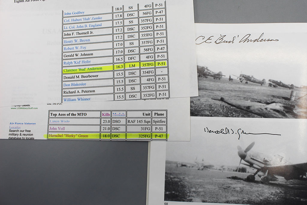 German book FLUGZEUG published 1999 with three U.S. Pilot signatures. Soft cover photo archive book has three signatures, one from P-51 pilot Clarence ‘Bud’ Anderson listed with 16.3 Kills, P-47 pilot Hershel “Herky” Green listed with 18.0 Kills., and P-47 Pilot Walker M. ‘Bud’ Mahurin listed with 20.8 Kills with a hand written comment of 3 1/2 in Korea. Signatures from most likely conventions or re-unions. Average worn and used condition.