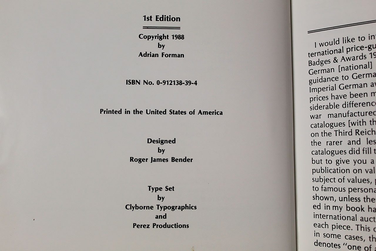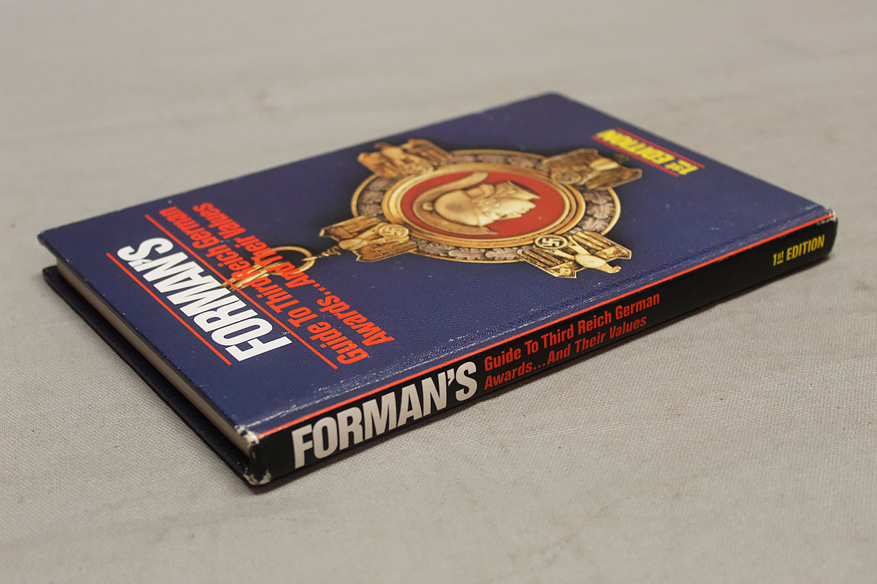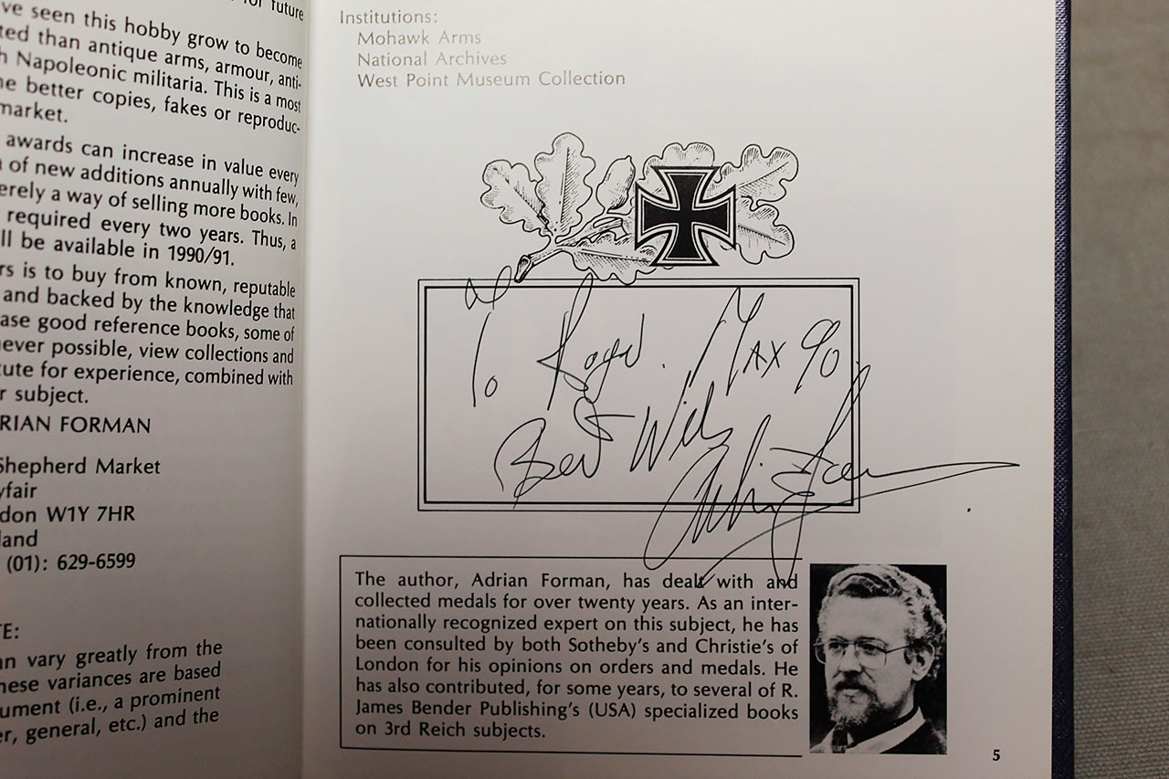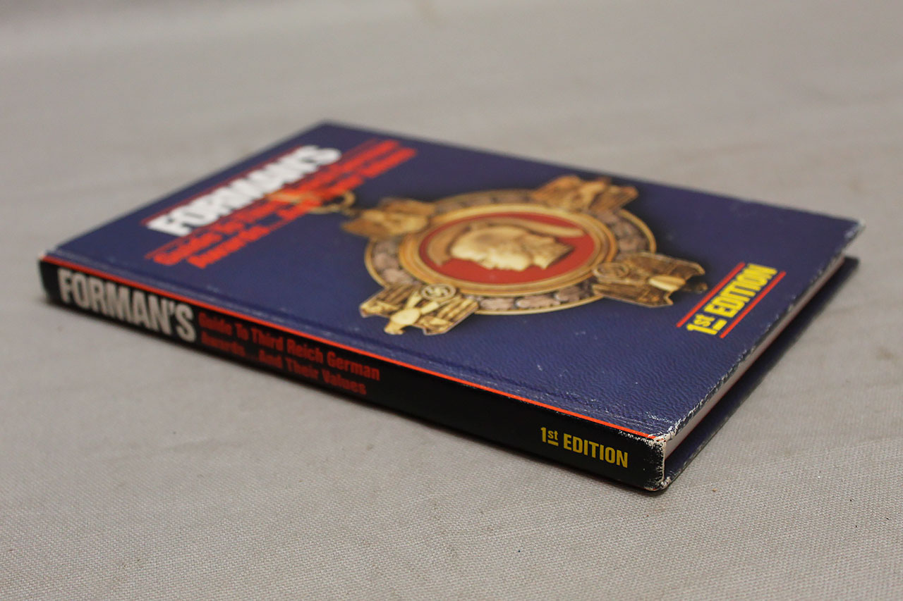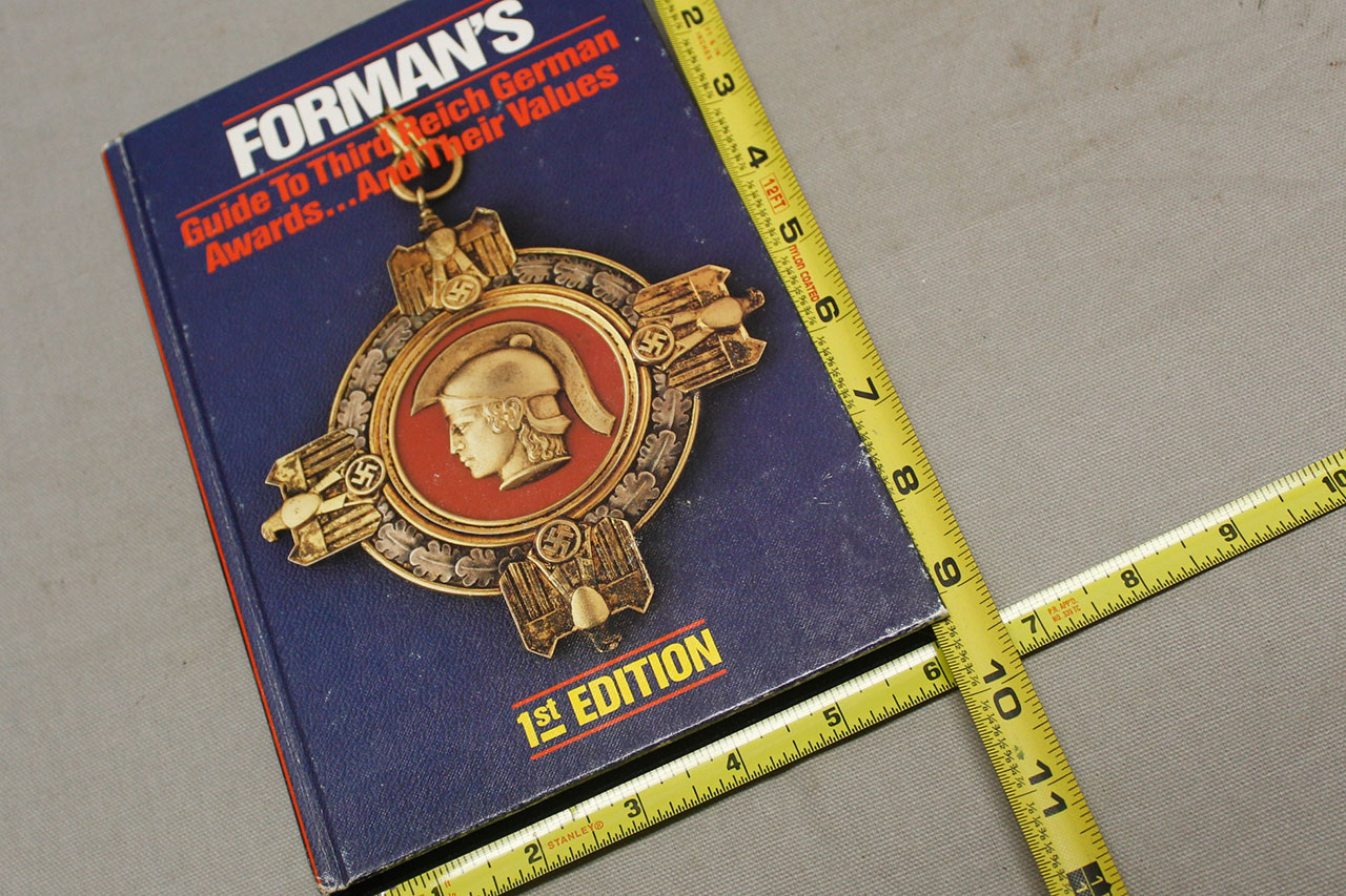 Reference book Foreman’s Guide to Third Reich German Awards and their values 1st Edition. Copyright 1988. Signed and dedicated copy. Size approx 9 1/2 inches X 6 inches. Worn and used condition.