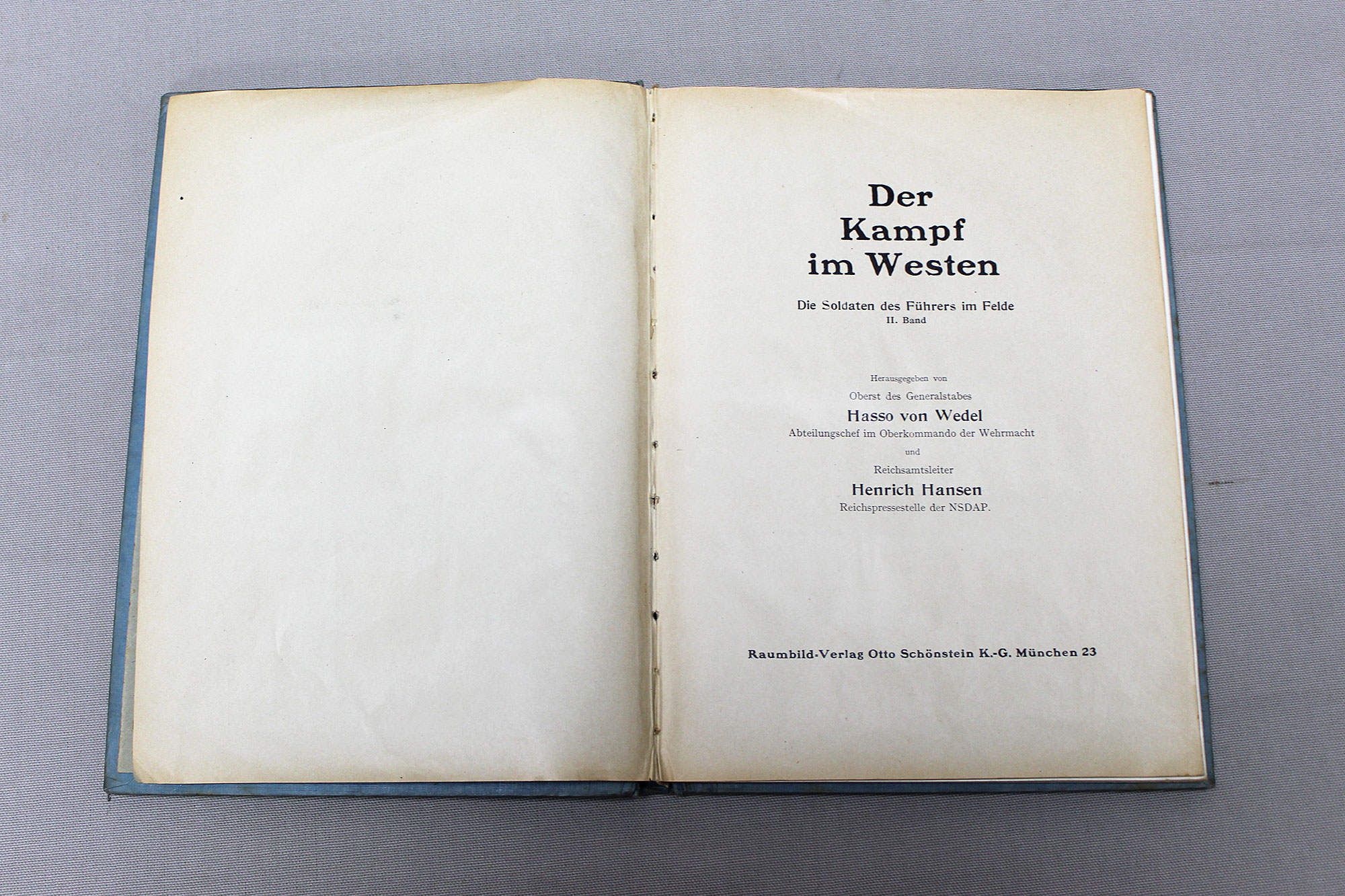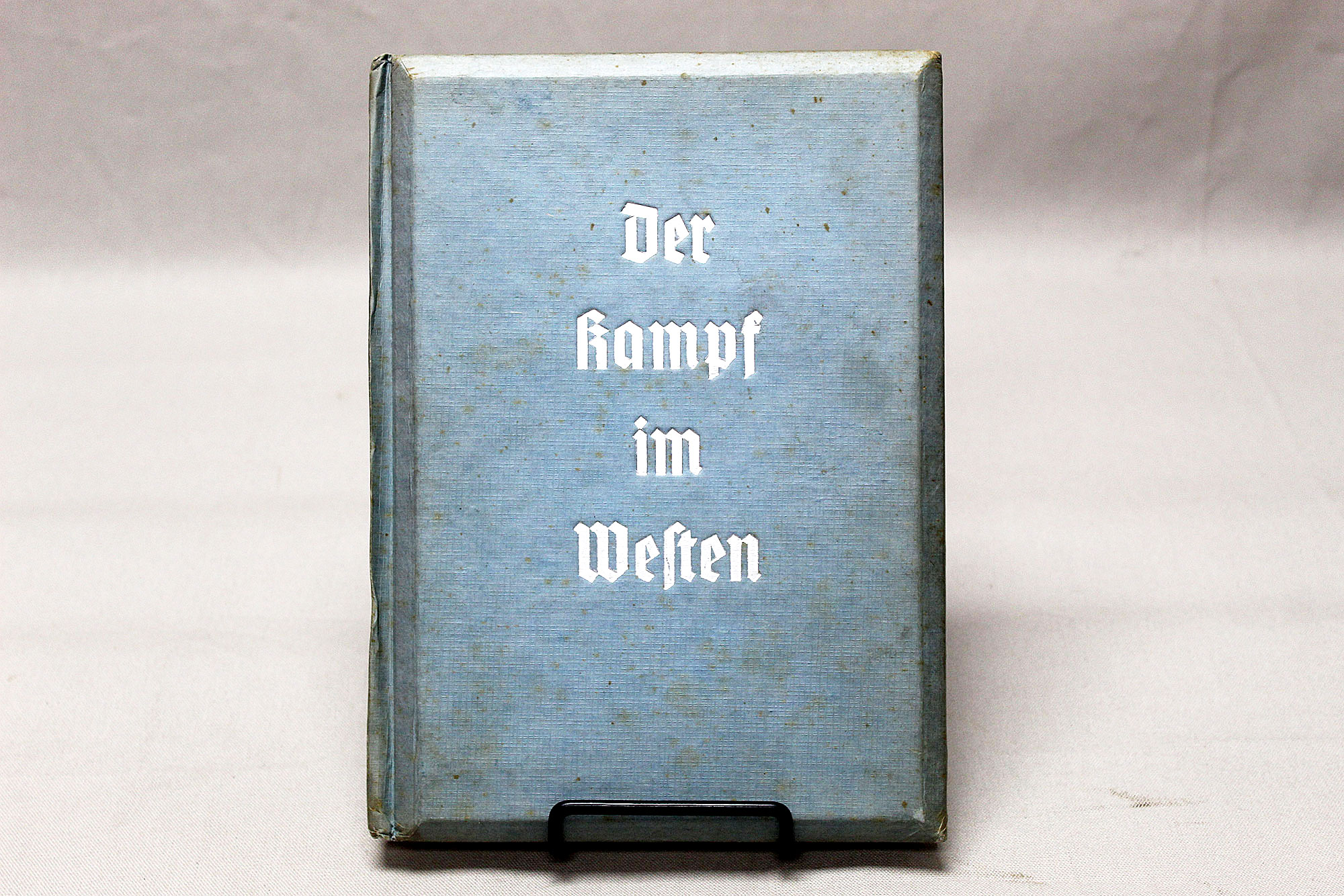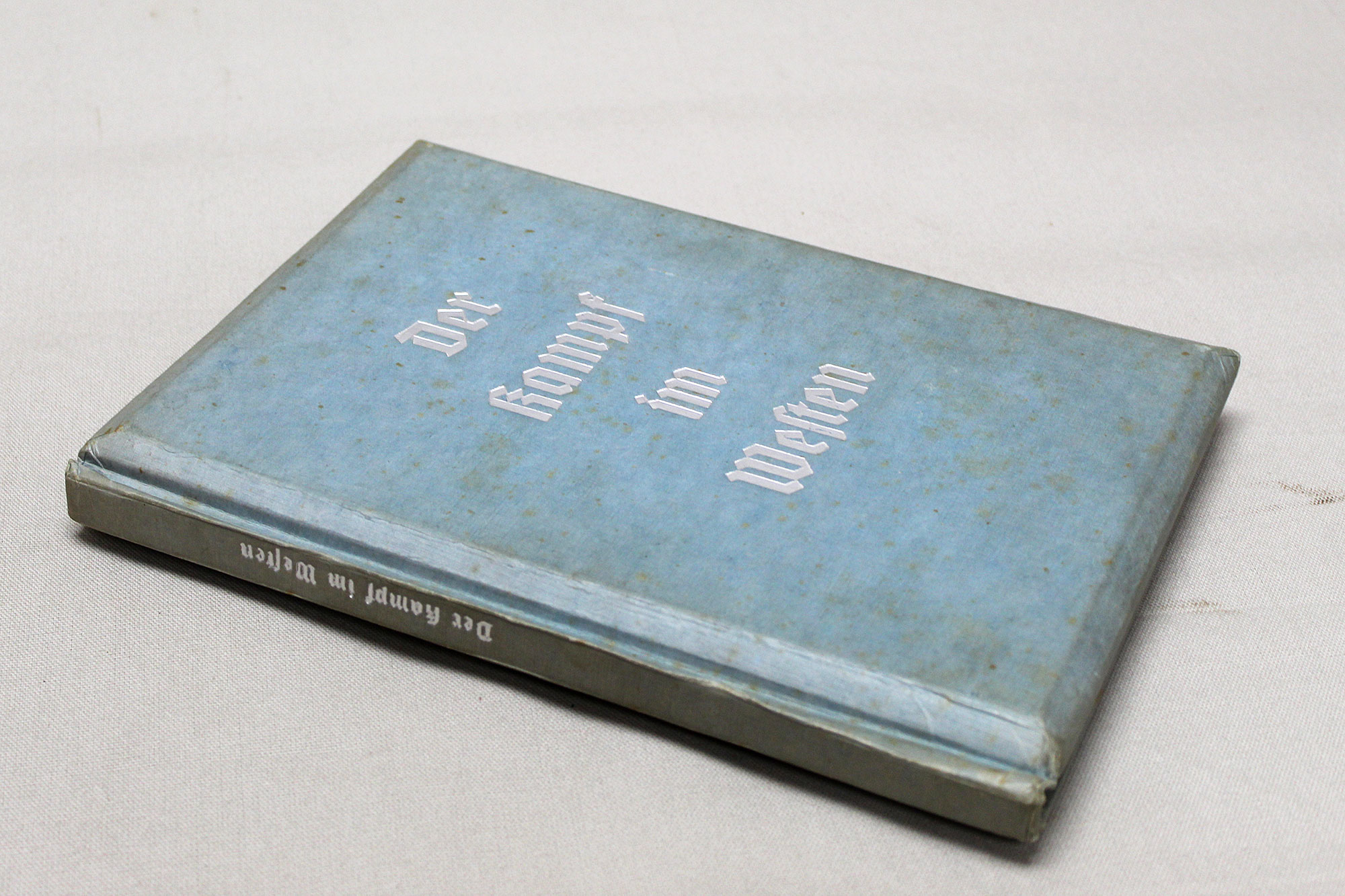 WW2 German Der Kampf im Westen Stereo View Book. This book is a pictorial reference printed in 1940, it does feature some marks, stains, and wear due to the age, however, is in otherwise decent used and worn condition. Approximately 77 pages, the binding is worn, however decent shape and the book has a beveled, fabric-covered wood construction. Comes with original contents: approximately 100 Stereo-View Images and Stereo-View Glasses. Features inside storage compartments cut to size to store the photos and stereo viewer. The photos both inside the book, as well as the stereo-view images depict what was the daily life of the men and machines of the Army. Some wear, staining and marks due to the age.